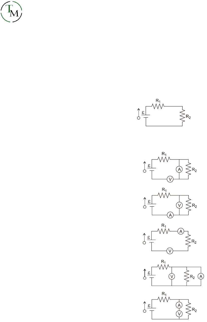 TEOREMA MILITAR LISTA 8 - MEDIDIORES ELÉTRICOS PROF. IGOR FERREIRA 1. (G1 - ifsul 2018) Os instrumentos de medidas elétricas que medem corrente elétrica, diferença de potencial elétrico e resistência elétrica são denominados, respectivamente, amperímetros, voltímetros e ohmímetros. Muitas vezes, eles são reunidos em um único aparelho, denominado multímetro, o qual tem uma chave que permite selecionar a função desejada. Em relação à forma correta que esses medidores devem ser associados com um resistor em um circuito elétrico, um amperímetro ideal, quando associado a) em série, mede a corrente elétrica que circula nesse resistor. b) em paralelo, mede a corrente elétrica que circula nesse resistor. c) em série, mede a diferença de potencial elétrico a que o resistor está submetido. d) em paralelo, mede a diferença de potencial elétrico a que o resistor está submetido. 2. (Uftm 2012) Assinale a alternativa que explica corretamente o funcionamento dos elementos componentes de um circuito elétrico. a) A resistência interna do amperímetro deve ser muito pequena, de forma a não interferir no valor da corrente a ser medida. b) Os fusíveis são elementos de proteção, pois não deixam passar qualquer corrente que os atinja. c) Os resistores são elementos muito utilizados para economizar energia elétrica, pois produzem energia térmica. d) A capacidade de geração de energia por uma bateria termina quando sua resistência interna diminui, esgotando-a. e) Os receptores de um circuito elétrico convertem toda a energia elétrica recebida em energia térmica. 3. (Espcex (Aman) 2013) O amperímetro é um instrumento utilizado para a medida de intensidade de corrente elétrica em um circuito constituído por geradores, receptores, resistores, etc. A maneira correta de conectar um amperímetro a um trecho do circuito no qual queremos determinar a intensidade da corrente é a) em série b) em paralelo c) na perpendicular d) em equivalente e) mista 4. (Ufrgs 2010) Voltímetros e amperímetros săo os instrumentos mais usuais para mediçőes elétricas. Evidentemente, para a obtençăo de medidas corretas, esses instrumentos devem ser conectados de maneira adequada. Além disso, podem ser danificados se forem conectados de forma incorreta ao circuito. Suponha que se deseja medir a diferença de potencial a que está submetido o resistor R2 do circuito a seguir, bem como a corrente elétrica que o percorre. Assinale a figura que representa a correta conexăo do voltímetro (V) e do amperímetro (A) ao circuito para a realizaçăo das medidas desejadas. a) b) c) d) e) TEOREMA MILITAR LISTA 3- CAMPO ELÉTRICO PROF. IGOR FERREIRA 5. (Enem PPL 2012) Um eletricista precisa medir a resistência elétrica de uma lâmpada. Ele dispõe de uma pilha, de uma lâmpada (L), de alguns fios e de dois aparelhos: um voltímetro (V), para medir a diferença de potencial entre dois pontos, e um amperímetro (A), para medir a corrente elétrica. O circuito elétrico montado pelo eletricista para medir essa resistência é a) b) c) d) e) 6. (Enem 2013) Um eletricista analisa o diagrama de uma instalação elétrica residencial para planejar medições de tensão e corrente em uma cozinha. Nesse ambiente existem uma geladeira (G), uma tomada (T) e uma lâmpada (L), conforme a figura. O eletricista deseja medir a tensão elétrica aplicada à geladeira, a corrente total e a corrente na lâmpada. Para isso, ele dispõe de um voltímetro (V) e dois amperímetros (A). Para realizar essas medidas, o esquema da ligação desses instrumentos está representado em: a) b) c) d) e) 7. (Upf 2015) Em uma aula no laboratório de Física, o professor solicita aos alunos que meçam o valor da resistência elétrica de um resistor utilizando um voltímetro ideal e um amperímetro ideal. Dos esquemas abaixo, que representam arranjos experimentais, qual o mais indicado para a realização dessa medição? a) Esquema A b) Esquema B TEOREMA MILITAR LISTA 3- CAMPO ELÉTRICO PROF. IGOR FERREIRA c) Esquema C d) Esquema D e) Esquema E 8. (G1 - ifpe 2016) O circuito elétrico representado no diagrama abaixo contém um gerador ideal de 21 Volts com resistência interna desprezível alimentando cinco resistores. Qual o valor da medida da intensidade da corrente elétrica, expressa em amperes, que percorre o amperímetro A conectado ao circuito elétrico representado? a) 0,5 A b) 1,0 A c) 1,5 A d) 2,0 A e) 2,5 A 9. (G1 - col. naval 2014) Considere que um determinado estudante, utilizando resistores disponíveis no laboratório de sua escola, montou os circuitos apresentados abaixo: Querendo fazer algumas medidas elétricas, usou um voltímetro (V) para medir a tensão e um amperímetro (A) para medir a intensidade da corrente elétrica. Considerando todos os elementos envolvidos como sendo ideais, os valores medidos pelo voltímetro (situação 1) e pelo amperímetro (situação 2) foram, respectivamente: a) 2V e 1,2A b) 4V e 1,2A c) 2V e 2,4A d) 4V e 2,4A e) 6V e 1,2A 10. (Eear 2018) Em uma aula de laboratório o professor montou um circuito com 3 resistores ôhmicos 1 2R , R e 3R associados a uma fonte de alimentação ideal (Vt) conforme o circuito abaixo. E solicitou ao aluno que, usando um amperímetro ideal, medisse o valor da intensidade de corrente elétrica que flui através de 2R . O aluno, porém fez a ligação do amperímetro (A) da maneira indicada na figura a seguir. Com base nisso, assinale a alternativa que representa o valor indicado, em ampères, no amperímetro. TEOREMA MILITAR LISTA 3- CAMPO ELÉTRICO PROF. IGOR FERREIRA a) 0,0 b) 0,2 c) 0,3 d) 0,4 11. (Espcex (Aman) 2019) No circuito desenhado abaixo, temos três pilhas ideais ligadas em paralelo que fornecem uma ddp igual a 25 V cada uma. Elas alimentam três resistores ôhmicos: 1R 10 ,= 2 3R R 20 .= = O amperímetro, o voltímetro e os fios condutores inseridos no circuito são todos ideais. As leituras indicadas no amperímetro (A) e no volt