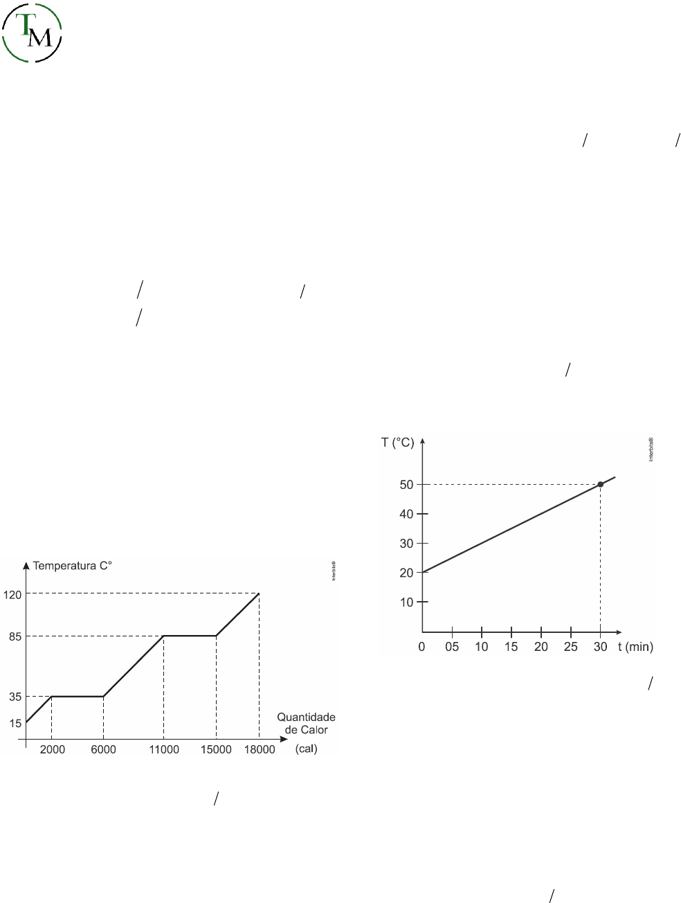 TEOREMA MILITAR LISTA 4- CALORIMETRIA PROF. IGOR FERREIRA 1. (G1 - col. naval 2018) Considere 2 L de água pura líquida a uma temperatura inicial de 30 C. Fornecendo certa quantidade de energia sob a forma de calor, ela se aquece até atingir os 40 C. Supondo que toda a energia fornecida à água fosse utilizada para elevar uma pedra de 5 kg a partir do solo (0 m) a fim de posicioná-la em repouso a certa altura do solo, que altura máxima seria essa? Despreze o atrito com o ar e qualquer outra troca de calor da água com o meio ambiente além da mencionada. Dados: 3 águad 1g cm ;= águac 1cal g C;= 1cal 4,2 J;= 2g 10 m s .= a) 240 m b) 840 m c) 1.680 m d) 2.360 m e) 3.200 m 2. (Eear 2019) A figura a seguir mostra a curva de aquecimento de uma amostra de 200 g de uma substância hipotética, inicialmente a 15 C, no estado sólido, em função da quantidade de calor que esta recebe. Determine o valor aproximado do calor latente de vaporização da substância, em cal g. a) 10 b) 20 c) 30 d) 40 3. (Eear 2019) Duas porções de líquidos A e B, de substâncias diferentes, mas de mesma massa, apresentam valores de calor específico respectivamente iguais a 0,58 cal g C e 1,0 cal g C. Se ambas receberem a mesma quantidade de calor sem, contudo, sofrerem mudanças de estado físico, podemos afirmar corretamente que: a) a porção do líquido A sofrerá maior variação de temperatura do que a porção do líquido B. b) a porção do líquido B sofrerá maior variação de temperatura do que a porção do líquido A. c) as duas porções, dos líquidos A e B, sofrerão a mesma variação de temperatura. d) as duas porções, dos líquidos A e B, não sofrerão nenhuma variação de temperatura. 4. (Eear 2018) Um corpo absorve calor de uma fonte a uma taxa constante de 30 cal min e sua temperatura (T) muda em função do tempo (t) de acordo com o gráfico a seguir. A capacidade térmica (ou calorífica), em cal C, desse corpo, no intervalo descrito pelo gráfico, é igual a a) 1 b) 3 c) 10 d) 30 5. (Eear 2017) Em uma panela foi adicionada uma massa de água de 200 g à temperatura de 25 C. Para transformar essa massa de água totalmente em vapor a 100 C, qual deve ser a quantidade total de calor fornecida, em calorias? (Considere calor específico da água c 1cal g C).= a) 1.500 b) 20.000 c) 100.000 d) 123.000 TEOREMA MILITAR LISTA 4- CALORIMETRIA PROF. IGOR FERREIRA 6. (Eear 2017) Um buffet foi contratado para servir 100 convidados em um evento. Dentre os itens do cardápio constava água a 10 C. Sabendo que o buffet tinha em seu estoque 30 litros de água a 25 C, determine a quantidade de gelo, em quilogramas, a 0 C, necessário para obter água à temperatura de 10 C. Considere que a água e o gelo estão em um sistema isolado. Dados: - densidade da água 31g cm ;= - calor específico da água 1cal g C;= - calor de fusão do gelo 80 cal g C;= e - calor específico do gelo 0,5 cal g C= a) 2 b) 3 c) 4 d) 5 7. (Eear 2016) Considere um cubo de gelo de massa 1kg que se encontra à temperatura de 2 C.− Colocado ao sol, recebe 14 J de calor a cada segundo. Dados o calor específico do gelo igual a 0,5 cal g C e 1cal igual a 4,2 J. Quantos minutos, aproximadamente, o gelo deverá ficar ao sol para começar a se fundir? a) 0,005 b) 0,5 c) 5 d) 50 8. (Espcex (Aman) 2018) Um painel coletor de energia solar é utilizado para aquecer a água de uma residência e todo o sistema tem um rendimento de 60%. Para aumentar a temperatura em 12,0 C de uma massa de água de 1.000 kg, a energia solar total coletada no painel deve ser de Dado: considere o calor específico da água igual a J 4,0 . g C a) 42,8 10 J b) 44,8 10 J c) 48,0 10 J d) 74,8 10 J e) 78,0 10 J 9. (Espcex (Aman) 2016) Num recipiente contendo 4,0 litros de água, a uma temperatura inicial de 20 C, existe um resistor ôhmico, imerso na água, de resistência elétrica R 1 ,= alimentado por um gerador ideal de força eletromotriz E 50 V,= conforme o desenho abaixo. O sistema encontra-se ao nível do mar. A transferência de calor para a água ocorre de forma homogênea. Considerando as perdas de calor desprezíveis para o meio, para o recipiente e para o restante do circuito elétrico, o tempo necessário para vaporizar 2,0 litros de água é Dados: calor específico da água 4 kJ / kg C= calor latente de vaporização da água 2.230 kJ / kg= densidade da água 1kg / L= a) 4.080 s b) 2.040 s c) 3.200 s d) 2.296 s e) 1.500 s 10. (Efomm 2019) Em um calorímetro ideal, no qual existe uma resistência elétrica de 10 W de potência por onde passa uma corrente elétrica, é colocado 1,0 L de água a 12 C e 2,0 kg de gelo a 0 C. Após duas horas, tempo suficiente par que água e gelo entrem em equilíbrio térmico e supondo que toda a energia fornecida foi absorvida pelo conteúdo do calorímetro, qual é o percentual de massa de água líquida contida no calorímetro? a) 22% b) 33% c) 46% d) 57% e) 71% TEOREMA MILITAR LISTA 4- CALORIMETRIA PROF. IGOR FERREIRA 11. (Esc. Naval 2019) Uma esfera homogênea de raio R, cuja densidade é de 32,7 g cm e o calor específico vale 0,2 cal g C, está a uma temperatura de 100 C.− Coloca-se essa esfera em um reservatório, isolado termicamente e de capacidade térmica desprezível, que contém 0,1 litro de água a 0 C. Qual o valor mínimo de R, em centímetros, para que toda a água congele? Dados: massa específica da água 31,0 g cm ;= calor latente de fusão da água 80 cal g.= a) 8,4 b) 6,2 c) 4,7 d) 3,3 e) 1,5 12. (Efomm 2019) Dona Marize, numa noite fria de inverno, resolveu fazer café. Entretanto, percebeu que não havia água para fazer o café. Dona Marize teve uma ideia, pegou cubos de gelo do congelador de massa total 1,5 kg a 8 C− e com o calor fornecido por um ebulidor, transformou-os em água a 90 C, num intervalo de tempo de 700 s. O ebulidor foi ligado a uma fonte de tensão contínua de 150 V. Determine o valor da resistência elétrica do ebulidor em ohms, supondo que 60% da potência elét