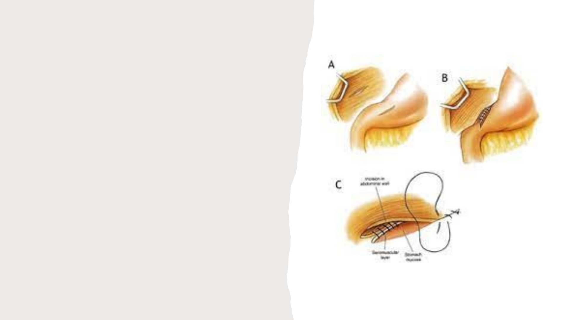 Gastropexia incisional Corte seromuscular no lado direito do antro pilórico, ou seja, que vai cortar as camadas serosas e a camada muscular do estômago. Depois, vai pegar esse pedaço do estômago que cortou e vai aproximar da parede abdominal, vai medir o mesmo tamanho e vai também cortar a parede abdominal, expondo o músculo, vai cortar o peritônio, e o músculo vai ficar aparecendo. Depois que fizer esse corte, tanto no estômago, quanto no peritônio, vai começar a suturar, suturando portinha com portinha, suturando abdômen com estômago, e depois que fizer isso, vai fazer isso com a outra borda também, fazendo duas linhas de suturas, que podem ser feitas com fio absorvível ou inabsorvível, sendo que o que tem melhor resultado a longo prazo são os fios inabsorvíveis (Náilon), sendo que podem ser feitos padrões contínuos ou separados, não tendo diferença quanto a esses padrões no resultado a longo prazo, aonde pode fazer sutura simples separada, sutura simples contínua e sutura em X.