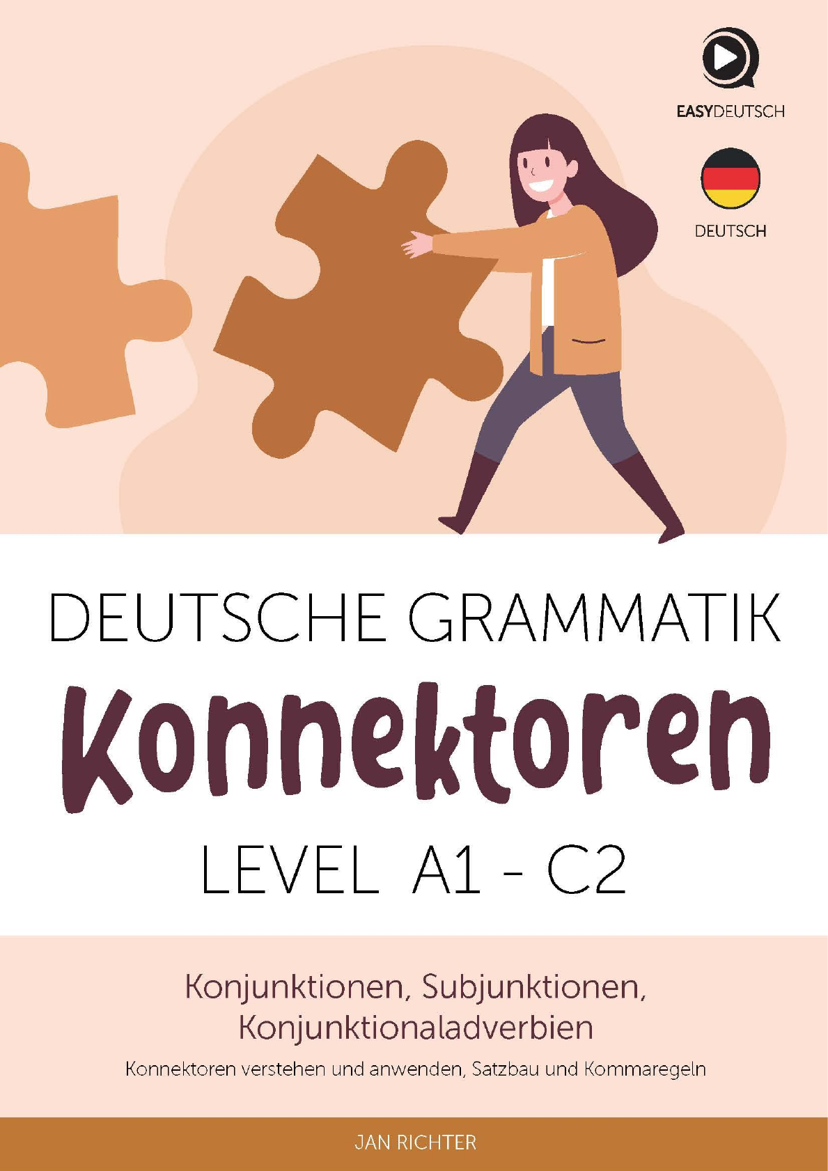 Konnektoren Konjunktionen, Subjunktionen, Konjunktionaladverbien Die Konnektoren sind für viele Schüler aber teilweise auch Lehrer, die diese erklären müssen, eine der größten Schwierigkeiten. Mit diesem Buch gebe ich dir alle Informationen, die für das Verständnis der deutschen Konnektoren brauchst. Einige Dinge muss man aber einfach wissen – das heißt, auswendig lernen – und genau deswegen gibt es in diesem Buch neben den allgemeinen Erklärungen auch alle wichtigen Listen, die du für die Konnektoren brauchst. Die vielen Übungen mit Lösungen helfen dir ebenfalls dabei, die Konnektoren in Zukunft immer richtig anzuwenden. Autor: Jan Richter Deutsche Grammatik Konnektoren © / Copyright: 2021 + Jan Richter / EasyDeutsch Autor: Jan Richter Umschlaggestaltung: Veng Hong Sien Illustrationen: depositphotos.com, pixelpay.com / Veng Hong Sien Lektorat, Korrektorat: Anika Rabe, Natascha Schäfer Verlag: EasyDeutsch LLC 2880W Oakland Park Blvd Suite 225C Oakland Park, FL. US FL 33311 ISBN Ebook: 978-3-948331-13-9 ISBN Buch: 978-3-948331-14-6 Weitere Bücher und Ebooks von EasyDeutsch Zum Shop Weitere Informationen, eine Vorschau und Übersetzungen der Ebooks in viele Sprachen findest du unter www.shop.easy-deutsch.de Achtung: Nur einige der Titel sind auch als gedrucktes Buch erhältlich. Welche genau das sind, kannst du unter www.shop.easy-deutsch.de nachschauen. Aber alle Titel sind immer auch als Ebook erhältlich. Ebook = PDF-Datei – Die Ebooks sind sofort nach dem Kauf herunterladbare PDF-Dateien und keine gedruckten Bücher. Du kannst sie aber auf all deinen Geräten verwenden und auf Wunsch auch selbst ausdrucken. http://www.shop.easy-deutsch.de/ http://www.shop.easy-deutsch.de/ KONNEKTOREN www.easy-deutsch.de 5 Der Autor Jan Richter Jan ist selbstständiger Deutschlehrer und Autor. Mit seiner Website EasyDeutsch und seinen Büchern und Ebooks möchte er dir beweisen, dass die deutsche Grammatik viel einfacher ist als ihr Ruf. Sein neues Buch: „Konnektoren“ erklärt dir die Konnektoren (Konjunktionen, Subjunktionen, Konjunktionaladverbien) auf eine einfache und leicht verständliche Art und Weise. www.easy-deutsch.de https://www.easy-deutsch.de/ https://www.easy-deutsch.de/ KONNEKTOREN www.easy-deutsch.de 6 Inhaltsverzeichnis Weitere Bücher und Ebooks von EasyDeutsch ................................................................... 4 Der Autor ................................................................................................................................. 5 Inhaltsverzeichnis .................................................................................................................. 6 Vorwort: ................................................................................................................................ 12 Wichtige Hinweise ............................................................................................................... 13 Konnektoren – Grundwissen ............................................................................................... 15 Konjunktion, Subjunktion oder Konjunktionaladverb? ...................................................... 16 Konjunktionen ...................................................................................................................... 17 Konjunktionen – Grundwissen .............................................................................................. 18 Wortstellung – Verbindung von Hauptsätzen ..................................................................... 19 Verbindung von Nebensätzen ............................................................................................. 19 Verbindung von Wörtern und Satzgliedern ........................................................................ 20 Mehrteilige Konjunktionen .................................................................................................... 20 Wortstellung – Mehrteilige Konjunktionen ........................................................................... 21 Übungen: Konjunktionen ...................................................................................................... 22 Übungen: Mehrteilige Konjunktionen .................................................................................. 29 Subjunktionen ...................................................................................................................... 37 Was sind Subjunktionen? ...................................................................................................... 38 Die wichtigsten Subjunktionen ............................................................................................. 38 Wortstellung ............................................................................................................................ 38 Nebensätze ............................................................................................................................ 39 „Dass-Sätze“ ....................................................................................................................... 39 Was sind „dass – Sätze“? ............................................................................................ 39 Verben mit „dass“ - Ergänzung ................................................................................. 39 „dass“ oder „ob“? ...................................................................................................... 40 Zusammenfassung ...................................................................................................... 40 Kausalsätze (weil, da… ) .................................................................................................. 41 Was sind Kausalsätze? ................................................................................................ 41 „weil“ oder „da“? ........................................................................................