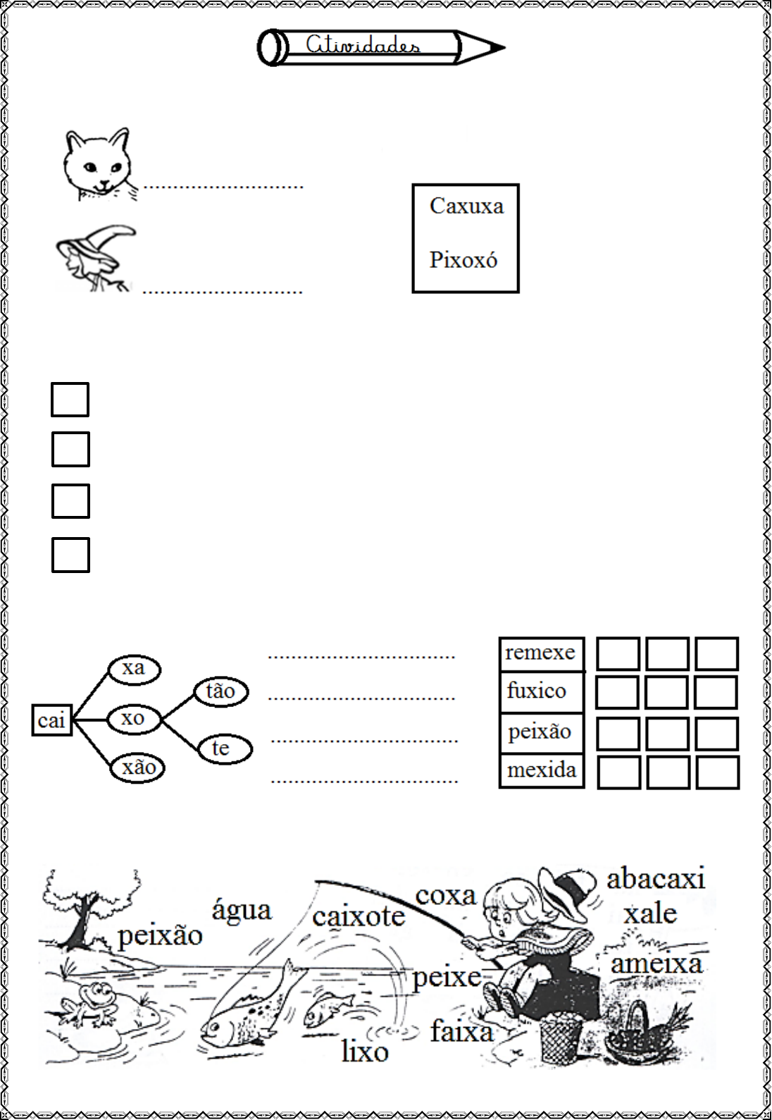 1) Escreva o nome de cada personagem: 2) Numere os acontecimentos na mesma ordem da história: Pixoxó deixou o xale todo sujo. Caxuxa colocou o xale numa caixa. Pixoxó mexeu na caixa. Pixoxó puxou o xale. 3) Junte: Separe: 4) Ligue cada nome ao seu desenho: 5) Por que a bruxinha está brava com o gato? Circule toda letra X que você encontrar no laboratório da bruxa. 6) Observe, copie e forme palavras: xa xa xa xe xi xo xu xa xe xi xo xu ......... ......... ......... ......... ......... ................................................... ................................................... ................................................... ................................................... ................................................... ...................................................