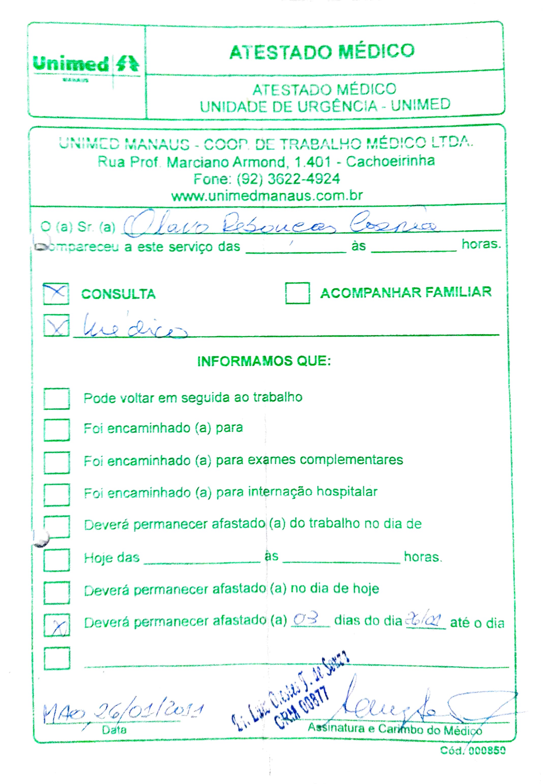 ATESTADO MÉDICco Unimed ATESTADO MÉDICO UNIDADE DE URGÊNCIA - UNIMED UNIMCD MANAUS - COor DE TRABALHO MÉD!CO LTDA Rua Prof. Marciano Armond, 1.401 Cachoeirinha Fone: (92) 3622-4924 www.unimedmanaus.com.br O (a) Sr. (a) (lot Lest2uees ezAA Dmpareceu a este serviço das às horas. cONSULTA ACOMPANHAR FAMILIAR INFORMAMOS QUE Pode voltar em seguida ao trabalho Foi encaminhado (a) para Foi encaminhado (a) para exames complementares Foi encaminhado (a) para internação hospitalar Deverá permanecer afastado (a) do trabalho no dia de Hoje das as horas Deverá permanecer afastado (a) no dia de hoje Deverá permanecer afastado (a) O dias do dia até o dia PMAe 2/O41o14 Data CRH 0877 Assinatura e Carfmbo do Médiço Cód. 000850 Rcal e Benemérita Sociedade Portuguesa Beneficente do Amazonas Hospital Português Atestado Médico lauo Roheu eo Atesto que necessita de m 01) dias de afastamento, a partir desta data, por motivo de doença. CID Zo.3 Dr Camila I. Corrêa Médica CRM-AM 7422 Assinatura CRM/CRO 19 0al2014 Local e Data NOTA-Este atestado é válido para as finalidades previstas no Art. 86 do RGPS, aprovado pelo Decreto n° 60.501 de 14/03/67 e será expedido para justificativa de 1 a 5 dias de afastamento do Trabalho. oplantstieresanënwss End: Av. Joaquim Nabuco, n°. 1359 Centro Cep: 69.020-030 Fone: (92) 2101-2500 Site: www.hospitalportuguesam.com.br Manaus -Amazonas ATESTADO MÉDICO nimedi s ATESIADO MÉDIC0 UNIMED Av. Constantino Nery, 1678. Säo Geraldo Avenida Professor Nilton Lins, 3.259, no Parque das Laranjoiras Fone: (92) 3212-2000 O (a Sr.(a) ab oule Cmnea ompareceu a este serviço das às horas cONSULTA LACOMPANHAR FAMILIAR INFORMAMOS QUE Pode voltar em seguida ao trabalho Foi encaminhado (a) para Foi encaminhado (a) para exames complementares Foi encaminhado (a) para internação hospitalar Deverá permanecer afastado (a) do trabalho Hoje das 2 Jo horas. wwwu.ns Deverá permarnecer afastado (a) no dia de hoje Deverá permanecer afastado (a). dias do dia até o dia A O2lo4/2o14 Anaturn e Cerimho tó Medice Governo do Estado do Amazonas Secretaria do Estado da Saúde CAIC SUSAM NOME RECEITA MÉDICA Siaho 1 (unA) FoLGA N 2s 9 d uva Garcia CPF:693.40% 502-63 D:reuofie Getai Dy Oldyo R Corea DATA: 9149 Ass. Médico - CRM