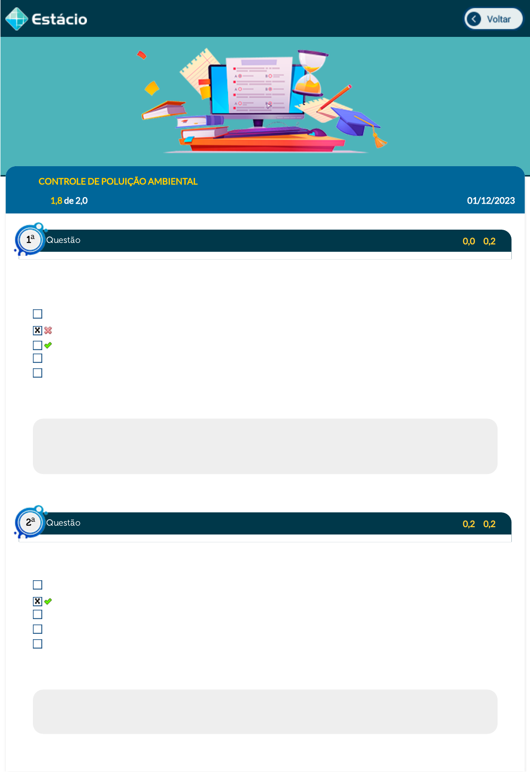 Disc.: CONTROLE DE POLUIÇÃO AMBIENTAL Acertos: 1,8 de 2,0 01/12/2023 Acerto: 0,0 / 0,2 É fácil perceber a poluição quando o agente poluente está visível no ar, no solo ou na água, como é o caso da fumaça, por exemplo. Mas existem agentes poluentes que não são visíveis a olho nu, mas que podem nos afetar e provocar doenças. Um exemplo de agente poluente invisível é a(o): Resíduos industriais. As descargas de carros. Radiações ionizantes. Chorume. Óleo queimado. Respondido em 01/12/2023 13:33:05 Explicação: Radiações ionizantes, como os raios X, Alfa, Beta e Gama, que são percebidos pelas pessoas a eles expostas, mas podem lhes causar doenças graves, conforme o tempo de exposição. Acerto: 0,2 / 0,2 Para viabilizar o estudo da atmosfera, podemos dividi-la em camadas, analisando as características de cada uma de forma isoladamente. Dentro da divisão estabelecida, a camada onde vivemos é chamada de: Mesosfera. Troposfera. Ionosfera. Termosfera. Estratosfera. Respondido em 01/12/2023 13:00:41 Explicação: A troposfera é a camada mais próxima da superfície. É nela que a vida como conhecemos se desenvolve. Questão1 a Questão2 a https://simulado.estacio.br/alunos/inicio.asp javascript:voltar(); Acerto: 0,2 / 0,2 A sigla PAIRO representa uma doença chamada Perda Auditiva Induzida por Ruído Ocupacional. Como o nome sugere, trata-se de uma doença que afeta os trabalhadores em seus ambientes de trabalho. Para a prevenção dessa doença, uma organização pode: Distribuir equipamentos de proteção auditiva Deixar de usar máquinas e outras fontes de ruído Aceitar que os danos a audição são inevitáveis Terceirizar a sua produção, transferindo o problema Transferir sua produção para ambientes abertos Respondido em 01/12/2023 13:00:56 Explicação: As organizações atuam sobre esse problema distribuindo equipamentos de proteção auditiva, como é o caso dos protetores auriculares. Elas também podem inserir proteções acústicas no ambiente ou vedar a circulação de pessoas em ambiente onde os níveis de ruídos são muito intensos, por exemplo. Acerto: 0,2 / 0,2 O esgoto lançado em um rio pode seguir seu curso, afetando áreas distantes do seu ponto de descarte, até se dispersarem nesse rio ou em outro rio, em um lago ou no mar em que vier a desaguar. Que efeito poderá ser causado para o meio ambiente aquático ao longo do rio? Nada. Os seus efeitos negativos cessam quando eles atingem a água. Haverá uma degradação parcial e limitada, que só terminará ao alcançar o mar. Ocorrerá a degradação do ambiente até a dispersão desses e�uentes. Nada acontecerá, pois a degradação só ocorre no local do descarte original. Ocorrerá a recuperação do meio ambiente ao longo do rio, até a dispersão. Respondido em 01/12/2023 13:01:56 Explicação: A degradação do meio ambiente aquático ocorrerá ao longo do trajeto do rio, seguindo a sua correnteza, até a dispersão. Ele poderá sim ir perdendo força até a sua total dispersão. Acerto: 0,2 / 0,2 As autoridades dos anos 1970 se viram diante de um quadro alarmante de poluição do ar. Em muitas cidades do Brasil e do mundo havia uma quantidade crescente de pessoas que sofriam com desconfortos ou doenças derivados da má qualidade do ar que respiravam. As principais fontes identi�cadas de toda essa poluição eram as fábricas e o tráfego urbano. Infelizmente, algumas cidades de hoje ainda apresentam esse mesmo quadro. Podemos considerar que algumas ações possíveis para tratar reduzir a poluição do ar nessas cidades são: I - Reduzir a concentração de indústrias em uma mesma região; II - Estabelecer limitações para os poluentes emitidos pelos sistemas de produção dessas fábricas; III - Estabelecer um rodizio de tráfego de veículos nas áreas mais poluídas. Questão3 a Questão4 a Questão5 a Sobre a possível e�cácia dessas ações para reduzir a poluição do ar em uma determinada cidade ou região, podemos a�rmar que: I I, II III I, III I, II, III Respondido em 01/12/2023 13:02:12 Explicação: As três ações poderão ser e�cazes já que todas contribuem para redução de concentração de poluentes gerados pela indústria ou pelo trânsito urbano. A redução da concentração das fábricas também reduz a concentração de poluentes, processos produtivos podem ser revistos de forma a poluir menos, e o rodizio de tráfego reduz a poluição já que reduz a concentração de veículos. Acerto: 0,2 / 0,2 Existem diferentes tipos de poluentes que podem afetar o meio ambiente. Por exemplo, a fumaça saindo das chaminés das fábricas ou os gases das descargas de automóveis são exemplos de: Poluição do ar. Poluição do solo. Poluição da água. Poluição do som. Nada, não é poluição. Respondido em 01/12/2023 13:02:34 Explicação: Trata-se de exemplos de poluição do ar. Acerto: 0,2 / 0,2 O meio ambiente possui seus próprios meios para reduzir as concentrações de poluentes. Um desses meios é a fotossíntese, que é realizada pelos vegetais. Através dela, a natureza reduz a concentração do: Gás carbônico. Nitrogênio. Ozônio. Oxigênio. Metano. Respondido em 01/12/2023 13:20:41 Explicação: A fotossíntese permite que os vegetais captem o gás carbônico do meio ambiente e o transforme na energia que precisam para viver, e em oxigênio, que é liberado na atmosfera. Questão6 a Questão7 a Acerto: 0,2 / 0,2 A legislação e a regulamentação tem estabelecido uma série de limitações e regras contra a propagação de ruídos em ambientes abertos e fechados. Seguindo esses instrumentos legais, e visando trazer maior segurança para as pessoas, um dos documentos que as organizações precisam dispor para poder desenvolver as suas operações é o laudo de ruido ambiental. Ele serve para: Atestar que a situação do ruido fora dos ambientes da empresa Atestar que o ruido nos ambientes da empresa está controlado ou não Apresentar a todas