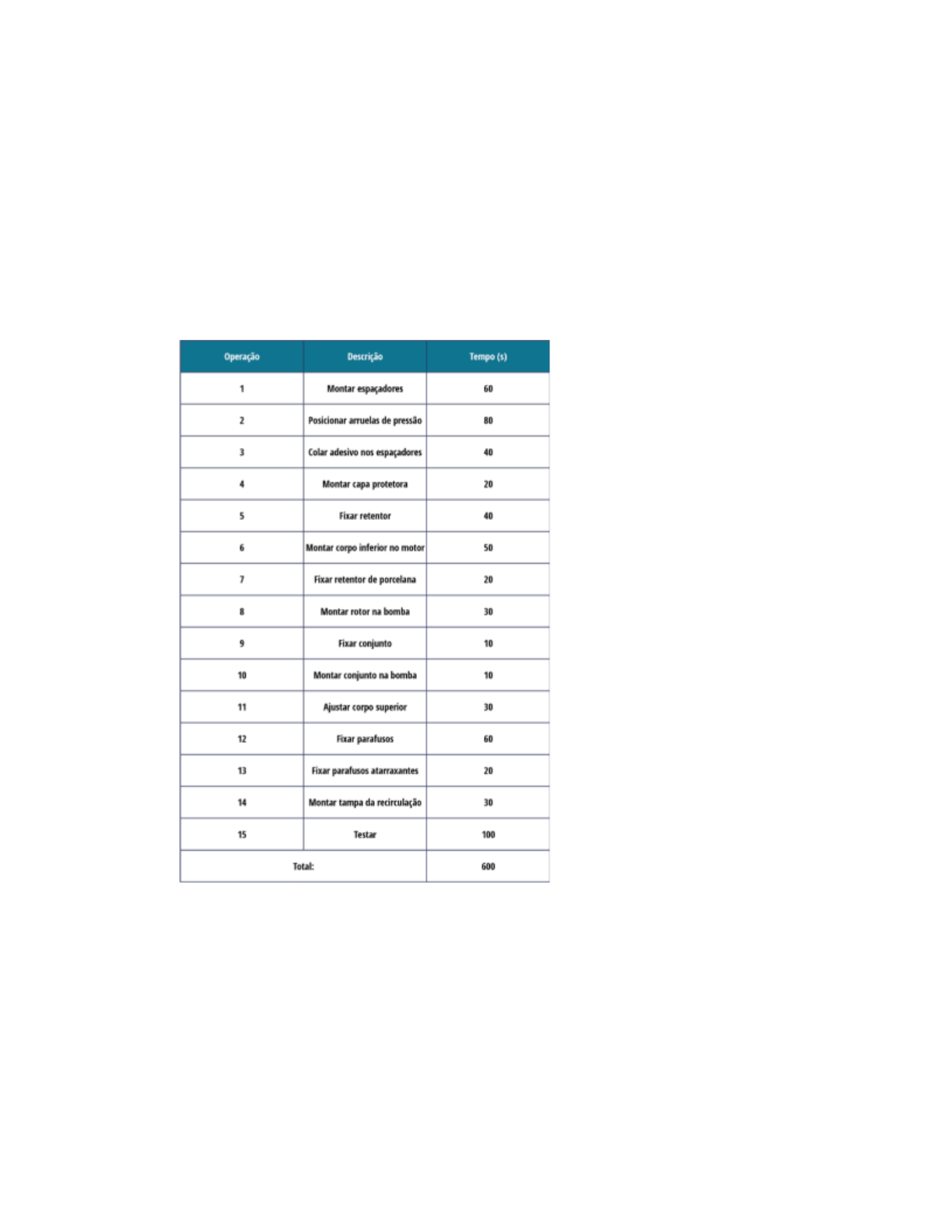 Avaliação On-Line 3 (AOL 3) - Questionário Pergunta 1 Analise a situação-problema a seguir: Uma equipe de programadores de produção está levantando os indicadores de um determinado processo em uma organização produtiva que trabalha em 2 turnos Os processos operacionais são realizados em sequência em uma única linha de montagem e sem atividades paralelas. Os tempos perdidos durante uma semana de produção foram listados de acordo com a tabela a seguir. Considerando essas informações e o conteúdo estudado sobre capacidade real, é possível afirmar que: a capacidade real seria de 330 peças por semana e o índice de eficiência seria 78,6 %. a capacidade real seria de 330 peças por semana e o índice de eficiência seria 87,5 %. a capacidade real seria de 330 peças por semana e o índice de eficiência seria 87,5 %. a capacidade real seria de 420 peças por semana e o índice de eficiência seria 87,5 %. a capacidade real seria de 330 peças por semana e o índice de eficiência seria 68,75 % Pergunta 2 Em um ambiente de planejamento e controle de produção avançado, muitas vezes, o profissional responsável pelas informações necessárias para o processo de tomada de decisões precisa calcular os vários níveis de capacidade produtiva de uma instalação industrial. Assim, considerando as informações apresentadas e os conteúdos estudados sobre estudos de capacidade, analise os diferentes tipos de capacidades de produção a seguir e associe-os com suas respectivas características. 1) Capacidade instalada. 2) Capacidade disponível. 3) Capacidade efetiva. 4) Capacidade realizada. ( ) Corresponde ao volume produzido em uma planta industrial ao longo de uma jornada completa de trabalho. ( ) Corresponde ao volume produzido em uma planta industrial ao longo de uma jornada completa de trabalho menos o volume referente às perdas programadas. ( ) Corresponde ao volume produzido em uma planta industrial ao longo de uma jornada completa de trabalho menos o volume total de perdas, tanto programadas como as não programadas. ( ) Corresponde ao volume máximo que uma planta industrial pode produzir se não houver perda alguma e trabalhando ininterruptamente. Agora, assinale a alternativa que apresenta a sequência correta: 2, 3, 4, 1. 2, 4, 3, 1. 3, 1, 2, 4. 3, 1, 2, 4. 1, 3, 4, 2. Pergunta 3 Leia o trecho a seguir: “O alfinete é um item tão pequeno que poderia parecer fácil fabricá-lo de uma vez só. [...] Comparando-se o tempo gasto por um único operário para realizar todas as etapas, com o de dez operários que executam somente uma ou duas etapas cada um, verifica-se que há uma grande diferença: dez trabalhadores especializados (alguns desempenhando duas ou três funções) trabalhando na produção do alfinete produziriam aproximadamente 48.000 alfinetes por dia, em contraposição aos poucos alfinetes que dez trabalhadores não qualificados poderiam fabricar.” Fonte: CORRÊA, H. L.; GIANESI, I. G. N.; CAON, M. Planejamento, programação e controle da produção. 6. ed. São Paulo: Atlas, 2019. p. 10. (Adaptado). Considerando essas informações e os conteúdos estudados sobre processos de projeto, pode-se afirmar que: toda empresa possui sua própria racionalidade, isto é, o controle de produção deve ser visto como um setor de agentes de fiscalização durante o processo de projeto. os ganhos quantitativos da produção seriada têm limitações quanto à medição. Trata-se de uma escolha mais conceitual do que científica. as técnicas para mapeamento de processo identificam os tipos de atividades que ocorrem durante o processo e mostram o fluxo de materiais ou pessoas ou informações ao longo do processo. os métodos de controle, em um projeto de um processo produtivo, devem seguir um mesmo padrão e utilizar os mesmos indicadores, independente do modelo de negócio. a definição e análise dos tipos de processo traz informações completas para o seu projeto, na medida em que reforça as distinções entre esses diferentes modelos. Pergunta 4 Leia o trecho a seguir: “A prática hoje consagrada de gestão empresarial propõe uma abordagem hierárquica para o processo de gestão estratégica, para que a empresa possa criar e manter vantagens competitivas. Esse processo estabelece três níveis de estratégia: estratégia corporativa, estratégia do negócio e estratégia funcional. O nível corporativo trata de decisões que, por sua natureza, não podem ser descentralizadas sem que se corra o risco de sub-otimizações. O nível da unidade de negócios é uma subdivisão do nível corporativo, para os casos em que a organização opere com unidades de negócios independentes.” Fonte: CORRÊA, H. L.; GIANESI, I. G. N.; CAON, M. Planejamento, programação e controle da produção. 6. ed. São Paulo: Atlas, 2019. p. 172. Considerando essas informações e o conteúdo estudado sobre tipos de plano de produção, é possível afirmar o que: pequenos detalhes, como número de turnos ou horas extras, são desconsiderados em avaliações de capacidade. o plano de produção deve ponderar os indicadores expressos em dias em um horizonte de longo prazo. os indicadores que auxiliam o processo de tomada de decisão devem avaliar, entre outros, a capacidade instalada e as definições dos pontos de equilíbrio. as decisões do planejamento da capacidade devem considerar os estudos de demanda de curto prazo. ampliar ou manter a configuração original das linhas de montagem ou ainda considerar as intenções de ampliação, são atividades de sequenciamento de curto prazo. Pergunta 5 Analise a situação-problema a seguir: Um profissional que atua com planejamento e controle de produção definiu o processo de uma empresa de injeção de peças plásticas, que trabalha em 3 turnos de 6 horas, 6 dias por semana, conforme tabela a seguir. Os processos produtivos ocorrem de forma sequenciada em apenas uma linha de montagem, sem atividades paralelas, e os tempo