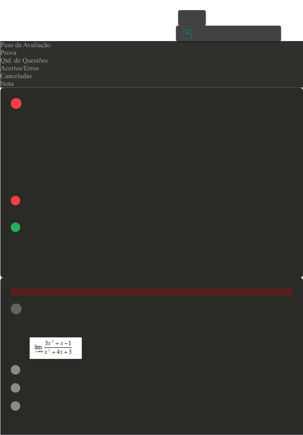 02/12/2023, 07:57 Avaliação Final (Objetiva) - Individual about:blank 1/7 Prova Impressa GABARITO | Avaliação Final (Objetiva) - Individual (Cod.:889732) Peso da Avaliação 3,00 Prova 73726406 Qtd. de Questões 12 Acertos/Erros 7/3 Canceladas 2 Nota 9,00 Uma cunha é cortada a partir de um cilindro circular de raio 4 por dois planos. Um plano é perpendicular ao eixo do cilindro. O outro intercepta o primeiro com um ângulo de 30º ao longo de um diâmetro do cilindro. Determine o volume da cunha: A Aproximadamente 29,87. B Aproximadamente 32,85. C Aproximadamente 24,63. D Aproximadamente 18,14. Atenção: Esta questão foi cancelada, porém a pontuação foi considerada. Ao estudar limites de funções racionais no infinito, nos deparamos com a necessidade de utilizarmos as propriedades operatórias dos limites de uma função. No entanto, existem alguns dispositivos práticos que permitem sua resolução mediante uma análise do grau de cada termo da razão (numerador e denominador). Assinale a alternativa CORRETA que apresenta o valor do limite a seguir: A 1. B 0. C Infinito. VOLTAR A+ Alterar modo de visualização 1 2 02/12/2023, 07:57 Avaliação Final (Objetiva) - Individual about:blank 2/7 D 3. Uma árvore de determinada espécie foi plantada na região central de sua cidade. Você realizou alguns estudos e determinou que esta espécie de árvore cresce, em altura, segundo a função a seguir, em que h é a altura da árvore (em metros) e t é o tempo (em anos) de vida da árvore. Considerando que a árvore não seja podada, utilizando o conceito de limite, calcule a altura máxima que esta árvore pode atingir e assinale a alternativa CORRETA: A 30. B 33. C 40. D 34. O conceito de limite é fundamental no cálculo diferencial, um campo da Matemática que se iniciou no século XVII, sendo bastante produtivo em resultados e aplicações em várias áreas do conhecimento, como a Física, a Engenharia, a Economia, a Geologia, a Astronomia, a Biologia, entre outras. Utilizando as propriedades dos limites, encontre o limite da função f(x) = , quando x tender a 2. A -8. B 0. C -12. D -2. Um fazendeiro tem 1200 metros de cerca e quer cercar um campo retangular que está na margem de um rio reto. Considere que ele não precisa de cerca ao longo do rio. 3 4 5 02/12/2023, 07:57 Avaliação Final (Objetiva) - Individual about:blank 3/7 Quais são as dimensões do campo que tem maior área? A 250 metros de profundidade e 700 metros de extensão. B 400 metros de profundidade e 400 metros de extensão. C 300 metros de profundidade e 600 metros de extensão. D 200 metros de profundidade e 800 metros de extensão. Atenção: Esta questão foi cancelada, porém a pontuação foi considerada. Muitas operações matemáticas têm a sua operação inversa, exemplo, a adição é a sutração, a divisão é a multiplicação, a potência é a radiciação, e assim vai, até chegar na derivada, a qual possui como sua inversa, a integral. A partir disso, calcule a integral a seguir: Acerca do resultado, assinale a alternativa CORRETA: A 2x22 + 3x + C, em que C é uma constante, a qual pode ser igual a zero (0). B = x22 + 3x + C, em que C é uma constante, a qual pode ser igual a zero (0). C x2 + 3x + C, em que C é uma constante, a qual pode ser igual a zero (0). D 2x2 + 3x + C, em que C é uma constante, a qual pode ser igual a zero (0). A região R, delimitada pelas curvas y = x e y = x², é girada ao redor do eixo x. 6 7 02/12/2023, 07:57 Avaliação Final (Objetiva) - Individual about:blank 4/7 Determine o volume do sólido resultante: A Aproximadamente 0,18. B Aproximadamente 1,27. C Aproximadamente 0,97. D Aproximadamente 0,42. Uma das fórmulas fundamentais para derivadas é a regra da cadeia. Desenvolvida por Gottfried Leibniz, a regra da cadeia é aplicável quando temos uma situação em que a função aparece como uma função composta por duas funções. Sobre a utilização correta da regra da cadeia, classifique V para as sentenças verdadeiras e F para as falsas: ( ) y = cos(2x), implica em y' = 2.sin(2x) ( ) y = ln(2x²), implica em y' = 2/x² ( ) y = tan (2x²), implica em y' = sec²(2x²) ( ) y = (3x - 3)³, implica em y' = 9.(3x - 3)² Assinale a alternativa que apresenta a sequência CORRETA: A V - V - F - V. B F - F - V - V. C F - V - V - F. D F - F - F - V. Deseja-se construir uma casa térrea de forma retangular. O retângulo onde a casa será construída tem 60 m de perímetro. Calcule as dimensões desse retângulo sabendo que a área de sua região deve ser a maior possível. Acerca do resultado, assinale a alternativa CORRETA: A O terreno deve ter 15 m de comprimento e 15 m de largura. B O terreno deve ter 19 m de comprimento e 11 m de largura. 8 9 02/12/2023, 07:57 Avaliação Final (Objetiva) - Individual about:blank 5/7 C O terreno deve ter 18 m de comprimento e 12 m de largura. D O terreno deve ter 20 m de comprimento e 10 m de largura. Encontre a área limitada pela curva y = -4 + x² e o eixo das abscissas. Acerca do resultado, assinale a alternativa CORRETA: A Aproximadamente 8,25 unidades de área. B Aproximadamente 10,67 unidades de área. C Aproximadamente 16,34 unidades de área. D Aproximadamente 6,93 unidades de área. (ENADE, 2014) Um dos problemas mais importantes estudados pelo cálculo diferencial diz respeito à maximização e minimização de funções. Um desses problemas está relacionado à função 10 11 02/12/2023, 07:57 Avaliação Final (Objetiva) - Individual about:blank 6/7 cúbica definida por A I, apenas. B I, II e III. C I e III, apenas. D II, apenas. 02/12/2023, 07:57 Avaliação Final (Objetiva) - Individual about:blank 7/7 (ENADE, 2014). A R$ 2100,00. B R$ 2950,00. C R$ 3750,00. D R$1100,00. 12 Imprimir