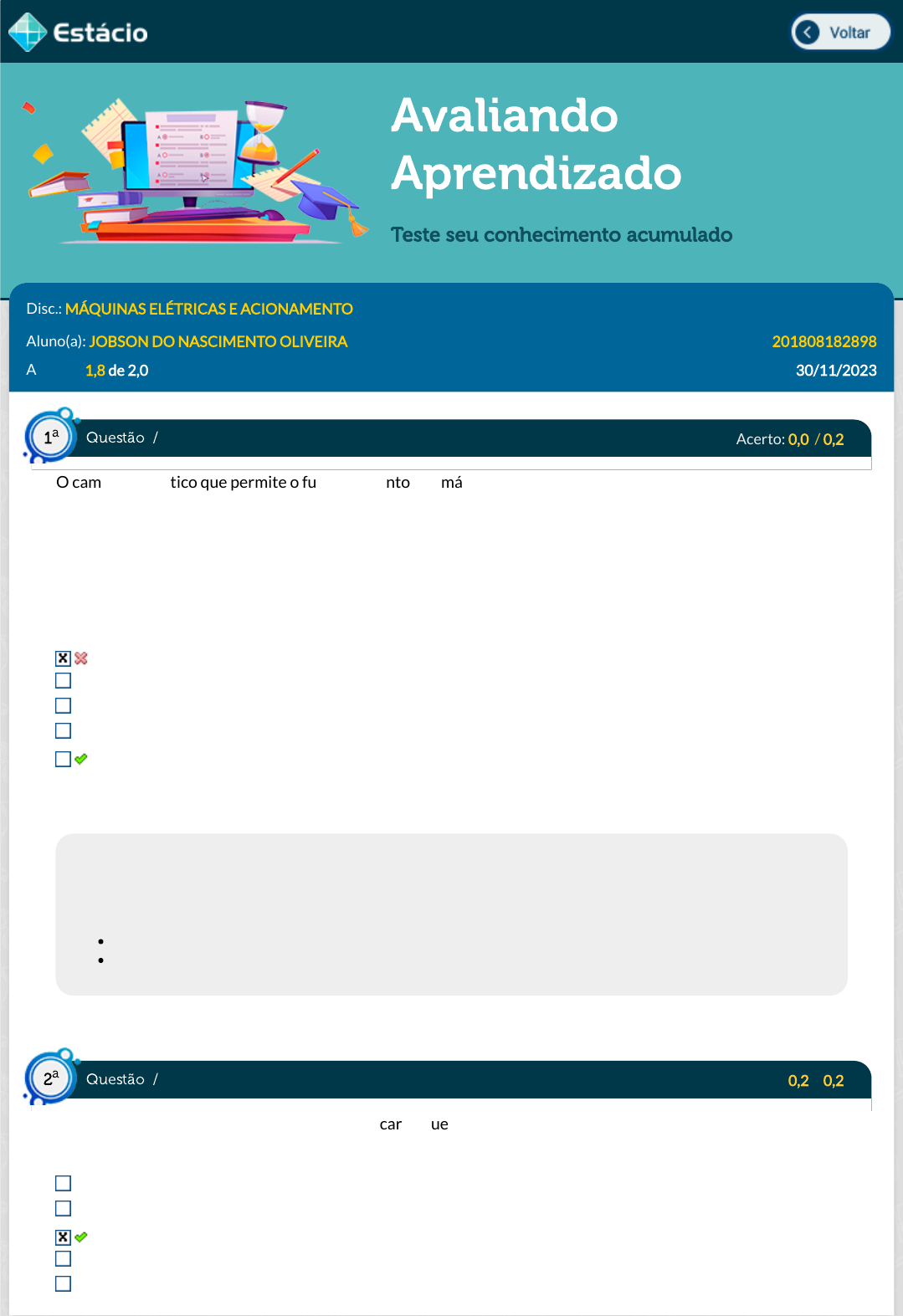 30/11/2023, 22:34 Estácio: Alunos https://simulado.estacio.br/alunos/ 1/5 Avaliando Aprendizado Teste seu conhecimento acumulado Disc.: MÁQUINAS ELÉTRICAS E ACIONAMENTO Aluno(a): JOBSON DO NASCIMENTO OLIVEIRA 201808182898 Acertos: 1,8 de 2,0 30/11/2023 Acerto: 0,0 / 0,2 O campo magnético que permite o funcionamento das máquinas elétricas é tambem responsável por perdas de energia. Essa perda pode ser dada por: I. Histerese; II. Foucault; III. Paralaxe. Está correto o que se a�rma em: II e III. I, II e III. I e III. Apenas I. I e II. Respondido em 30/11/2023 20:32:44 Explicação: O campo magnético que permite que as máquinas elétricas funcionem também é uma fonte de perda de energia desses sistemas. As perdas em máquinas elétricas decorrentes do campo magnético são: Perdas por histerese; e Perdas por Foucault ou perdas por correntes parasitas. Acerto: 0,2 / 0,2 Considere um motor Shunt que alimenta uma carga que demanda uma potência constante. Se a corrente de carga aumenta, e há aumento na queda de tensão na resistência de armadura, podemos a�rmar que: A velocidade do motor diminui. O torque da carga aumenta. O torque da carga diminui. A tensão terminal da máquina diminui. Há aumento do �uxo da máquina. Questão / 1 a Questão / 2 a https://simulado.estacio.br/alunos/inicio.asp https://simulado.estacio.br/alunos/inicio.asp javascript:voltar(); javascript:voltar(); 30/11/2023, 22:34 Estácio: Alunos https://simulado.estacio.br/alunos/ 2/5 Respondido em 30/11/2023 17:55:55 Explicação: Explicação: À medida ocorre aumento na corrente de carga, ocorre maximização na queda de tensão na resistência de armadura. Isso gera diminuição da tensão terminal, que automaticamente reduz a corrente de campo, diminuindo a tensão induzida, reduzindo ainda mais a tensão terminal, reduzindo o torque. Acerto: 0,2 / 0,2 Em um ensaio para determinar a resistência de armadura de um gerador dc, foram obtidos os seguintes resultados: VDC = 45 V; IDC = 15 A. Sabendo-se que o gerador está ligado em delta, a resistência de armadura por fase, em W, é: 3,0 6,0 1,5 9,0 4,5 Respondido em 30/11/2023 17:35:24 Explicação: Solução: Substituindo os valores dados no enunciado: Acerto: 0,2 / 0,2 O estudo das potências durante a operação de um motor de indução trifásico, ligação D, chegou aos resultados apresentados no quadro a seguir: Descrição Potência [kW] Potência de entrada 10 Potência do gap 9,5 Potência de saída 8,5 Sabendo-se que a corrente de linha é 100 A, o valor da resistência do estator, em W, é aproximadamente: Ra = 3VDC 2IDC Ra = = 4, 5 3⋅45 2⋅15 Questão / 3 a Questão / 4 a 30/11/2023, 22:34 Estácio: Alunos https://simulado.estacio.br/alunos/ 3/5 0,45 0,05 0,10 0,15 0,20 Respondido em 30/11/2023 20:34:55 Explicação: Resposta correta: 0,05 Acerto: 0,2 / 0,2 A Figura a seguir mostra o circuito equivalente de um transformador monofásico, indicando numericamente os componentes e os valores e�cazes das correntes. Diante do exposto, o valor das perdas do núcleo do transformador, em W, é: 500 480 980 250 1250 Respondido em 30/11/2023 17:34:45 Explicação: Resposta correta: 1250 Acerto: 0,2 / 0,2 O balanço de energia de um motor é o agregado de diferentes transformações. Assinale a alternativa que apresenta a composição da energia elétrica do balanço de energia de um motor. Energia mecânica + Aumento de energia no campo de acoplamento + Energia eletromagnética. Energia mecânica + Aumento de energia no campo de acoplamento + Calor. Energia mecânica + Energia eletromagnética + Calor. Energia mecânica + Energia eletromagnética + Energia cinética. Energia cinética + Aumento de energia no campo de acoplamento + Calor. Respondido em 30/11/2023 22:30:56 Explicação: Questão / 5 a Questão / 6 a 30/11/2023, 22:34 Estácio: Alunos https://simulado.estacio.br/alunos/ 4/5 A energia elétrica aplicada aos terminais do motor é transformada em: energia mecânica, que realizará o trabalho útil obtido no eixo do motor; energia magnética armazenada nos acoplamentos dos circuitos; e em calor. Acerto: 0,2 / 0,2 Conhecer os princípios de funcionamento e as características das máquinas de corrente contínua é fundamental para um pro�ssional de engenharia. Desse-se conhecer e prever seu comportamento sob diferentes condições num regime permanente de funcionamento. Quando se fala de um motor shunt, sua velocidade pode ser controlada por diversas maneiras. Quando se insere uma resistência no circuito da armadura, ocorre: O aumento da resistência aumenta o torque elétrico. O aumento da resistência aumenta a corrente de armadura. A resistência dever ser inserida em paralelo. O aumento da resistência aumenta a velocidade. O aumento da resistência diminui a corrente de armadura. Respondido em 30/11/2023 22:25:11 Explicação: No controle da velocidade por meio da inserção de resistência no circuito de armadura, se insere uma resistência em série com o circuito de armadura. O aumento da resistência diminui a corrente de armadura, que por sua vez reduz o torque elétrico, provocando diminuição da velocidade. Acerto: 0,2 / 0,2 Para o motor do exercício anterior, a perda de potência nos enrolamentos do estator, em kW, é aproximadamente: 2,4 9,7 31,8 28,9 7,2 Respondido em 30/11/2023 22:29:09 Explicação: Resposta correta: 7,2 Acerto: 0,2 / 0,2 Um motor de indução trifásico com rotor bobinado possui resistência do circuito do rotor igual a 2 W e apresenta torque nominal com um escorregamento de 5%. Para que o motor desenvolva o torque nominal com um escorregamento de 25%, o valor da resistência adicional, em W, que deverá ser adicionada ao circuito do rotor é: 10 8 Questão / 7 a Questão / 8 a Questão / 9 a 30/11/2023, 22:34 Estácio: Alunos https://simulado.estacio.br/alunos/ 5/5 2 1 4 Respondido em 30/11/2023 20:37:18 Explicação: Resposta correta: 8 Acerto: 0,2 / 0,2 Um transformador trifásico Y ¿ é cons