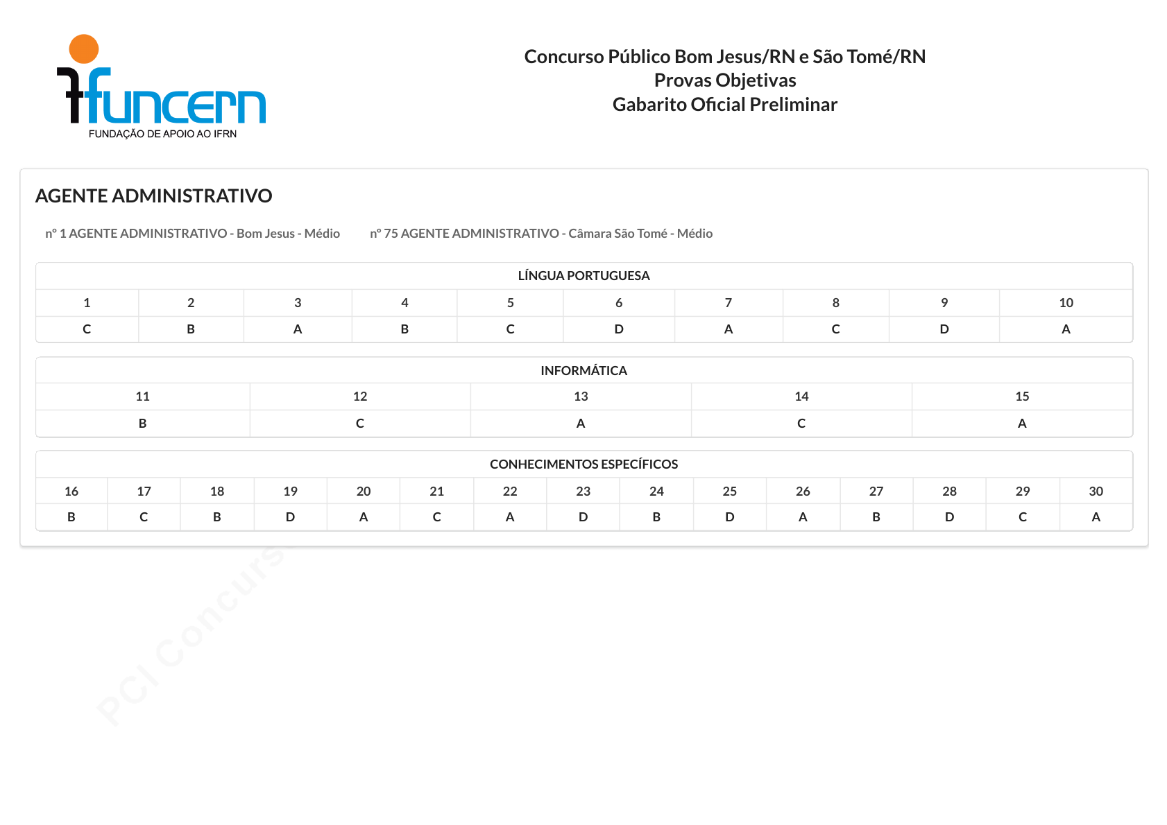 pcimarkpci MjgwNDoyOWI4OjUwZDQ6MTk3NDoyNmY4OjA4OGQ6YWZhZjo3N2Mx:U2F0LCAxOCBOb3YgMjAyMyAxMDoyMzo0NiAtMDMwMA== www.pciconcursos.com.br Concurso Público Bom Jesus/RN e São Tomé/RN Provas Objetivas Gabarito O�cial Preliminar AGENTE ADMINISTRATIVO nº 1 AGENTE ADMINISTRATIVO - Bom Jesus - Médio nº 75 AGENTE ADMINISTRATIVO - Câmara São Tomé - Médio LÍNGUA PORTUGUESA 1 2 3 4 5 6 7 8 9 10 C B A B C D A C D A INFORMÁTICA 11 12 13 14 15 B C A C A CONHECIMENTOS ESPECÍFICOS 16 17 18 19 20 21 22 23 24 25 26 27 28 29 30 B C B D A C A D B D A B D C A pcimarkpci MjgwNDoyOWI4OjUwZDQ6MTk3NDoyNmY4OjA4OGQ6YWZhZjo3N2Mx:U2F0LCAxOCBOb3YgMjAyMyAxMDoyMzo0NiAtMDMwMA== www.pciconcursos.com.br TÉCNICO DE ENFERMAGEM - ATENÇÃO ESPECIALIZADA nº 2 TÉCNICO DE ENFERMAGEM - ATENÇÃO ESPECIALIZADA - Bom Jesus - Médio LÍNGUA PORTUGUESA 1 2 3 4 5 6 7 8 9 10 C B A B C D A C D A INFORMÁTICA 11 12 13 14 15 B C A C A CONHECIMENTOS ESPECÍFICOS 16 17 18 19 20 21 22 23 24 25 26 27 28 29 30 C C A B D D D B C C A C B C C TÉCNICO DE ENFERMAGEM - ESTRATÉGIA SAÚDE DA FAMÍLIA / TÉCNICO DE ENFERMAGEM nº 3 TÉCNICO DE ENFERMAGEM - ESTRATÉGIA SAÚDE DA FAMÍLIA - Bom Jesus - Médio nº 39 TÉCNICO DE ENFERMAGEM - São Tomé - Médio LÍNGUA PORTUGUESA 1 2 3 4 5 6 7 8 9 10 C B A B C D A C D A INFORMÁTICA 11 12 13 14 15 B C A C A CONHECIMENTOS ESPECÍFICOS 16 17 18 19 20 21 22 23 24 25 26 27 28 29 30 B D D C A C A B C C B A D A D pcimarkpci MjgwNDoyOWI4OjUwZDQ6MTk3NDoyNmY4OjA4OGQ6YWZhZjo3N2Mx:U2F0LCAxOCBOb3YgMjAyMyAxMDoyMzo0NiAtMDMwMA== www.pciconcursos.com.br TÉCNICO EM SAÚDE BUCAL nº 4 TÉCNICO EM SAÚDE BUCAL - Bom Jesus - Médio nº 40 TÉCNICO EM SAÚDE BUCAL - São Tomé - Médio LÍNGUA PORTUGUESA 1 2 3 4 5 6 7 8 9 10 C B A B C D A C D A INFORMÁTICA 11 12 13 14 15 B C A C A CONHECIMENTOS ESPECÍFICOS 16 17 18 19 20 21 22 23 24 25 26 27 28 29 30 A D B A A D D A C C A D A C B TÉCNICO EM INFORMÁTICA nº 5 TÉCNICO EM INFORMÁTICA - Bom Jesus - Médio LÍNGUA PORTUGUESA 1 2 3 4 5 6 7 8 9 10 C B A B C D A C D A INFORMÁTICA 11 12 13 14 15 B C A C A CONHECIMENTOS ESPECÍFICOS 16 17 18 19 20 21 22 23 24 25 26 27 28 29 30 C D A B B A D C B A D C B D C pcimarkpci MjgwNDoyOWI4OjUwZDQ6MTk3NDoyNmY4OjA4OGQ6YWZhZjo3N2Mx:U2F0LCAxOCBOb3YgMjAyMyAxMDoyMzo0NiAtMDMwMA== www.pciconcursos.com.br FISCAL AMBIENTAL nº 6 FISCAL AMBIENTAL - Bom Jesus - Médio nº 74 FISCAL AMBIENTAL - São Tomé - Médio LÍNGUA PORTUGUESA 1 2 3 4 5 6 7 8 9 10 C B A B C D A C D A INFORMÁTICA 11 12 13 14 15 B C A C A CONHECIMENTOS ESPECÍFICOS 16 17 18 19 20 21 22 23 24 25 26 27 28 29 30 C A B C A C A A C A A B A A C ENFERMEIRO - ATENÇÃO ESPECIALIZADA nº 7 ENFERMEIRO - ATENÇÃO ESPECIALIZADA - Bom Jesus - Superior LÍNGUA PORTUGUESA 1 2 3 4 5 6 7 8 9 10 B B D C C A D D A C LÓGICA 11 12 13 14 15 C B D B B CONHECIMENTOS ESPECÍFICOS 16 17 18 19 20 21 22 23 24 25 26 27 28 29 30 D B A D C D B B A B C B A D A pcimarkpci MjgwNDoyOWI4OjUwZDQ6MTk3NDoyNmY4OjA4OGQ6YWZhZjo3N2Mx:U2F0LCAxOCBOb3YgMjAyMyAxMDoyMzo0NiAtMDMwMA== www.pciconcursos.com.br ENFERMEIRO - ESTRATÉGIA SAÚDE DA FAMÍLIA / ENFERMEIRO nº 8 ENFERMEIRO - ESTRATÉGIA SAÚDE DA FAMÍLIA - Bom Jesus - Superior nº 43 ENFERMEIRO - São Tomé - Superior LÍNGUA PORTUGUESA 1 2 3 4 5 6 7 8 9 10 B B D C C A D D A C LÓGICA 11 12 13 14 15 C B D B B CONHECIMENTOS ESPECÍFICOS 16 17 18 19 20 21 22 23 24 25 26 27 28 29 30 D B B D A D D C A A A A C C D FARMACÊUTICO nº 9 FARMACÊUTICO - Bom Jesus - Superior nº 44 FARMACÊUTICO - São Tomé - Superior LÍNGUA PORTUGUESA 1 2 3 4 5 6 7 8 9 10 B B D C C A D D A C LÓGICA 11 12 13 14 15 C B D B B CONHECIMENTOS ESPECÍFICOS 16 17 18 19 20 21 22 23 24 25 26 27 28 29 30 D C C C A D D D C B C B C C C pcimarkpci MjgwNDoyOWI4OjUwZDQ6MTk3NDoyNmY4OjA4OGQ6YWZhZjo3N2Mx:U2F0LCAxOCBOb3YgMjAyMyAxMDoyMzo0NiAtMDMwMA== www.pciconcursos.com.br FISIOTERAPEUTA nº 10 FISIOTERAPEUTA - Bom Jesus - Superior nº 45 FISIOTERAPEUTA - São Tomé - Superior LÍNGUA PORTUGUESA 1 2 3 4 5 6 7 8 9 10 B B D C C A D D A C LÓGICA 11 12 13 14 15 C B D B B CONHECIMENTOS ESPECÍFICOS 16 17 18 19 20 21 22 23 24 25 26 27 28 29 30 C A C C C A C B B D A A D B A FONOAUDIÓLOGO nº 11 FONOAUDIÓLOGO - Bom Jesus - Superior nº 41 FONOAUDIÓLOGO - São Tomé - Superior LÍNGUA PORTUGUESA 1 2 3 4 5 6 7 8 9 10 B B D C C A D D A C LÓGICA 11 12 13 14 15 C B D B B CONHECIMENTOS ESPECÍFICOS 16 17 18 19 20 21 22 23 24 25 26 27 28 29 30 D B D A B C A D A C A A B C D pcimarkpci MjgwNDoyOWI4OjUwZDQ6MTk3NDoyNmY4OjA4OGQ6YWZhZjo3N2Mx:U2F0LCAxOCBOb3YgMjAyMyAxMDoyMzo0NiAtMDMwMA== www.pciconcursos.com.br MÉDICO - ESTRATÉGIA SAÚDE DA FAMÍLIA / MÉDICO nº 12 MÉDICO - ESTRATÉGIA SAÚDE DA FAMÍLIA - Bom Jesus - Superior nº 46 MÉDICO - São Tomé - Superior LÍNGUA PORTUGUESA 1 2 3 4 5 6 7 8 9 10 B B D C C A D D A C LÓGICA 11 12 13 14 15 C B D B B CONHECIMENTOS ESPECÍFICOS 16 17 18 19 20 21 22 23 24 25 26 27 28 29 30 B A B A D C B D B A C A D B C NUTRICIONISTA nº 13 NUTRICIONISTA - Bom Jesus - Superior nº 47 NUTRICIONISTA - São Tomé - Superior LÍNGUA PORTUGUESA 1 2 3 4 5 6 7 8 9 10 B B D C C A D D A C LÓGICA 11 12 13 14 15 C B D B B CONHECIMENTOS ESPECÍFICOS 16 17 18 19 20 21 22 23 24 25 26 27 28 29 30 D A B C D C A B C A C D A B A pcimarkpci MjgwNDoyOWI4OjUwZDQ6MTk3NDoyNmY4OjA4OGQ6YWZhZjo3N2Mx:U2F0LCAxOCBOb3YgMjAyMyAxMDoyMzo0NiAtMDMwMA== www.pciconcursos.com.br CIRURGIÃO DENTISTA nº 14 CIRURGIÃO DENTISTA - Bom Jesus - Superior nº 48 CIRURGIÃO DENTISTA - São Tomé - Superior LÍNGUA PORTUGUESA 1 2 3 4 5 6 7 8 9 10 B B D C C A D D A C LÓGICA 11 12 13 14 15 C B D B B CONHECIMENTOS ESPECÍFICOS 16 17 18 19 20 21 22 23 24 25 26 27 28 29 30 B D D B B C C A B B D A C A D PSICOLÓGO nº 15 PSICÓLOGO - Bom Jesus - Superior LÍNGUA PORTUGUESA 1 2 3 4 5 6 7 8 9 10 B B D C C A D D A C LÓGICA 11 12 13 14 15 C B D B B CONHECIMENTOS ESPECÍFICOS 16 17 18 19 20 21 22 23 24 25 26 27 28 29 30 B A C A A D B C C D A B D B A pcimarkpci MjgwNDoyOWI4OjUwZDQ6MTk3NDoyNmY4OjA4OGQ6YWZhZjo3N2Mx:U2F0LCAxOCBO