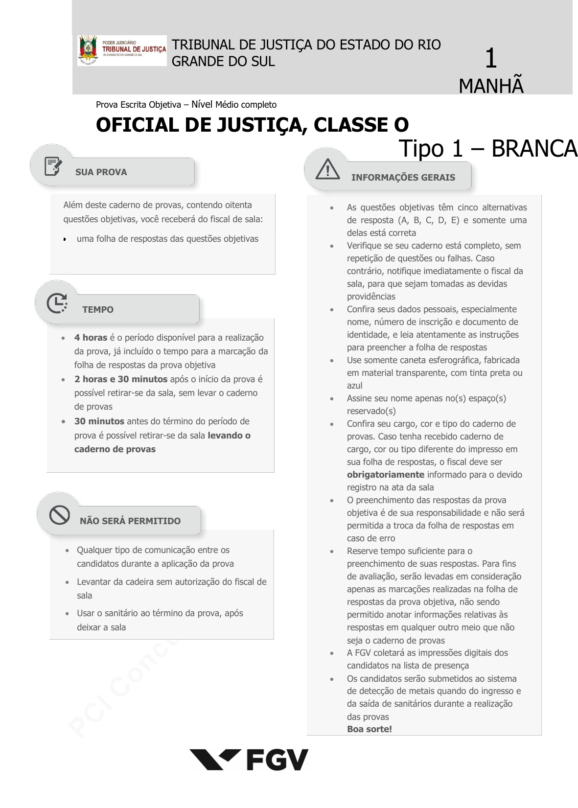 pcimarkpci MjgwNDowMWIzOjk0MDE6ODY4MTo1OGYyOmJiMjc6ODE3MDo3OGZm:U2F0LCAwMiBEZWMgMjAyMyAxNTo1MTo1NyAtMDMwMA== www.pciconcursos.com.br TRIBUNAL DE JUSTIÇA DO ESTADO DO RIO GRANDE DO SUL 1 MANHÃ Prova Escrita Objetiva – Nível Médio completo OFICIAL DE JUSTIÇA, CLASSE O Tipo 1 – BRANCA Além deste caderno de provas, contendo oitenta questões objetivas, você receberá do fiscal de sala: uma folha de respostas das questões objetivas As questões objetivas têm cinco alternativas de resposta (A, B, C, D, E) e somente uma delas está correta Verifique se seu caderno está completo, sem repetição de questões ou falhas. Caso contrário, notifique imediatamente o fiscal da sala, para que sejam tomadas as devidas providências Confira seus dados pessoais, especialmente nome, número de inscrição e documento de identidade, e leia atentamente as instruções para preencher a folha de respostas Use somente caneta esferográfica, fabricada em material transparente, com tinta preta ou azul Assine seu nome apenas no(s) espaço(s) reservado(s) Confira seu cargo, cor e tipo do caderno de provas. Caso tenha recebido caderno de cargo, cor ou tipo diferente do impresso em sua folha de respostas, o fiscal deve ser obrigatoriamente informado para o devido registro na ata da sala O preenchimento das respostas da prova objetiva é de sua responsabilidade e não será permitida a troca da folha de respostas em caso de erro Reserve tempo suficiente para o preenchimento de suas respostas. Para fins de avaliação, serão levadas em consideração apenas as marcações realizadas na folha de respostas da prova objetiva, não sendo permitido anotar informações relativas às respostas em qualquer outro meio que não seja o caderno de provas A FGV coletará as impressões digitais dos candidatos na lista de presença Os candidatos serão submetidos ao sistema de detecção de metais quando do ingresso e da saída de sanitários durante a realização das provas Boa sorte! 4 horas é o período disponível para a realização da prova, já incluído o tempo para a marcação da folha de respostas da prova objetiva 2 horas e 30 minutos após o início da prova é possível retirar-se da sala, sem levar o caderno de provas 30 minutos antes do término do período de prova é possível retirar-se da sala levando o caderno de provas Qualquer tipo de comunicação entre os candidatos durante a aplicação da prova Levantar da cadeira sem autorização do fiscal de sala Usar o sanitário ao término da prova, após deixar a sala SUA PROVA TEMPO NÃO SERÁ PERMITIDO INFORMAÇÕES GERAIS pcimarkpci MjgwNDowMWIzOjk0MDE6ODY4MTo1OGYyOmJiMjc6ODE3MDo3OGZm:U2F0LCAwMiBEZWMgMjAyMyAxNTo1MTo1NyAtMDMwMA== www.pciconcursos.com.br pcimarkpci MjgwNDowMWIzOjk0MDE6ODY4MTo1OGYyOmJiMjc6ODE3MDo3OGZm:U2F0LCAwMiBEZWMgMjAyMyAxNTo1MTo1NyAtMDMwMA== www.pciconcursos.com.br Tribunal de Justiça do Estado do Rio Grande do Sul FGV Oficial de Justiça, Classe O Tipo 1 – Cor BRANCA – Página 3 Língua Portuguesa Texto 1 É claro que somos livres para falar ou escrever como quisermos, como soubermos, como pudermos. Mas é também evidente que devemos adequar o uso da língua à situação, o que contribui efetivamente para a maior eficiência comunicativa. 1 Considerando o pensamento do texto 1 e tendo conhecimento das atribuições de um oficial de justiça, chegamos à conclusão de que, nessa atividade, a língua escrita, o nível, o uso ou o registro do idioma deve ser predominantemente: (A) formal, de acordo com os princípios da gramática normativa; (B) informal, em busca de mais ampla compreensão da mensagem; (C) regional, adequando-o ao local onde ocorre a comunicação; (D) popular, tendo em vista que as mensagens são lidas por todos; (E) ultraformal, selecionando vocabulário erudito e construções elaboradas. 2 O texto 1 é formado por dois períodos. O segundo período, em relação ao primeiro, mostra uma: (A) retificação do pensamento expresso no primeiro período; (B) explicação necessária de opiniões manifestadas; (C) limitação do alcance da afirmativa anterior; (D) oposição a um pensamento já expresso; (E) informação comprovadora do que é escrito antes. 3 Na redação de um texto, pode ocorrer uma série de dificuldades com vocábulos da língua portuguesa; as palavras abaixo que estão graficamente corretas são: (A) advogado / metereologia; (B) bicabornato /astigmatismo; (C) babadouro / beneficência; (D) reinvindicação / bugigangas; (E) jaboticaba / cabelereiro. 4 Em todas as frases abaixo ocorre uma troca indevida do vocábulo sublinhado por seu parônimo; a única das frases cuja forma do vocábulo sublinhado está correta é: (A) O motorista infligiu as leis do trânsito; (B) O prisioneiro dilatou os comparsas do assalto; (C) Nada há que desabone a sua conduta imoral; (D) A cobrança é bimestral, ou seja, duas vezes por mês; (E) Os cumprimentos devem ser dados na entrada da festa. 5 Observe a frase abaixo: “Dada a causa, a natureza produz o efeito do modo mais breve em que pode ser produzido”. Segundo essa frase, a natureza: (A) produz tudo aquilo de que o homem precisa; (B) indica ao homem o caminho a seguir; (C) segue, sem pressa, a ordem natural das coisas; (D) cria leis, mas não as respeita; (E) mostra espírito lógico e eficiência. 6 Na frase “A natureza faz o homem feliz e bom, mas a sociedade o corrompe e torna-o miserável”, a conjunção sublinhada pode ser adequadamente substituída por: (A) no entretanto; (B) embora; (C) visto que; (D) portanto; (E) contudo. 7 Observe o texto a seguir, retirado de uma revista de computação. “Por mais poderoso que seja, um computador sem programas adequados tem pouca utilidade. E um ‘programa adequado’ com certeza não é aquele aplicativo profissional, caro e sofisticado que, às vezes, já vem instalado. De nada adiantam funções, botões e janelas, se você não conseguir fazer alguma coisa com eles”. Um dos elementos que d