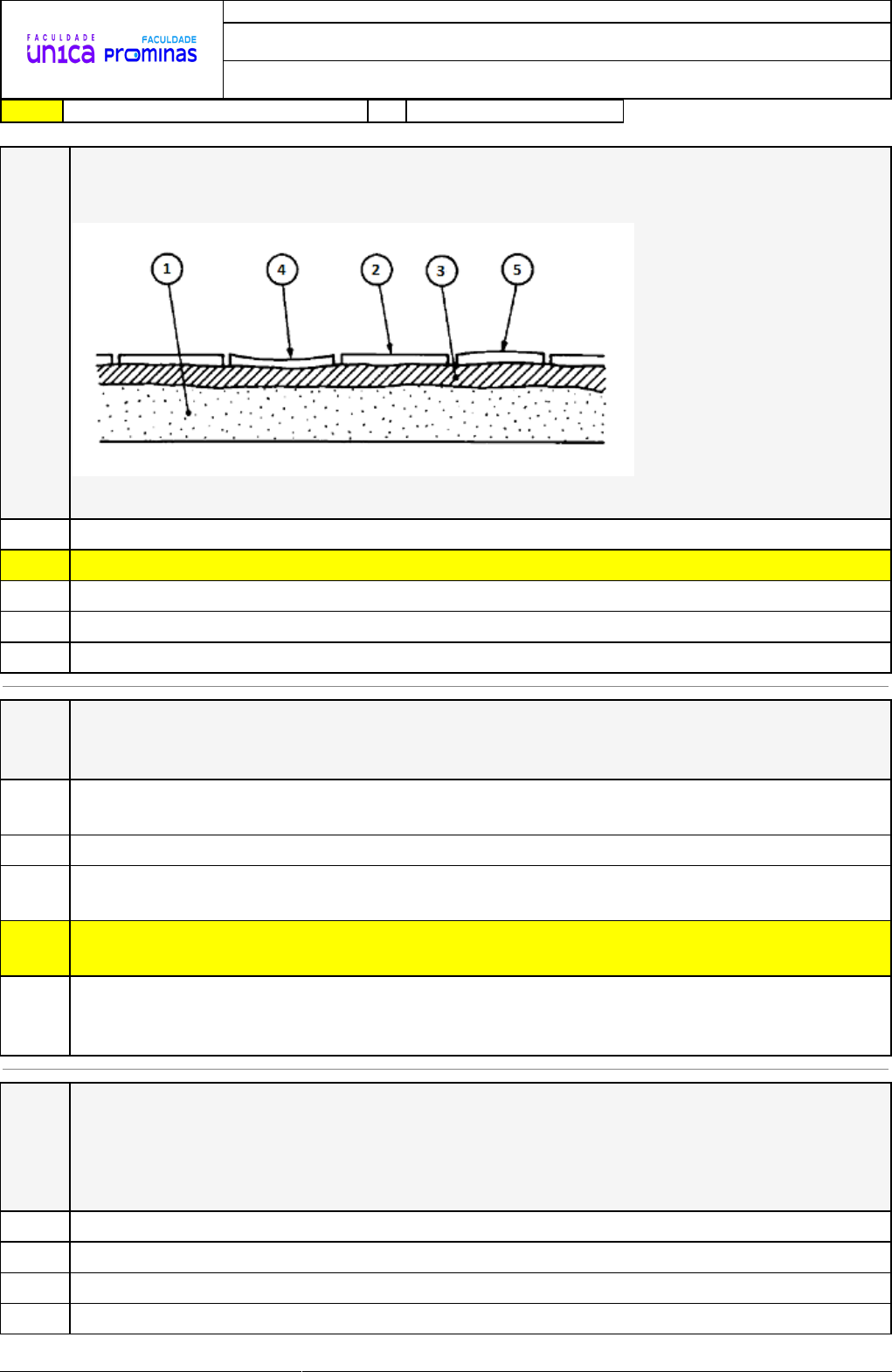 02/12/2023 19:37:39 1/3 REVISÃO DE SIMULADO Disciplina: Materiais de Construção I Respostas corretas são marcadas em amarelo X Respostas marcardas por você. Questão 001 (Instituto Consulplan) Considerando o revestimento de piso interno ou externo com placas cerâmicas, a pasta de argamassa colante deverá preencher as irregularidades da superfície do contrapiso e da base das placas cerâmicas, conforme a figura a seguir: De acordo com a imagem, podemos afirmar que o 1 se refere a: A) placa cerâmica côncava. X B) contrapiso. C) placa de argamassa. D) revestimento cerâmico. E) pasta de argamassa colante. Questão 002 (CONSULPLAN – 2017, adaptada) É bastante extensa a faixa de propriedades das cerâmicas, dependendo da constituição, cozimento, processo de moldagem etc. Assinale a alternativa INCORRETA a respeito das propriedades das cerâmicas. A) Volume aparente é o volume de água deslocado por uma peça já saturada por 24h de imersão. B) Em relação ao peso, há cerâmicas mais leves do que a água e outras de grande peso. C) as placas cerâmicas são constituídas de algumas camadas, que variam do substrato até o esmalte final. X D) Peso específico aparente é a relação entre o peso da peça úmida e seu volume aparente. E) A resistência mecânica depende muito da quantidade de água usada na moldagem. O excesso de água lava as partículas menores, que mais facilmente fundirão para formar o vidrado. Questão 003 (UNESPAR) O PEI é uma importante característica a ser analisada na hora de se especificar revestimentos cerâmicos esmaltados, aliada ao correto assentamento e boa manutenção, é uma garantia de durabilidade do produto. Qual a melhor escolha para um revestimento cerâmico esmaltado a ser utilizado em áreas de alto tráfego de pessoas? A) PEI 3. B) PEI 2. X C) PEI 5. D) PEI 1. Nome: 02/12/2023 19:37:39 2/3 E) PEI 4. Questão 004 (FGV-2014) Com relação à terminologia e requisitos dos blocos cerâmicos para alvenaria de vedação, analise as afirmativas a seguir. I. Os blocos cerâmicos para vedação constituem as alvenarias externas ou internas que não têm a função de resistir a outras cargas verticais, além do peso da alvenaria da qual faz parte. II. O bloco cerâmico de vedação deve trazer, obrigatoriamente, gravado em alto relevo em uma das suas faces externas, a identificação do fabricante e suas dimensões em metros. III. O bloco cerâmico de vedação deve ser fabricado por conformação plástica de matériaâ��prima arenosa, e queimado a elevadas temperaturas. Assinale: A) se somente as afirmativas I e II estiverem corretas. X B) se somente a afirmativa I estiver correta.se somente a afirmativa I estiver correta. C) se somente as afirmativas I e III estiverem corretas. D) se todas as afirmativas estiverem corretas. E) se somente as afirmativas II e III estiverem corretas. Questão 005 (CEFET-MG) “As propriedades das cerâmicas refratárias incluem a sua capacidade de suportar as _________________ temperaturas de serviço, sem _________________, além da capacidade de permanecerem ________________ quando expostas a ambientes _______________.” A alternativa que completa as lacunas corretamente é: A) elevadas, expandir, reativas, oxidantes. X B) elevadas, fundir, inertes, severos. C) baixas, solidificar, inertes, industriais. D) moderadas, alterar, ativas, redutores. E) moderadas, modificar, inertes, redutores. Questão 006 (IBFC) Analise as afirmativas abaixo a respeito dos materiais cerâmicos e dê valores Verdadeiro (V) ou Falso (F). ( ) A transparência óptica dos materiais vítreos inorgânicos deve-se, em parte, à não cristalinidade desses materiais. ( ) As ligações atômicas nos materiais cerâmicos variam desde puramente iônica até totalmente covalente. Muitas cerâmicas exibem uma combinação desses dois tipos de ligação, sendo o grau da natureza iônica dependente das eletronegatividades dos átomos. ( ) À temperatura ambiente, tanto as cerâmicas cristalinas quanto as não cristalinas fraturam antes de qualquer deformação plástica. ( ) A resistência à fratura de uma cerâmica frágil pode ser melhorada substancialmente com a imposição de tensões de compressão residuais na superfície como, por exemplo, o revenimento térmico. Assinale a alternativa que apresenta a sequência correta de cima para baixo. A) F,F,F,F. B) V,V,F,V. C) F,F,V,V. X D) V,V,V,V. E) V,F,F,F. 02/12/2023 19:37:39 3/3 Questão 007 (ADM&TEC - 2020) Analise as afirmativas a seguir: I. As características físicas dos blocos cerâmicos de vedação são as seguintes: a massa seca; a taxa de condutividade inerente; e o índice de absorção d’água. II. São características geométricas do bloco cerâmico de vedação: as medidas das faces; a espessura dos septos e paredes externas dos blocos; o grau de enrijecimento diagonal; a planeza das faces; e a área bruta. III. O bloco cerâmico de vedação não deve apresentar defeitos sistemáticos, tais como quebras, superfícies irregulares ou deformações que impeçam o seu emprego na função especificada. As características visuais do bloco cerâmico face-à-vista devem atender aos critérios de avaliação da aparência especificados. Marque a alternativa CORRETA: A) Nenhuma afirmativa está correta. B) Apenas três afirmativas estão corretas. C) Todas as afirmativas estão corretas. X D) Apenas uma afirmativa está correta. E) Apenas duas afirmativas estão corretas. Questão 008 ESAF - 2014) Sobre materiais cerâmicos, assinale a opção correta. A) Quanto menor a absorção de água, menor é a resistência do revestimento cerâmico contra quebra. B) A moldagem das telhas é feita por prensagem seguida de extrusão. C) Telhas cerâmicas formadas pelos componentes capa e canal independentes são Telhas compostas de encaixe. D) Quanto ao seu emprego, as argilas são classificadas como infusíveis sendo aquelas que se deformam a temperaturas menores de 1200ºC e são util