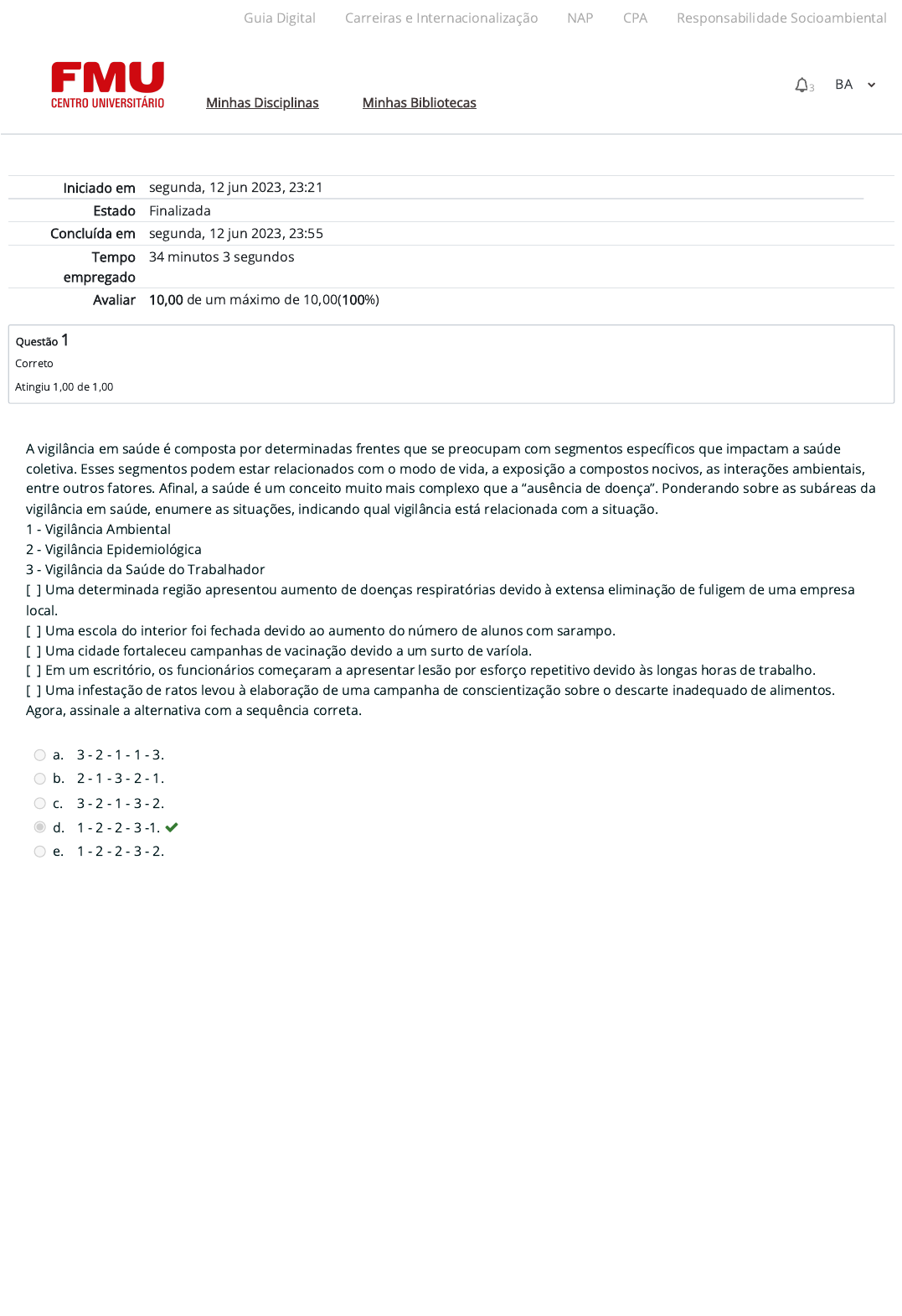 12/06/2023, 23:57 Atividade 4 (A4): Revisão da tentativa https://ambienteacademico.com.br/mod/quiz/review.php?attempt=2500060&cmid=840339 1/5 Iniciado em segunda, 12 jun 2023, 23:21 Estado Finalizada Concluída em segunda, 12 jun 2023, 23:55 Tempo empregado 34 minutos 3 segundos Avaliar 10,00 de um máximo de 10,00(100%) Questão 1 Correto Atingiu 1,00 de 1,00 A vigilância em saúde é composta por determinadas frentes que se preocupam com segmentos especí�cos que impactam a saúde coletiva. Esses segmentos podem estar relacionados com o modo de vida, a exposição a compostos nocivos, as interações ambientais, entre outros fatores. A�nal, a saúde é um conceito muito mais complexo que a “ausência de doença”. Ponderando sobre as subáreas da vigilância em saúde, enumere as situações, indicando qual vigilância está relacionada com a situação. 1 - Vigilância Ambiental 2 - Vigilância Epidemiológica 3 - Vigilância da Saúde do Trabalhador [ ] Uma determinada região apresentou aumento de doenças respiratórias devido à extensa eliminação de fuligem de uma empresa local. [ ] Uma escola do interior foi fechada devido ao aumento do número de alunos com sarampo. [ ] Uma cidade fortaleceu campanhas de vacinação devido a um surto de varíola. [ ] Em um escritório, os funcionários começaram a apresentar lesão por esforço repetitivo devido às longas horas de trabalho. [ ] Uma infestação de ratos levou à elaboração de uma campanha de conscientização sobre o descarte inadequado de alimentos. Agora, assinale a alternativa com a sequência correta. a. 3 - 2 - 1 - 1 - 3. b. 2 - 1 - 3 - 2 - 1. c. 3 - 2 - 1 - 3 - 2. d. 1 - 2 - 2 - 3 -1. e. 1 - 2 - 2 - 3 - 2. Guia Digital Carreiras e Internacionalização NAP CPA Responsabilidade Socioambiental Minhas Disciplinas Minhas Bibliotecas 3 BA https://codely-fmu-content.s3.amazonaws.com/Moodle/GuiaDigital/Guia+digital/index.html https://carreiras.fmu.br/ https://codely-fmu-content.s3.amazonaws.com/Moodle/NAP/inicial/nap/fmu/index.html https://codely-fmu-content.s3.amazonaws.com/Moodle/CPA/landing_CPA/index.html https://portal.fmu.br/sustentabilidade https://ambienteacademico.com.br/ https://ambienteacademico.com.br/ https://ambienteacademico.com.br/course/view.php?id=236 12/06/2023, 23:57 Atividade 4 (A4): Revisão da tentativa https://ambienteacademico.com.br/mod/quiz/review.php?attempt=2500060&cmid=840339 2/5 Questão 2 Correto Atingiu 1,00 de 1,00 Questão 3 Correto Atingiu 1,00 de 1,00 Leia o trecho a seguir. “Ter saneamento básico é um fator essencial para um país poder ser chamado de país desenvolvido. Os serviços de água tratada, coleta e tratamento dos esgotos levam à melhoria da qualidade de vidas das pessoas, sobretudo na saúde infantil com redução da mortalidade infantil, melhorias na educação, na expansão do turismo, na valorização dos imóveis, na renda do trabalhador, na despoluição dos rios e preservação dos recursos hídricos etc.” (TRATA BRASIL, 2020). TRATA BRASIL. O que é saneamento? Instituto Trata Brasil, São Paulo, 2020. Disponível em: http://www.tratabrasil.org.br/saneamento/o- que-e-saneamento. Acesso em: 22 dez. 2020. Sobre o saneamento e a vigilância em saúde, assinale a alternativa correta. a. O saneamento básico é uma medida de eliminação de riscos, sendo considerado a única forma de vigilância ambiental prevista em legislação. b. O saneamento básico ocorre com mais frequência em ambientes menos urbanizados e desenvolvidos, visto que a vigilância ambiental em cidades maiores é mais efetiva. c. O saneamento básico é uma forma de prevenção e controle de doenças da vigilância ambiental, com grande impacto na vigilância sanitária e na qualidade de vida. d. O saneamento básico impacta a saúde ambiental de modo direto e individual, mas não são observados efeitos a longo prazo na saúde coletiva. e. O saneamento básico é obrigatório e faz parte da vigilância legislativa, sendo considerado um tipo de vigilância da saúde do trabalhador. Leia o trecho a seguir. “Moradores do Distrito Federal e das demais unidades da federação participam, a partir desta semana, da coleta de informações da Pesquisa Nacional de Saúde (PNS). Realizado pelo Instituto Brasileiro de Geogra�a e Estatística (IBGE), o estudo atingirá 108 mil domicílios em mais de 2 mil municípios do Brasil até fevereiro de 2020. Ele tem o objetivo de investigar a prevalência de doenças crônicas não transmissíveis e quanti�car a população com incapacidades físicas” (SECRETARIA DE SAÚDE DO DISTRITO FEDERAL, 2019). SECRETARIA DE SAÚDE DO DISTRITO FEDERAL. Coleta de dados para a Pesquisa Nacional de Saúde é iniciada. Secretaria de Saúde do Distrito Federal. Brasília, 2019. Disponível em: http://www.saude.df.gov.br/coleta-de-dados-para-a-pesquisa-nacional-de-saude-e-iniciada/. Acesso em: 22 dez. 2020. Agora, analise as alternativas abaixo. I. A coleta de dados para vigilância é centralizada na esfera federal, e as esferas municipais e estaduais não têm autonomia para coleta, apenas para análise. II. Os planos de controle e prevenção são elaborados a partir da coleta e análise de dados. III. Os dados de coleta são mantidos em sigilo pelas unidades de saúde, não sendo divulgados para a população de modo geral. IV. As etapas de coleta incluem o processamento, a análise, a interpretação de dados e a análise da e�cácia da coleta. V. Os dados podem ser coletados em campanhas (entrevistas) e análises de prontuários. Assinale a alternativa com as alternativas corretas. a. I, II e III. b. I, II e IV. c. III, IV e V. d. I, II e V. e. II, IV e V. Guia Digital Carreiras e Internacionalização NAP CPA Responsabilidade Socioambiental Minhas Disciplinas Minhas Bibliotecas 3 BA http://www.tratabrasil.org.br/saneamento/o-que-e-saneamento http://www.saude.df.gov.br/coleta-de-dados-para-a-pesquisa-nacional-de-saude-e-iniciada/ https://codely-fmu-content