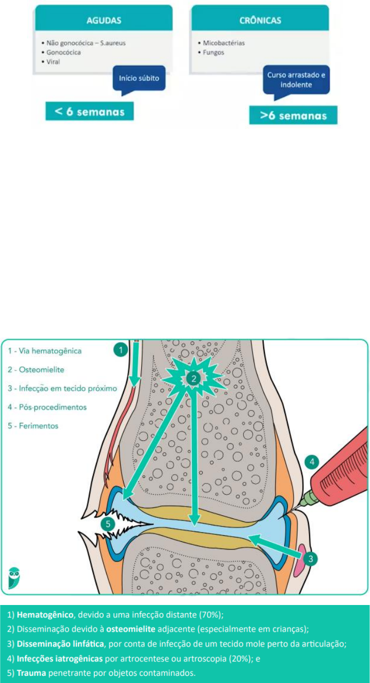 ARTRITES INFECCIOSAS Artrite séptica é sinônimo de infecção em uma articulação • As artrites infecciosas/sépticas: agudas (não gonocócicas e gonocócicas) e crônicas (micobactérias e fungos) • É considerada uma emergência clínica, pois o seu atraso no diagnóstico e/ou tratamento pode levar a uma irreversível destruição articular e aumento de mortalidade. • As artrites bacterianas são didaticamente divididas em não gonocócica e gonocócica FISIOPATOLOGIA A artrite infecciosa ou séptica não gonocócica é frequentemente uma bacteriemia oculta. A sinóvia é altamente vascularizada, e a falta de uma membrana protetora torna -a vulnerável ao crescimento bacteriano. • Geralmente, o patógeno alcança o espaço articular por disseminação hematogênica a partir de um processo infeccioso a distância (p. ex.: pneumonia) • A disseminação por outras vias também pode ser observada: como nos casos em que há osteomielite adjacente (sobretudo em crianças), inoculação direta de bactérias na articulação por meio de artrocentese ou artroscopia (iatrogênica) ou por trauma penetrante. Consequências: • A proliferação bacteriana no líquido sinovial induz aumento da atividade fagocítica dos polimorfonucleares e das células sinoviais. • Dentro de poucas horas, a sinóvia torna--se infectada, levando à sua proliferação e provocando degradação enzimática, neovascularização e desenvolvimento do tecido de granulação. • À medida que elementos purulentos se acumulam, a pressão intra--articular aumenta e o fluxo sanguíneo sinovial fica tamponado, resultando em anóxia dessa cartilagem e contribuindo para a necrose da cartilagem. ETIOLOGIA • Bactérias Gram--positivas (75 a 80%) predominam como agente etiológico mais prevalente nas artrites sépticas não gonocócicas. • Principal agente: S. aureus (60%), seguido do estreptococo beta--hemolítico (30%). • Bacilos Gram--negativos, como E. coli, Klebsiella pneumoniae, Salmonella spp. e Pseudomonas spp, são encontrados em grupos de risco, enquanto a Pseudomonas aeruginosa é mais comumente observada em usuários de drogas IV. • Bactérias anaeróbias (geralmente após mordeduras humanas e quando úlceras de decúbito ou abscessos intra--abdominais disseminam--se para articulações adjacentes) QUADRO CLÍNICO • Em geral, o acometimento é monoarticular (80-90%), de início súbito, doloroso, com derrame articular extenso e limitação dos movimentos ativos e passivos da articulação pela dor • Quadro febril de instalação súbita, calafrios quando há bacteriemia e queda do estado geral. • Articulação: Calor, vermelhidão e edema com prejuízo variável da mobilidade. • Principais articulações: joelhos (50%) e quadris (15%) • Tornozelo (9%), cotovelo (8%), punho (6%) e ombro (5%). • O envolvimento poliarticular é visto em cerca de 10 a 20% dos casos, principalmente nos portadores de quadros gonocócicos • O acometimento do esqueleto axial é raro. Nas crianças menores de 2 anos, o quadro clínico inicial pode ser sistêmico, com: • febre, irritabilidade, anorexia, espasmo muscular e pseudoparalisia do membro envolvido. LABORATÓRIO • Hemoculturas (positivas em até 50% dos casos) • Hemograma (leucocitose) • velocidade de hemossedimentação (VHS) (elevado) • proteína C reativa (elevado) EXAMES DE IMAGEM Radiografia simples, ultrassonografia, cintilografia óssea, tomografia computadorizada e ressonância magnética. Estas modalidades, embora avaliem a integridade da articulação, a presença e a extensão de inflamação, não oferecem de forma acurada a distinção entre infecção e inflamação • A radiografia simples é de pouco auxílio, podendo revelar edema periarticular, deslocamento muscular por distensão da cápsula e até subluxação. • A ultrassonografia é de especial ajuda em casos de dúvida de diagnóstico clínico e em articulações de difícil avaliação, como o quadril. Esse exame detecta derrames articulares precocemente, podendo ainda servir de orientação para a escolha do melhor local de punção. DIAGNÓSTICO Artrocentese com Análise do líquido sinovial. Análise do líquido sinovial: • Analisa--se a coloração pelo método de Gram, contagem de leucócitos total e diferencial, cultura e pesquisa de cristais • O líquido sinovial deve ser preferencialmente coletado antes do início da antibioticoterapia. • Na artrite séptica bacteriana o fluido sinovial costuma ser purulento, de cor amarelada, opaco, com leucócitos acima de 50.000/mm³, predominando polimorfonucleares. Valores inferiores a 50.000/mm³ podem ser observados em pacientes que estão em vigência ou receberam antibióticos ou imunodeprimidos • A cultura é positiva em mais de 60% dos casos. • Artrite séptica pode coexistir com artropatia por cristais, portanto, a presença destes não exclui infecção. DIAGNÓSTICO DIFERENCIAL O diagnóstico diferencial de artrite séptica bacteriana inclui doenças inflamatórias reumáticas e outras doenças infecciosas dentro de um contexto clínico que envolva mono ou oligoartrite, associada a febre e alteração do estado geral: • Outras artrites infecciosas por micobactérias, fungos, espiroquetas e vírus. • Artropatias por cristais como gota e doença por depósito de pirofosfato de cálcio. • Artrite traumática. • Artrite relacionada às espondiloartrites: reativa, psoriásica, espondilite anquilosante e doença inflamatória intestinal. • Artrite associada a outras doenças autoimunes como artrite reumatoide, lúpus eritematoso sistêmico, doença de Behçet, vasculites sistêmicas. • Artrites associadas a lesões metastáticas e sinovite vilonodular pigmentada A sinovite transitória do quadril é um distúrbio inflamatório autolimitado do quadril que comumente afeta crianças entre 2 e 12 anos de idade. • O diagnóstico diferencial mais importante a descartar é a artrite séptica do q