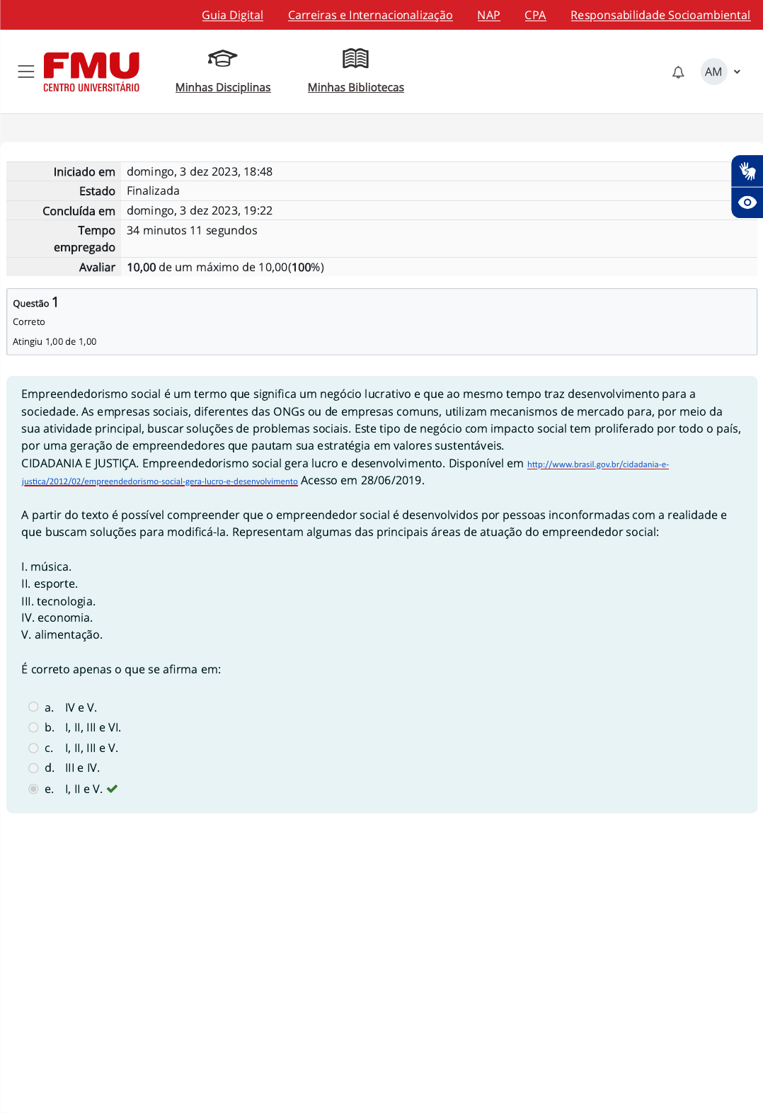 03/12/2023, 18:22 Atividade 4 (A4): Revisão da tentativa https://ambienteacademico.com.br/mod/quiz/review.php?attempt=3506072&cmid=1077505 1/6 Iniciado em domingo, 3 dez 2023, 18:48 Estado Finalizada Concluída em domingo, 3 dez 2023, 19:22 Tempo empregado 34 minutos 11 segundos Avaliar 10,00 de um máximo de 10,00(100%) Questão 1 Correto Atingiu 1,00 de 1,00 Empreendedorismo social é um termo que signi�ca um negócio lucrativo e que ao mesmo tempo traz desenvolvimento para a sociedade. As empresas sociais, diferentes das ONGs ou de empresas comuns, utilizam mecanismos de mercado para, por meio da sua atividade principal, buscar soluções de problemas sociais. Este tipo de negócio com impacto social tem proliferado por todo o país, por uma geração de empreendedores que pautam sua estratégia em valores sustentáveis. CIDADANIA E JUSTIÇA. Empreendedorismo social gera lucro e desenvolvimento. Disponível em h�p://www.brasil.gov.br/cidadania-e- jus�ca/2012/02/empreendedorismo-social-gera-lucro-e-desenvolvimento Acesso em 28/06/2019. A partir do texto é possível compreender que o empreendedor social é desenvolvidos por pessoas inconformadas com a realidade e que buscam soluções para modi�cá-la. Representam algumas das principais áreas de atuação do empreendedor social: I. música. II. esporte. III. tecnologia. IV. economia. V. alimentação. É correto apenas o que se a�rma em: a. IV e V. b. I, II, III e VI. c. I, II, III e V. d. III e IV. e. I, II e V. Guia Digital Carreiras e Internacionalização NAP CPA Responsabilidade Socioambiental Minhas Disciplinas Minhas Bibliotecas AM http://www.brasil.gov.br/cidadania-e-justica/2012/02/empreendedorismo-social-gera-lucro-e-desenvolvimento http://www.brasil.gov.br/cidadania-e-justica/2012/02/empreendedorismo-social-gera-lucro-e-desenvolvimento https://codely-fmu-content.s3.amazonaws.com/Moodle/GuiaDigital/Guia+digital/index.html https://carreiras.fmu.br/ https://codely-fmu-content.s3.amazonaws.com/Moodle/NAP/inicial/nap/fmu/index.html https://codely-fmu-content.s3.amazonaws.com/Moodle/CPA/landing_CPA/index.html https://portal.fmu.br/sustentabilidade https://ambienteacademico.com.br/ https://ambienteacademico.com.br/ https://ambienteacademico.com.br/course/view.php?id=236 03/12/2023, 18:22 Atividade 4 (A4): Revisão da tentativa https://ambienteacademico.com.br/mod/quiz/review.php?attempt=3506072&cmid=1077505 2/6 Questão 2 Correto Atingiu 1,00 de 1,00 Questão 3 Correto Atingiu 1,00 de 1,00 Negócios de impacto social podem atuar tanto no aumento das oportunidades de emprego estável e na melhoria das condições de trabalho do microempreendedor, quanto podem promover oportunidades para que pessoas de baixa renda fortaleçam seu capital humano e social. Além disso, esse tipo de empreendedorismo contribui para o fortalecimento da cidadania por meio de produtos e serviços essenciais para uma qualidade de vida digna. SEBRAE. Diretrizes estratégicas: o SEBRAE no atendimento aos negócios de impacto social - versão 2.0. Brasília, 2016. Considerando as ideias do texto, avalie as asserções a seguir e a relação proposta entre elas. I. O empreendedorismo de impacto social desenvolve-se através de ações sociais que empreendedores inconformados colocam em prática, visando transformar a realidade social de muitas comunidades em nosso país. PORQUE II. Em nosso país, os problemas sociais vêm se avolumando e se agravando e a ausência de ações do Estado acaba por obrigar a população a conviver com a falta de assistência dos órgãos públicos, impelindo alguns empreendedores ao desa�o de transformar essa realidade. A respeito dessas asserções, assinale a opção correta. a. A asserção I é uma proposição falsa, e a II é uma proposição verdadeira. b. As asserções I e II são proposições falsas. c. As asserções I e II são proposições verdadeiras, mas a II não é uma justi�cativa correta da I. d. As asserções I e II são proposições verdadeiras, e a II é uma justi�cativa correta da I. e. A asserção I é uma proposição verdadeira, e a II é uma proposição falsa. Todos os dias entram no mercado centenas de novas empresas, boa parte delas cheias de novas ideias, empreendedores dedicados. Uma combinação perigosa para empresas estagnadas, burocráticas e que não cultivam novas ideias. Por isso, as organizações estão em busca de colaboradores que possam oferecer um “algo mais” para elas, pessoas dedicadas que trabalhem como verdadeiros sócios do negócio, tornando a empresa ainda mais competitiva no médio e longo prazo. Esses colaboradores são classificados como intraempreendedores, um tipo de colaborador que tem sido muito valorizado pelas empresas, principalmente por agregarem valor ao trabalho final executado pela organização. JOAQUIM, A. L. Características do empreendedor e intraempreendedor. Portal Educação. Disponível em: <h�ps://www.portaleducacao.com.br/conteudo/ar�gos/lideranca/caracteris�cas-do-empreendedor-e-intraempreendedor/56175>. Acesso em 27/06/2019. Com base nas ideias do texto pode-se afirmar que o intraempreendedor é a. um empreendedor organizacional que produz um diferencial competitivo e que agrega valor à empresa em que atua como colaborador. b. um forte visionário e saciável gestor, que não descansa até que seu desejo esteja manifestado dentro da empresa. c. o pro�ssional que possui talento su�ciente para ser o primeiro caminho na empresa. d. um colaborador dependente, que pensa e age da mesma forma que os demais colegas, mas que tem necessidade de autorrealização. e. um inventor de novos produtos ou serviços para que a empresa possa se manter competitiva. Guia Digital Carreiras e Internacionalização NAP CPA Responsabilidade Socioambiental Minhas Disciplinas Minhas Bibliotecas AM https://www.portaleducacao.com.br/conteudo/artigos/lideranca/caracteristicas-do-empreendedor-e-intraempreendedor/56175 https://codely-fmu-content.s3.