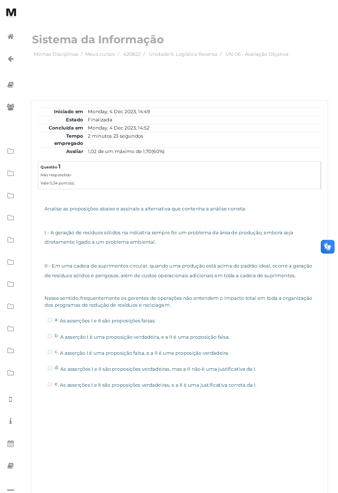 04/12/23, 18:37 UN 06 - Avaliação Objetiva: Revisão da tentativa https://avap.multivix.edu.br/mod/quiz/review.php?attempt=4619180&cmid=1538348 1/5 Minhas Disciplinas / Meus cursos / 420822 / Unidade 6: Logística Reversa / UN 06 - Avaliação Objetiva Sistema da Informação Iniciado em Monday, 4 Dec 2023, 14:49 Estado Finalizada Concluída em Monday, 4 Dec 2023, 14:52 Tempo empregado 2 minutos 23 segundos Avaliar 1,02 de um máximo de 1,70(60%) Questão 1 Não respondido Vale 0,34 ponto(s). Analise as proposições abaixo e assinale a alternativa que contenha a análise correta: I - A geração de resíduos sólidos na indústria sempre foi um problema da área de produção, embora seja diretamente ligado a um problema ambiental. II - Em uma cadeia de suprimentos circular, quando uma produção está acima do padrão ideal, ocorre a geração de resíduos sólidos e perigosos, além de custos operacionais adicionais em toda a cadeia de suprimentos. Nesse sentido, frequentemente os gerentes de operações não entendem o impacto total em toda a organização dos programas de redução de resíduos e reciclagem. a. As asserções I e II são proposições falsas. b. A asserção I é uma proposição verdadeira, e a II é uma proposição falsa. c. A asserção I é uma proposição falsa, e a II é uma proposição verdadeira. d. As asserções I e II são proposições verdadeiras, mas a II não é uma justi�cativa da I. e. As asserções I e II são proposições verdadeiras, e a II é uma justi�cativa correta da I. https://avap.multivix.edu.br/my/ https://avap.multivix.edu.br/course/view.php?id=24027 https://avap.multivix.edu.br/course/view.php?id=24027§ion=7 https://avap.multivix.edu.br/mod/quiz/view.php?id=1538348 https://avap.multivix.edu.br/my/ https://avap.multivix.edu.br/course/view.php?id=24027 https://avap.multivix.edu.br/user/index.php?id=24027 https://avap.multivix.edu.br/course/view.php?id=24027§ion=1 https://avap.multivix.edu.br/course/view.php?id=24027§ion=2 https://avap.multivix.edu.br/course/view.php?id=24027§ion=3 https://avap.multivix.edu.br/course/view.php?id=24027§ion=4 https://avap.multivix.edu.br/course/view.php?id=24027§ion=5 https://avap.multivix.edu.br/course/view.php?id=24027§ion=6 https://avap.multivix.edu.br/course/view.php?id=24027§ion=7 https://avap.multivix.edu.br/course/view.php?id=24027§ion=8 https://avap.multivix.edu.br/course/view.php?id=24027§ion=9 https://avap.multivix.edu.br/course/view.php?id=24027§ion=10 https://avap.multivix.edu.br/course/view.php?id=24027§ion=11 https://avap.multivix.edu.br/hooks/portal/ https://avap.multivix.edu.br/mod/page/view.php?id=1252%2F%22%20target%3D%22_blank https://avap.multivix.edu.br/calendar/view.php/ https://avap.multivix.edu.br/local/staticpage/view.php?page=biblioteca https://multivix.edu.br/office-365/ https://avap.multivix.edu.br/ https://avap.multivix.edu.br/ https://avap.multivix.edu.br/ https://avap.multivix.edu.br/ https://avap.multivix.edu.br/ https://avap.multivix.edu.br/ 04/12/23, 18:37 UN 06 - Avaliação Objetiva: Revisão da tentativa https://avap.multivix.edu.br/mod/quiz/review.php?attempt=4619180&cmid=1538348 2/5 Questão 2 Incorreto Atingiu 0,00 de 0,34 A logística reversa, assim como a tradicional, se refere aos �uxos de produção de produtos, da aquisição até o consumidor �nal. Nesse sentido, analise as proposições a seguir: I - Se nenhum material estiver sendo enviado "para trás" na cadeia de suprimentos, a atividade provavelmente não é uma atividade de logística reversa. Por que A logística reversa se refere às mesmas atividades da logística tradicional, com a diferença que o sentido do �uxo é contratário, ou seja, do consumidor �nal para a aquisição. Escolha uma opção: As duas assertivas são verdadeiras e a segunda não justi�ca a primeira A primeira assertiva é verdadeira e a segunda é falsa A primeira assertiva é falsa e a segunda é verdadeira. As duas assertivas são verdadeiras e a segunda justi�ca a primeira. As duas assertivas são falsas. https://avap.multivix.edu.br/my/ https://avap.multivix.edu.br/course/view.php?id=24027 https://avap.multivix.edu.br/user/index.php?id=24027 https://avap.multivix.edu.br/course/view.php?id=24027§ion=1 https://avap.multivix.edu.br/course/view.php?id=24027§ion=2 https://avap.multivix.edu.br/course/view.php?id=24027§ion=3 https://avap.multivix.edu.br/course/view.php?id=24027§ion=4 https://avap.multivix.edu.br/course/view.php?id=24027§ion=5 https://avap.multivix.edu.br/course/view.php?id=24027§ion=6 https://avap.multivix.edu.br/course/view.php?id=24027§ion=7 https://avap.multivix.edu.br/course/view.php?id=24027§ion=8 https://avap.multivix.edu.br/course/view.php?id=24027§ion=9 https://avap.multivix.edu.br/course/view.php?id=24027§ion=10 https://avap.multivix.edu.br/course/view.php?id=24027§ion=11 https://avap.multivix.edu.br/hooks/portal/ https://avap.multivix.edu.br/mod/page/view.php?id=1252%2F%22%20target%3D%22_blank https://avap.multivix.edu.br/calendar/view.php/ https://avap.multivix.edu.br/local/staticpage/view.php?page=biblioteca https://multivix.edu.br/office-365/ https://avap.multivix.edu.br/ https://avap.multivix.edu.br/ https://avap.multivix.edu.br/ https://avap.multivix.edu.br/ https://avap.multivix.edu.br/ https://avap.multivix.edu.br/ 04/12/23, 18:37 UN 06 - Avaliação Objetiva: Revisão da tentativa https://avap.multivix.edu.br/mod/quiz/review.php?attempt=4619180&cmid=1538348 3/5 Questão 3 Correto Atingiu 0,34 de 0,34 Com o avanço da área de saúde e da tecnologia, a população acaba vivendo mais e consumindo mais. Nesse sentido, com a alta rotatividade de tecnologia e taxas de obsolescência, milhares de produtos são descartados anualmente no mundo. Sendo assim, analise as a�rmativas referentes ao descarte tecnológico. I - Os telefones celulares, iPads, laptops e similares contêm muitos materiais tóxicos, incluindo cádmio, chumbo, arsênico e mercúrio, que são