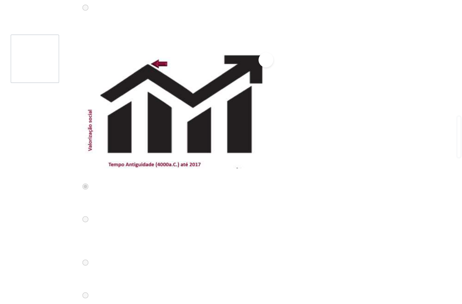 Questão 5 Completo Atingiu 0,00 de 1,00 e. As línguas de sinais possuem apenas sinais referentes a imagens. Observe a imagem a seguir e assinale a alternativa correta: a. A imagem mostra como os surdos foram desvalorizados na história somente a partir do Congresso de Milão, no ano de 1880, com a proibição das línguas de sinais a nível mundial. b. O gráfico revela uma perspectiva sobre a valorização e desvalorização dos surdos a nível mundial, destacando com a seta pequena o marco do Congresso de Milão, no ano de 1880, mas o Brasil não sofreu consequências referentes às decisões tomadas pelo Congresso. c. O gráfico não se restringe à história dos surdos, aborda sobre a valorização e desvalorização que as pessoas com deficiência sofreram ao longo dos anos, com a realidade no Brasil e no mundo. d. A imagem representa o marco histórico que os surdos alcançaram com a Lei do ano de 2002 D t d d 2005 Lí d Si i f i h id B il