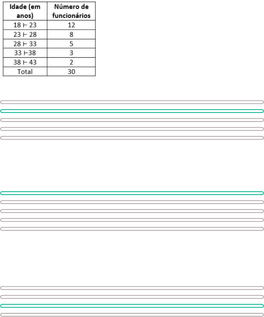 Questão 1 A tabela a seguir mostra os resultados de uma pesquisa sobre a idade dos funcionários de uma loja de produtos esportivos. Com base nessa tabela, assinale a alternativa que apresenta a quantidade de funcionários com idade igual ou superior à 33 anos. A) 18. B) 5. C) 10. D) 30. E) 12.Questão 2 Um comerciante com o objetivo de analisar o peso de suas caixas de bananas, seleciona 11 caixas e mensura o peso das mesmas obtendo os seguintes resultados: 23; 20; 21; 20; 21; 23; 22, 21; 24; 22; 21. Portanto, foi necessário calcular a moda e mediana dos pesos observados, os valores encontrados foram: A) Moda: 21 e mediana: 21 B) Moda: 21 e mediana: 20 C) Moda: 20 e mediana: 21 D) Moda: 22 e mediana: 23 E) Moda: 20 e mediana: 20Questão 3 Os dados a seguir representam os gastos com gás de cozinha de um restaurante italiano de um determinado bairro de São Paulo, no 1o semestre de 2018. R$550,00 - R$550,00 - R$420,00 - R$380,00 - R$400,00 - R$450,00 Com base nesses dados, assinale a alternativa que apresenta o gasto médio, em reais, que o restaurante teve nesse período. A) R$525,34. B) R$461,27. C) R$458,33. D) R$550,00. E) R$540,00.Questão 4 Uma empresa de táxi cobra pela corrida um valor fixo de R$5,20 (bandeirada), mais um valor variável de R$4,60 por quilômetro rodado. Assinale a alternativa que apresenta a lei de formação da função que retorna o preço f(x) para uma distância x percorrida. A) f(x) =5,20x + 4,60. B) f(x) = 4,60x. C) f(x) = 4,60x + 5,20. D) f(x) = 9,80x. E) f(x) = 5,20.Questão 5 O custo de produção em uma fábrica de chocolates é estimado pelo seguinte modelo matemático C(x) = 10x + 1500, na qual C(x) indica o custo de produção em reais e x a quantidade de máquinas funcionando por dia. Assinale a alternativa que apresenta a quantidade de máquinas que devem funcionar diariamente para que a fábrica tenha um custo de R$1.660,00. A) 15 máquinas. B) 10 máquinas. C) 17 máquinas. D) 18 máquinas. E) 16 máquinas.Questão 6 O gráfico abaixo representa o consumo anual de energia elétrica em determinada empresa. Fonte: http://mundoeducacao.bol.uol.com.br/matematica/tipos-graficos-1.htm Este gráfico deve ser classificado como: A) Gráfico de Barras B) Gráfico de Setores C) Pictograma http://mundoeducacao.bol.uol.com.br/matematica/tipos-graficos-1.htm D) Gráfico de Pizza E) Gráfico de LinhasQuestão 7 A variável: "peso de um determinado produto" deve ser classificada como: A) Qualitativa Nominal B) Quantitativa Contínua C) Quantitativa Nominal D) Qualitativa Ordinal E) Quantitativa DiscretaQuestão 8 Assinale a alternativa que apresenta uma variável qualitativa ordinal. A) cor dos olhos B) número de bactérias por litro de leite C) doente/sadio D) estágio de uma doença (inicial, intermediário, terminal) E) sexoQuestão 9 A média aritmética é considerada uma medida de tendência central e é muito utilizada no cotidiano. Esse tipo de cálculo é muito utilizado em campeonatos de futebol no intuito de determinar a média de gols da rodada, nas escolas calculando a média final dos alunos, também é utilizado nas pesquisas estatísticas, pois a média dos resultados determina o direcionamento das ideias expressas pelas pessoas pesquisadas. Veja a seguir os gastos de uma pessoa com alimentação, de 2ª feira a sábado, em uma determinada semana: 2ª feira: R$ 12,00 – 3ª feira: 15,00 – 4ª feira: R$ 10,00 – 5ª feira: R$ 14,00 – 6ª feira: R$ 13,00 – sábado: R$ 14,00. Calcule a média diária, a moda e a mediana de gastos. A) Média = R$ 13,00, Moda = R$ 14,00, Mediana = R$ 13,50 B) Média = R$ 13,00, Moda = R$ 15,00, Mediana = R$ 12,50 C) Média = R$ 12,00, Moda = R$ 13,00, Mediana = R$ 14,00 D) Média = R$ 14,00, Moda = R$ 12,00, Mediana = R$ 14,00 E) Média = R$ 12,00, Moda = R$ 13,50, Mediana = R$ 12,50Questão 10 Luana trabalha num supermercado como caixa e ao receber seu salário uma parte do mesmo é destinado ao pagamento de contas diversas. Sabendo que estas contas equivalem a R$ 750,00 e que o seu salário é de R$ 2.500,00, pode-se afirmar que a porcentagem do seu salário a ser gasta com pagamento de contas é de? Assinale a alternativa correta. A) 40%. B) 25%. C) 20%. D) 30%. E) 10%.Questão 11 Para obter os zeros de uma função quadrática, quando existem, utilizamos a fórmula do discriminante, popularmente conhecida como Fórmula de Bháskara. Seja f(x) = ax + bx + c uma função quadrática. Se: a > 0, o gráfico tem concavidade ______________, e o vértice é seu ponto ________________; a < 0, o gráfico tem concavidade __________________, e o vértice e seu ponto ______________. Qual alternativa completa os espaços da questão adequadamente? 2 A) Voltada para cima – nulo – voltada para baixo – negativo B) Voltada para baixo – positivo – voltado para cima - inexistente C) Voltada para baixo – mais baixo – voltada para cima – mais alto D) Voltada para cima – negativo – voltada para baixo – nulo E) Voltada para cima – mais baixo – voltada para baixo – mais altoQuestão 12 O conjunto abaixo, apresenta dados referentes aos números dos sapatos usados por algumas clientes de uma loja de calçados. 37 - 36 - 37 - 37 - 38 - 38 - 38 - 37 - 39 - 40 Assinale a alternativa que apresenta, respectivamente, a média aritmética, a moda e a mediana desse conjunto de dados. A) 37,7 - 37 - 37,5. B) 37 - 37 - 37. C) 37 - 38 - 37,5. D) 35 - 37 - 39. E) 36 - 37,5 - 38.Questão 13 As temperaturas registradas em uma semana em São Paulo foram de 22°C, 23°C, 19°C, 21°C, 24°C, 19°C e 26°C. A temperatura média e a moda nessa semana foram dadas por: A) Média: 26°C e Moda: 20 B) Média: 23°C e Moda: 19 C) Média: 25°C e Moda: 20 D) Média: 22°C e Moda: 19 E) Média: 26°C e Moda: 18Questão 14 A Estatística fornece métodos para coleta, organização, descrição, análise e interpretação dos dados, em que os mesmos são utilizados para a tomada de decisão. Para realizar a coleta de dados o