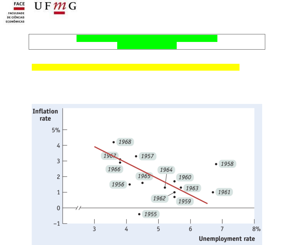 Página 2 de 100 ECN Departamento de Ciências Econômicas Aula 29 – Inflação e Desemprego no Curto Prazo (Krugman – Cap. 31) Curva de Phillips no Curto Prazo: trade-off entre inflação e desemprego As mudanças na demanda agregada podem elevar a inflação e reduzir o desemprego no curto prazo - uma relação ilustrada pela curva de Phillips. Desemprego e Inflação nos EUA (1955-1968) Os formuladores de políticas preferem inflação baixa e desemprego baixo, mas os dados históricos resumidos pela curva de Phillips indicam que essa combinação é improvável, rara ou temporária. Como comentado anteriormente, é difícil manter uma economia capitalista no Éden Econômico: baixa inflação, elevado emprego e crescimento com distribuição de renda. A curva de Phillips oferece aos formuladores de políticas um menu de resultados econômicos possíveis. Ao alterar a política monetária e fiscal para influenciar a demanda agregada. Os formuladores de políticas poderiam escolher qualquer ponto dessa curva, mas ocorrerá, um trade-off com custos e ganhos políticos. O ponto A oferece alto desemprego e baixa inflação. O ponto B oferece baixo desemprego e alta inflação. Página 3 de 100 ECN Departamento de Ciências Econômicas Demanda e Oferta Agregada O modelo de demanda agregada e oferta agregada fornece uma explicação para o menu de resultados possíveis descritos pela curva de Phillips. A curva de Phillips mostra as combinações de inflação e desemprego que surgem no curto prazo, à medida que mudanças na curva da demanda agregada movem a economia ao longo da curva da oferta agregada de curto prazo. Um aumento na demanda agregada de bens e serviços leva, no curto prazo, a uma maior produção de bens e serviços e a um nível de preços mais alto, em particular quando a economia está próxima ao pleno emprego. Maior produção significa maior emprego ou menor taxa de desemprego. Uma redução na demanda agregada de bens e serviços leva a uma reduçãona produção de bens e serviços, eleva os estoques e induz uma redução de preços; quando a economia está longe do pleno emprego, esta redução pode ser menor. Obviamente, menor produção significa menor emprego e maior capacidade ociosa. Quando a política monetária e/ou a política fiscal são expansionistas, ocorre um deslocamento a curva de demanda agregada para a direita de AD1 para AD2, o equilíbrio se move do ponto E1 para o ponto E2. No pleno emprego, os salários e preços nominais se ajustam para cima e empurram a curva SRAS1 para a esquerda para SRAS2. O aumento percentual total no nível de preços de P1 a P2 e a P3 reduzem a demanda agregada real via inflação. O nível de preços sobe de P1 para P3, a curva de oferta agregada é vertical e a produção permanece a mesma. Página 4 de 100 ECN Departamento de Ciências Econômicas Repetindo... Aumentos na disponibilidade de crédito, reduções nas taxas de juros, aumento do gasto público, do consumo das famílias, das exportações ou do investimento deslocam a demanda agregada para a direita, conforme mostrado pelo movimento de AD1 para AD2. Há um novo equilíbrio macroeconômico de curto prazo em E2 e um nível de preço mais alto em P2. Com elevado nível de ociosidade (desemprego), é possível ter até manutenção de preços com aumento da produção e demanda. O aumento de preços será modesto e podem ocorrer aumentos significativos de emprego e produção. Neste caso, políticas expansionistas (fiscais, monetárias e de financiamento) tendem a ter um efeito mais significativo no nível de atividade. Caso a economia esteja próxima ao pleno emprego, será observado forte aumento de preço generalizado (inflação) com nível de emprego e produção constantes. Neste caso, políticas expansionistas (fiscais, monetárias e de financiamento) tendem a ter um efeito mais significativo no nível de preços. Quando a economia é aberta (importação e exportação), demanda além do pleno emprego tende a criar déficits na balança comercial. Déficits na balança comercial induz a desvalorização da moeda. e, assim, aumento de preços dos produtos tradables, em outras palavras, surgem pressões inflacionárias em parte significativa da oferta agregada. Página 5 de 100 ECN Departamento de Ciências Econômicas Mudanças na curva de Phillips Choque de demanda: um aumento da curva de demanda induzido por políticas expansionistas (monetárias e fiscais) podem gerar inflação, em particular quando a economia está próxima ao pleno emprego. Choque de oferta, um evento que altera diretamente os custos e preços das empresas, mudando a curva de oferta agregada da economia e, portanto, a curva de Phillips. Esses choques podem ser internos ou externos, mas são choques de custos. Choque de oferta internos. Nível de utilização elevado ou restrição de oferta. Preços de insumos e serviços domésticos se elevam sem aumento da oferta. Aumento de custos e pressão nos preços. Por exemplo, restrição na oferta de trabalho, energia, combustíveis, transporte etc. Choque de preços internacionais. Os preços de produtos exportados em US$ aumenta, assim como os preços dos produtos importados em US$. Choque da taxa de câmbio. Desvalorizações cambiais tendem a encarecer os produtos exportados, assim como produtos importados, mesmo que os preços internacionais não mudem. Valorizações cambiais tem efeito inverso. Choque de juros internacionais. Aumento de juros nos mercados internacionais tendem atrair capitais e produzir uma saída de US$ e, portanto, uma desvalorização da moeda nacional. A desvalorização induz aumento de preços nos produtos Página 6 de 100 ECN Departamento de Ciências Econômicas tradables. O painel (a) mostra o modelo de demanda agregada e oferta agregada. Quando o a curva de oferta agregada tem um choque de custos, ocorre um deslocamento para a esquerda de AS1 para AS2, o equilíbrio se move do ponto A para o ponto 