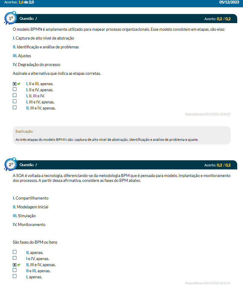 O modelo BPMN é utilizado para processos organizacionais. O modelo BPMN consiste em quatro etapas. As etapas do modelo BPMN são: captura de alto nível de abstração, identificação e análise de problemas, ajustes e degradação do processo. Deve-se assinalar a alternativa que indica as etapas corretas. a) I, II e IV. b) I, II, III e IV. c) II, III e IV. d) I, III e IV.