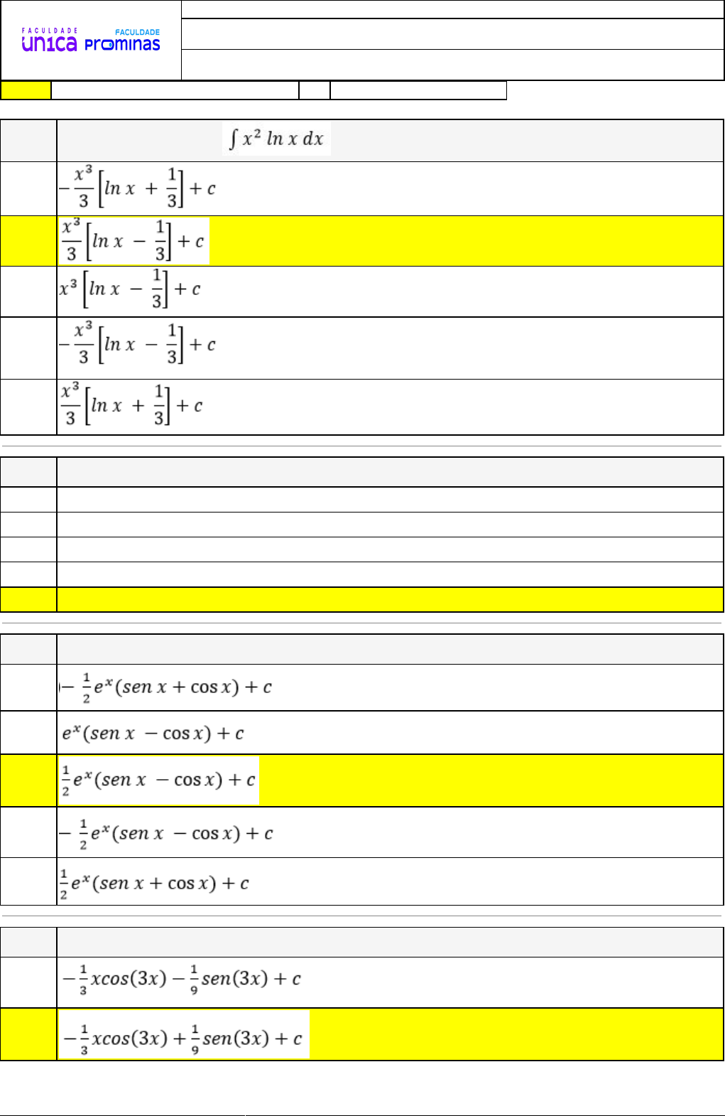 30/11/2023 15:36:39 1/3 REVISÃO DE SIMULADO Nome: ROBERTO DA SILVA JUNIOR Disciplina: Cálculo II Respostas corretas são marcadas em amarelo X Respostas marcardas por você. Questão 001 Calculando a integral pelo método da integração por partes, teremos : A) X B) C) D) E) Questão 002 Calculando a integral ∫π x sen 2x dx pelo método da integração por partes, teremos: X A) π/4 B) π/3 C) –π/2 D) –π/4 E) π/2 Questão 003 Calculando a integral ∫ex sen(x) dx pelo método da integração por partes, teremos: A) B) X C) D) E) Questão 004 Calculando a integral ∫ xsen(3x) dx pelo método da integração por partes, teremos: A) X B) 30/11/2023 15:36:39 2/3 C) D) E) Questão 005 Calculando a integral pelo método da integração por partes, teremos : X A) B) C) D) E) Questão 006 Calculando a integral pelo método da integração por partes, teremos : X A) 1 B) -1 C) 2 D) - 2 E) 0 Questão 007 Calculando a integral pelo método da integração por partes, teremos : A) B) 1 C) D) 30/11/2023 15:36:39 3/3 X E) Questão 008 Calculando a integral ∫ x 2 ex dx pelo método da integração por partes, teremos: A) x2ex – 2xex + 2ex + c B) – x2 ex – 2xex – 2ex + c C) – x2ex + 2xex + 2ex + c X D) x2ex – 2xex – 2ex + c E) x2ex + 2xex – 2ex + c