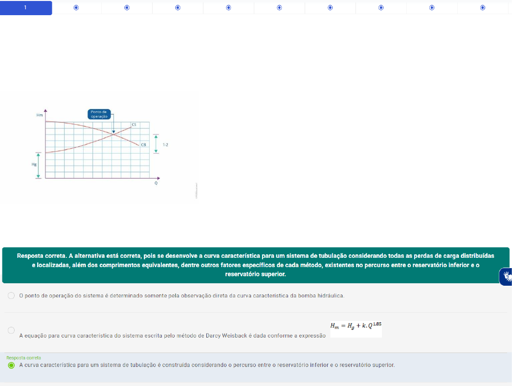 Por mais ampla que seja a faixa de trabalho de uma bomba, seu ponto de operação será definido levando em consideração os parâmetros hidráulicos de toda instalação hidráulica. Assim, o ponto de operação será obtido por meio da interseção da curva característica da bomba, com a curva característica do sistema de tubulações. Na sequência, a figura mostra que a intercepção da curva do sistema com a curva da bomba dará origem ao ponto de operação. Ao ter em vista o seu conhecimento sobre as curvas características das bombas e do sistema de tubulação, bem como o ponto de operação do conjunto, assinale a alternativa correta. Um dos critérios mais considerados para a seleção de bombas faz uso do ábaco que relaciona potência com vazão de fluido bombeado. Essa análise permite encontrar o diâmetro de rotor adequado e, em seguida, o modelo de bomba mais adequado. Deve-se, portanto, escolher o modelo mais compatível do fabricante. Um exemplo de “ábaco de cobertura” potência versus vazão, do fabricante KSB, está representado na figura evidenciada na sequência. Considerando o ábaco de cobertura KSB para a seleção do diâmetro do rotor, analise as afirmativas a seguir e assinale V para a(s) verdadeira(s) e F para a(s) falsa(s). I. ( ) Para a potência de 2,5 cv e vazão de 22 m³/h, o diâmetro de rotor mais adequado para a bomba seria de 208 mm. II. ( ) Para a potência de 5 cv e vazão de 26 m³/h, o diâmetro de rotor mais adequado para a bomba seria de 260 mm. III. ( ) Para a potência de 5 cv e vazão de 30 m³/h, o diâmetro de rotor mais adequado para a bomba seria de 234 mm. IV. ( ) Para a potência de 2,5 cv e vazão de 10 m³/h, o diâmetro de rotor mais adequado para a bomba seria de 234 mm. Assinale a alternativa que apresenta a sequência correta. A teoria dos modelos, juntamente com a análise de semelhança mecânica, busca diminuir o risco dos erros na execução de projeto das máquinas de grande porte, pois permite o estudo de modelos reduzidos. Essa teoria é utilizada, também, para avaliar o desempenho real de diversas máquinas de hidráulicas ditas como semelhantes. Entretanto, para que o teste do modelo forneça dados confiáveis para prever o comportamento do protótipo, alguns requisitos básicos precisam ser atendidos. Considerando o exposto, bem como o seu conhecimento sobre análise dimensional e semelhança de bombas, analise as afirmativas a seguir. I. Os requisitos básicos que precisam ser atendidos são: a semelhança dinâmica, a semelhança cinemática e a semelhança geométrica, entre o protótipo e o modelo. II. Na maioria das vezes, realizar experimentos ou testes com protótipos em tamanho real é inviável. Diante disso, a maneira de se avaliar o comportamento do protótipo é por meio de testes dos modelos em laboratório. III. Define-se a constante cinemática K como a soma entre as dimensões lineares L do protótipo e do modelo. IV. A formulação matemática da velocidade específica de uma bomba não leva em consideração a teoria de semelhança mecânica, já que esse parâmetro é puramente experimental. Está correto o que se afirma em: No estudo da análise dimensional e semelhança de bombas hidráulicas, é importante reforçar que qualquer variação nas dimensões de uma bomba influenciará, em muito, as grandezas: potência, altura manométrica e vazão. Esse fato é evidenciado pelas equações destacadas na sequência. Uma bomba hidráulica modelo, com rotor de 220 mm de diâmetro, recalcou água até uma altura manométrica de 19 m, quando a rotação do motor de acionamento era de 1.400 rpm. Será instalada uma bomba protótipo, geometricamente semelhante, com diâmetro de rotor igual a 260 mm, girando a 1.650 rpm. O fluido e as demais condições cinemáticas e dinâmicas foram mantidas constantes. Sobre os valores dos parâmetros hidráulicos presentes nas equações de semelhança, assinale a alternativa correta. Devido à grande quantidade de bombas existentes, não há um único método para realizar a escolha de forma mais adequada. Entretanto, os critérios mais considerados para a seleção das bombas são: altura manométrica, característica do fluido, vazão, características da instalação, dentre outros. Após a definição do tipo de bomba, deve-se escolher o modelo mais compatível do fabricante ao atendimento da instalação. Um exemplo de “ábaco de cobertura” do fabricante KSB está ilustrado na figura evidenciada na sequência. Considerando o ábaco de cobertura KSB para a escolha do modelo de bomba, analise as afirmativas a seguir e assinale V para a(s) verdadeira(s) e F para a(s) falsa(s). I. ( ) Para a altura manométrica de 25m e vazão de 9m³/h, o modelo 40-250 seria o mais indicado. II. ( ) Para a altura manométrica de 20m e vazão de 4m³/h, o modelo 32-200 seria o mais indicado. III. ( ) Para a altura manométrica de 19m e vazão de 200m³/h, o modelo 80-200 seria o mais indicado. IV. ( ) Para a altura manométrica de 10m e vazão de 6m³/h, o modelo 40-160 seria o mais indicado. Assinale a alternativa que apresenta a sequência correta. A teoria e as relações matemáticas de semelhança mecânica têm como propósito diminuir o risco dos erros na execução de projeto, pois permitem o estudo em modelos reduzidos; assim, será possível avaliar o desempenho real de diversas máquinas de hidráulicas ditas como semelhantes. Na sequência, são mostradas algumas equações de semelhança que relacionam vazão, rotação, altura manométrica e potência. A respeito das relações matemáticas de semelhança mecânica, analise as afirmativas a seguir e assinale V para a(s) Verdadeira(s) e F para a(s) Falsa(s). I. ( ) Valores de K maiores do que 1 indicam que o protótipo será maior do que o modelo. II. ( ) O valor de K maior do que 1 pode ser um indício de que o protótipo irá obter maior altura manométrica do que o modelo, mantendo-se a rotação constante