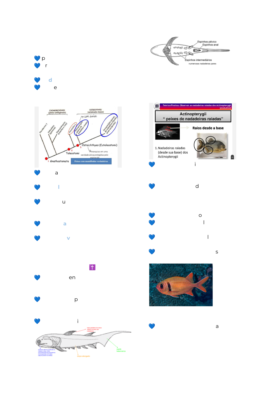 Prov� 2 BAN202 Osteichthye� 💙 peixes ósseos 💙 brânquias em uma cavidade única protegidas pelo operculo 💙 nadadeiras raiadas 💙 nome não é apropriado: existem outros grupos com presença de tecido ósseo (placodermi) 💙 animais de vértebras ossificadas, ectotérmicos 💙 esqueleto ósseo substitui a cartilagem 💙mandíbulas e maxilas bem desenvolvidas e articuladas com o crânio 💙 presença de pulmões ou bexiga natatória 💙maioria ovípara de reprodução e fertilização externa Acanthodi� ✝ 💙 primeiramente em ambientes marinhos e depois em todos os meios aquáticos 💙 incluídos no primeiro grupo de animais a apresentaremmandíbulas verdadeiras 💙 “tubarões espinhados” Actinopterygi� introdução 💙 peixes são praticamente o maior grupo entre os vertebrados (actino é maior) 💙 nadadeiras raiadas desde a base, e o número de espinhos (aculho, defesa) e raios ajudam a classificar a espécie 💙 esqueleto interno calcificado 💙 abertura branquial protegida por opérculo ósseo 💙 peixes mais especializados com taxonomia completa 💙 podem habitar todos os ambientes aquáticos aspectos evolutivos e características gerais 💙 anteriormente os animais tinham carapaça, nadadeira assimétrica (heterocerca) locomoção 💙musculatura: músculos com contrações sequenciais (craniocaudal), variedade de modos de natação e manobras, ondulações laterais do corpo (oscilação das nadadeiras) 💙 escamas: menores, mais leves e flexíveis, redução dos ossos dérmicos origem mesodérmica, redução do peso, aumento da flexibilidade, melhor locomoção, maior agilidade, ciclóides menos derivadas e ctenoides mais derivadas com espinho, quando não presentes são peixes de couro com placas ósseas (bagre) 💙 pele: rica emmuco, inúmeras glândulas mucosas que facilita a locomoção e protege 💙 nadadeiras: não são responsáveis pela natação verdadeira do animal (músculos), raiadas desde a base, estabilidade/repouso, 2 grupos pares 4 grupos ímpares, peitorais ajudam na reprodução com o fluxo, ajudam a predação e funcionam como órgão sensoriais 💙nadadeira caudal: mais simétrica e homocerca, direciona os animais, movimentos mais precisos, guia para onde vai, maior ligação com espinhos e ossos da extremidade da coluna, maior concentração de músculos na cauda (mais velocidade) mandíbulas 💙 a procura do alimento ocasionou a origem de importantes especializações: mandíbulas, aumentou a predação 💙 carapaça óssea diminuiu e alterou, formando uma cavidade coberta por opérculo (articulado, região duto faríngeo) 💙 sucção (mais eficiente) 💙 perdem os dentes ou são substituídos por estruturas mais flexíveis 💙 aumento na pré maxila em relação à maxila 💙 cavidade oro branquial se expande para buscar o alimento 💙 tem uma força maior de sucção, e o mecanismo de apreensão é aperfeiçoado: protrusão (evolução independente commorfologia diferente para cada grupo), deslizamento do osso maxilar 1. tinha o animal que abria e fechava a boca em forma de tesoura, cheio de placas ósseas 2. passam a ter melhor flexibilidade 3. até conseguirem projetar a boca pra frente 💙 articulados e flexíveis, revestimento do tegmento 💙 diminuição e alteração das peças ósseas foram fundamentais para aumentar a capacidade predatória e diversificação alimentar+tipos dentários (dentes faríngeos) alimentação 💙 carnívoros (se alimentam de qualquer proteína animal de preferência vivo)/ictiofagos (só come peixe, especialista) 💙 o estômago processa o alimento, quebra, envolve com as enzimas deixando pronto para ser digerido pelo intestino (maioria) 💙 não é fácil definir o hábito alimentar de um peixe 💙 Brasil: detém amaioria ictiofauna do mundo, maior diversidade de espécies de peixes (água doce principalmente) 💙 são considerados oportunistas carnívoros 💙 beta: carnívoro 💙 oscar: brasileiro amazônico, foi melhorado fora do país, faz proteção de prole 💙 traíra e trairão: agressivos, boca em formato de Y e U onívoros 💙 tem como base alimentar tanto proteína de origem vegetal como animal frugívoros 💙 tem como base alimentar principal frutos como: castanha detritívoros 💙 peixes que se alimentam de matéria orgânica ilogafos/ bentofagos 💙 alimentam do substrato, no fundo da coluna de água filtradores / planctofagos 💙 peixes que se alimentam de proteína de origem vegetal, zooplâncton 💙 carpa prateada e cabeça branca dentes 💙 ficam na cavidade bucofaríngea, são compostos por esmalte externamente e internamente por dentina, varia o tamanho/função, cemento os adere 💙 nem todos têm 💙 diretamente relacionados à seleção e captura de alimentos viliformes 💙 cardiformes, maioria dos peixes, placa com vários dentículos 💙 parece uma lixa 💙 bagres caninos 💙 típico de espécie carnívora 💙 tricuspidados em navalha (alguns dentículos) 💙 prender a presa e cortar antes da ingestão 💙 dentes cônicos e caninos (peixe cachorro, traíra) 💙 caniniformes: caninos tricuspidados 💙 piranha molariformes 💙 superfície achatada, para triturar e moer o alimento 💙 tambaqui incisivos 💙maioria herbívoros, extremidade cortante, tem alguns dentes no céu da boca faringeanos 💙 juntos ao arco branquial, tanto hebivoro quanto planctofago, localizado na faringe e associado ao arco tubo digestório 💙 intestino: perda da válvula espiral (existente nos condrictes) o alimento passa mais tempo em contato com o tubo para fazer sua digestão É PERDIDA 💙 no lugar, o animal vai ter um estômago pequeno + aumento do comprimento ou estômago grande + presença dos cecos pilóricos (aumenta a área de absorção) musculatura dos peixes 💙mioglobulina define a cor da carne dos peixes 💙músculo branco: mais rápido, explosão de nado, pobre em mioglobulina 💙músculo vermelho: mais lento, contínuo e