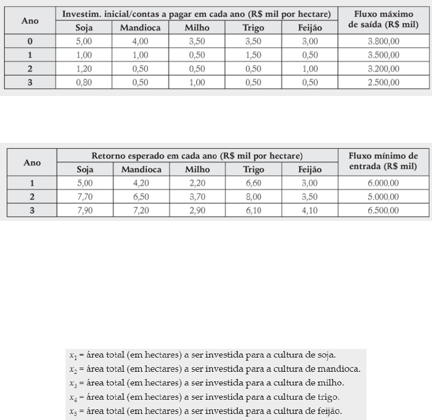 ATIVIDADE AVALIATIVA DE MODELAGEM E TOMADA DE DECISÃO 2023/2 (VALOR 6.0 Pontos) 1ª questão - Um fazendeiro está considerando cinco tipos de investimentos em atividades de cultura (soja, mandioca, milho, trigo e feijão) em sua nova fazenda, que possui área total disponível de 1000 hectares. Cada atividade de cultura exige investimentos de capital que gerarão benefícios futuros. O investimento inicial e as contas a pagar nos próximos três anos, para cada atividade de cultura, estão especificados na tabela. O retorno esperado nos próximos três anos, para cada investimento de cultura, está especificado na Tabela. O fazendeiro possui limitação de recursos a serem investidos em cada período e espera um fluxo mínimo de entrada em cada período. A taxa de juros, para cada atividade de cultura, é de 10% a.a. A partir da área total disponível para investimento, o fazendeiro quer determinar quanto investir em cada cultura (em hectares), de forma a maximizar o VPL do conjunto de projetos de investimento em análise, respeitando os fluxos mínimo de entrada e máximo de saída em cada período. Você modelou o problema da seguinte forma Resolva o problema usando o software LINDO e prepare um relatório com os resultados obtidos para apresentar na reunião com o fazendeiro. Obs: lembre-se, como dito na aula online, nos valores com vírgula (ex 4,5), usar ponto (ex. 4.5) ao digitar no LINDO. A área não precisa ser um número inteiro. 2ª questão - A companhia PetrusNortel atua no setor petroquímico e possui duas plantas. Uma delas é responsável pela produção de polímeros e está localizada em Recife. A outra está localizada em Manaus, sendo responsável pela produção de resina. A fim de reduzir os custos logísticos, os produtos sofrem uma etapa de transbordo em um dos centros de distribuição, localizados em São Paulo e no Rio de Janeiro. A partir dos centros de distribuição, os produtos são transportados para os clientes finais, localizados em Belo Horizonte, Joinville e Porto Alegre, conforme mostra a Figura. A capacidade de produção das fábricas é de 500 unidades em Manaus e 300 em Recife. A demanda dos consumidores de Belo Horizonte, Joinville e Porto Alegre é de 200, 250 e 350, respectivamente. Os custos unitários de transporte, das fábricas para os pontos de transbordo e dos pontos de transbordo para os consumidores finais, estão representados nas Tabelas. Você formulou o problema como se segue Sujeito a Resolva o problema usando o software LINDO e prepare um relatório com os resultados obtidos para apresentar na reunião com a diretoria da empresa. 3ª questão - A empresa Tubo Forte fabrica encanamentos de plástico em três cidades brasileiras: São Paulo (1), Rio de Janeiro (2) e Belo Horizonte (3). Ela tem representantes que se encarregam de estocar e redistribuir o produto ao comércio varejista das respectivas regiões a eles atribuídas. Esses representantes distribuidores estão localizados em quatro cidades: Curitiba (1), Cuiabá (2), Goiânia (3) e Ouro Preto (4), o que condiciona o valor do frete a cada origem e destino. A empresa tem limitações de produção em todas as unidades de sua planta. Por sua vez, cada um dos distribuidores demanda quantidades mensais (em toneladas) diferentes de produtos. Os custos de transporte, a produção máxima, a demanda e as quantidades de cada produto para cada um dos centros distribuidores são apresentadas nas tabelas. Você modelou o problema da seguinte forma Resolva o problema usando o software LINDO e prepare um relatório com os resultados obtidos para apresentar na reunião com a diretoria da empresa.
