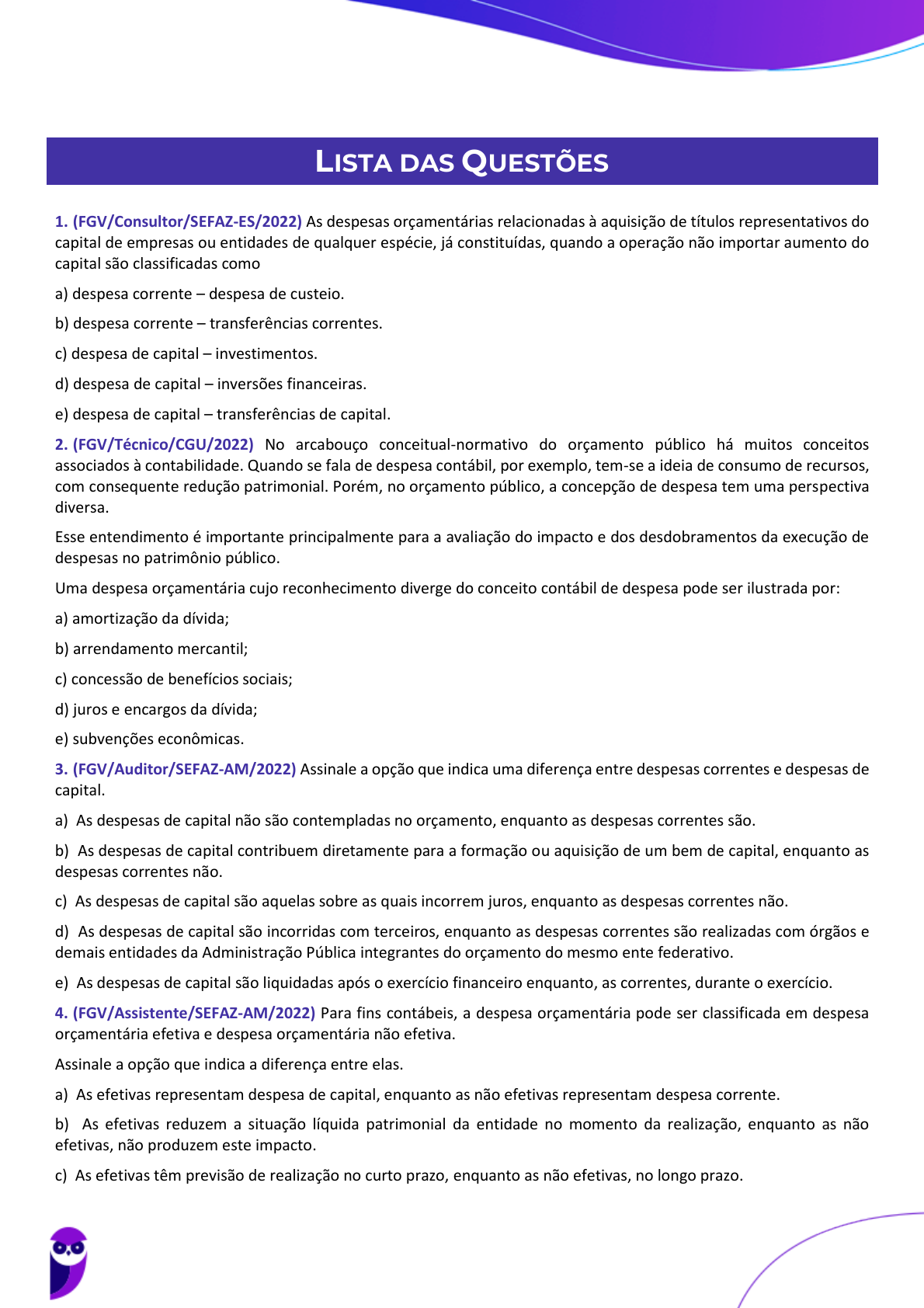 LISTA DAS QUESTÕES 1. (FGV/Consultor/SEFAZ-ES/2022) As despesas orçamentárias relacionadas à aquisição de títulos representativos do capital de empresas ou entidades de qualquer espécie, já constituídas, quando a operação não importar aumento do capital são classificadas como a) despesa corrente – despesa de custeio. b) despesa corrente – transferências correntes. c) despesa de capital – investimentos. d) despesa de capital – inversões financeiras. e) despesa de capital – transferências de capital. 2. (FGV/Técnico/CGU/2022) No arcabouço conceitual-normativo do orçamento público há muitos conceitos associados à contabilidade. Quando se fala de despesa contábil, por exemplo, tem-se a ideia de consumo de recursos, com consequente redução patrimonial. Porém, no orçamento público, a concepção de despesa tem uma perspectiva diversa. Esse entendimento é importante principalmente para a avaliação do impacto e dos desdobramentos da execução de despesas no patrimônio público. Uma despesa orçamentária cujo reconhecimento diverge do conceito contábil de despesa pode ser ilustrada por: a) amortização da dívida; b) arrendamento mercantil; c) concessão de benefícios sociais; d) juros e encargos da dívida; e) subvenções econômicas. 3. (FGV/Auditor/SEFAZ-AM/2022) Assinale a opção que indica uma diferença entre despesas correntes e despesas de capital. a) As despesas de capital não são contempladas no orçamento, enquanto as despesas correntes são. b) As despesas de capital contribuem diretamente para a formação ou aquisição de um bem de capital, enquanto as despesas correntes não. c) As despesas de capital são aquelas sobre as quais incorrem juros, enquanto as despesas correntes não. d) As despesas de capital são incorridas com terceiros, enquanto as despesas correntes são realizadas com órgãos e demais entidades da Administração Pública integrantes do orçamento do mesmo ente federativo. e) As despesas de capital são liquidadas após o exercício financeiro enquanto, as correntes, durante o exercício. 4. (FGV/Assistente/SEFAZ-AM/2022) Para fins contábeis, a despesa orçamentária pode ser classificada em despesa orçamentária efetiva e despesa orçamentária não efetiva. Assinale a opção que indica a diferença entre elas. a) As efetivas representam despesa de capital, enquanto as não efetivas representam despesa corrente. b) As efetivas reduzem a situação líquida patrimonial da entidade no momento da realização, enquanto as não efetivas, não produzem este impacto. c) As efetivas têm previsão de realização no curto prazo, enquanto as não efetivas, no longo prazo. Gilmar Possati Aula 02 Câmara de Pouso Alegre-MG (Agente Administrativo) Contabilidade Pública - 2023 (Pós-Edital) www.estrategiaconcursos.com.br 10964115638 - Heloísa Fagundes da Silva 98 120 d) As efetivas relacionam-se à atividade fim da entidade, enquanto as não efetivas, apresentam outras finalidades. e) As efetivas são contabilizadas de acordo com o regime de competência, enquanto as não efetivas, de acordo com o regime de caixa. 5. (FGV/Agente/SEFAZ-BA/2022) De acordo com a Lei nº 4320/64, a amortização da dívida pública e os juros da dívida pública são classificados, respectivamente, como a) Despesas de Capital: investimentos e Despesas de Capital: transferências de capital. b) Despesas Correntes: despesas de custeio e Despesas Correntes: transferências correntes. c) Despesas de Capital: transferências de capital e Despesas Correntes: transferências correntes d) Despesas de Capital: investimentos e Despesas Correntes: despesas de custeio. e) Despesas de Capital: inversões financeiras e Despesas Correntes: transferências correntes. 6. (FGV/Consultor/SEFAZ-ES/2022) Assinale a opção que indica os estágios de execução da despesa orçamentária. a) Fixação, empenho e liquidação. b) Fixação, empenho e pagamento. c) Fixação, liquidação e pagamento. d) Empenho, liquidação e pagamento. e) Empenho, pagamento e avaliação. 7. (FGV/Auditor/SEFAZ-AM/2022) Em relação aos estágios da despesa pública, o empenho, a liquidação e o pagamento fazem parte do estágio de a) planejamento. b) execução. c) apropriação. d) lançamento. e) reconhecimento. 8. (FGV/Analista/TRT16/2022) Uma entidade do setor público registrou em sua contabilidade os seguintes fatos, referentes ao exercício de X0: Recebimento de receitas tributárias: R$500.000 Empenho de despesa: R$450.000 Liquidação de despesa corrente: R$380.000 Com base apenas nesses fatos, os restos a pagar não processados são de: a) Zero. b) R$50.000. c) R$70.000. d) R$380.000. e) R$450.000. 9. (FGV/Auditor/TCE-TO/2022) No dia 04/11/20x1, a Subsecretaria de Contabilidade de um ente público municipal recebeu de uma empresa documentação relativa à cobrança de um serviço prestado no ano anterior por ordem do prefeito do Município. O orçamento do exercício de 20x0 consignava crédito para o tipo de serviço discriminado na documentação, mas não foi localizado o registro do empenho relativo à prestação desse serviço. Considerando a legislação aplicável a essas situações, a Subsecretaria de Contabilidade deverá: a) adotar procedimentos para registro de restos a pagar não processados; b) registrar a cobrança pelo serviço prestado como passivo contingente; c) registrar a cobrança pelo serviço prestado em conta de controle, por sua natureza de ato potencial; d) solicitar a abertura de um crédito adicional especial no orçamento corrente para cobrir essa despesa; e) tratar a cobrança pelo serviço prestado como despesa de exercícios anteriores. 10. (FGV/Consultor/SEFAZ-ES/2022) De acordo com o Manual de Contabilidade Aplicada ao Setor Público, o suprimento de fundos pode ser utilizado Gilmar Possati Aula 02 Câmara de Pouso Alegre-MG (Agente Administrativo) Contabilidade Pública - 2023 (Pós-Edital) www.estrategiaconcursos.com.br 10964