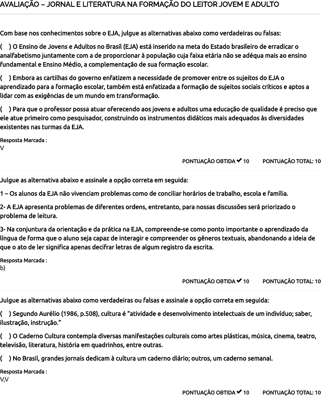 AVALIAÇÃO – JORNAL E LITERATURA NA FORMAÇÃO DO LEITOR JOVEM E ADULTO PONTUAÇÃO TOTAL: 10PONTUAÇÃO OBTIDA 10 Com base nos conhecimentos sobre o EJA, julgue as alternativas abaixo como verdadeiras ou falsas: ( ) O Ensino de Jovens e Adultos no Brasil (EJA) está inserido na meta do Estado brasileiro de erradicar o analfabetismo juntamente com a de proporcionar à população cuja faixa etária não se adéqua mais ao ensino fundamental e Ensino Médio, a complementação de sua formação escolar. ( ) Embora as cartilhas do governo enfatizem a necessidade de promover entre os sujeitos do EJA o aprendizado para a formação escolar, também está enfatizada a formação de sujeitos sociais críticos e aptos a lidar com as exigências de um mundo em transformação. ( ) Para que o professor possa atuar oferecendo aos jovens e adultos uma educação de qualidade é preciso que ele atue primeiro como pesquisador, construindo os instrumentos didáticos mais adequados às diversidades existentes nas turmas da EJA. Resposta Marcada : VVV PONTUAÇÃO TOTAL: 10PONTUAÇÃO OBTIDA 10 Julgue as alternativa abaixo e assinale a opção correta em seguida: 1 – Os alunos da EJA não vivenciam problemas como de conciliar horários de trabalho, escola e família. 2- A EJA apresenta problemas de diferentes ordens, entretanto, para nossas discussões será priorizado o problema de leitura. 3- Na conjuntura da orientação e da prática na EJA, compreende-se como ponto importante o aprendizado da língua de forma que o aluno seja capaz de interagir e compreender os gêneros textuais, abandonando a ideia de que o ato de ler signi�ca apenas decifrar letras de algum registro da escrita. Resposta Marcada : b) Apenas a alternativa 1 está incorreta PONTUAÇÃO TOTAL: 10PONTUAÇÃO OBTIDA 10 Julgue as alternativas abaixo como verdadeiras ou falsas e assinale a opção correta em seguida: ( ) Segundo Aurélio (1986, p.508), cultura é “atividade e desenvolvimento intelectuais de um indivíduo; saber, ilustração, instrução.” ( ) O Caderno Cultura contempla diversas manifestações culturais como artes plásticas, música, cinema, teatro, televisão, literatura, história em quadrinhos, entre outras. ( ) No Brasil, grandes jornais dedicam à cultura um caderno diário; outros, um caderno semanal. Resposta Marcada : V,V,V. PONTUAÇÃO TOTAL: 10PONTUAÇÃO OBTIDA 10 As atividades com o texto deverá ser conduzida de forma a evidenciar um amplo campo de possibilidades. Dessa forma destacamos alguns pontos importantes para o trabalho de literatura em sala de aula da EJA, exceto: Resposta Marcada : Forçar uma determinada leitura, obrigar a ler somente os clássicos, gênero ou cânones, o professor deve ser �exível para ouvir e levar obras que criem curiosidade e expectativa nos alunos. PONTUAÇÃO TOTAL: 10PONTUAÇÃO OBTIDA 10 Julgue as alternativas abaixo e em seguida assinale a opção correspondente: I. A leitura do jornal é uma ferramenta valiosa a serviço da educação, um instrumento poderoso que temos para capturar, seduzir nossos alunos em prol da formação deles próprios, para convencê-los a pensar o cotidiano. II. A leitura diária do jornal nos mantém informado acerca dos fatos mais signi�cativos que ocorrem só em nosso meio social, nem mesmo em outros continentes. III. A leitura regular de jornais contribui para a compreensão do mundo e para o enriquecimento pessoal. Resposta Marcada : As alternativas I e III estão corretas PONTUAÇÃO TOTAL: 10PONTUAÇÃO OBTIDA 10 A educação no Brasil desde muito tempo vem buscando propostas e projetos de ensino visando ajudar o aluno, tentando oferecer aos professores melhores condições de ensino e quali�cação de trabalho. No que diz respeito ao per�l da EJA, leia atentamente as alternativas abaixo e assinale a opção incorreta em seguida: Resposta Marcada : As lutas sociais não têm impulsionado o Estado a realizar, na prática, as conquistas constitucionais do direito à educação, processualmente instaurando a dimensão de perenidade nas políticas, em lugar de ofertas efêmeras, traduzidas por programas e projetos. PONTUAÇÃO TOTAL: 10PONTUAÇÃO OBTIDA 10 Julgue as alternativas abaixo como verdadeiras ou falsas: ( ) A escrita literária faz com que o homem parta para a emancipação de suas amarras ideológicas. ( ) A leitura crítica e re�exiva não pode libertar o leitor e direcioná-lo uma nova percepção das coisas e de mundo. ( ) A forma literária não pode provocar os sentimentos existentes que estão atados ao interior vazio de todo objeto: sentido do insólito, familiaridade, repugnância e complacência. Resposta Marcada : VFF PONTUAÇÃO TOTAL: 10PONTUAÇÃO OBTIDA 10 No ano de 2007, tivemos a oportunidade de participar do Programa de Desenvolvimento Educacional (PDE), ofertado pela Secretaria de Estado da Educação do Paraná, em parceria com Instituições de Ensino Superior (IES), o que nos possibilitou o retorno às atividades acadêmicas, onde tivemos a oportunidade de realizar e aprofundar estudos teóricos, discussões e re�exões acerca de nossa prática pedagógica. Resposta Marcada : A formação do leitor não é um processo contínuo, nem pode ser uma maior realização pessoal ou econômica. 90 / 100 PONTUAÇÃO TOTAL: 10PONTUAÇÃO OBTIDA 10 No que diz respeito à formação de leitores na EJA, assinale a alternativa incorreta abaixo: Resposta Marcada : Os alunos da EJA não apresentam saberes prévios e intuitivos ao ingressar nessa modalidade de ensino. PONTUAÇÃO TOTAL: 10PONTUAÇÃO OBTIDA 0 Sobre o conceito de literatura e seu papel na educação, assinale a alternativa incorreta abaixo: Resposta Marcada : a) De todas as formas de arte a literatura é a mais próxima da vida, uma vez que reúne uma complexa ligação com a condição do homem dentro da sociedade transitando entre a realidade e imaginação no processo de construção do texto literário. Total A Literatura desperta 