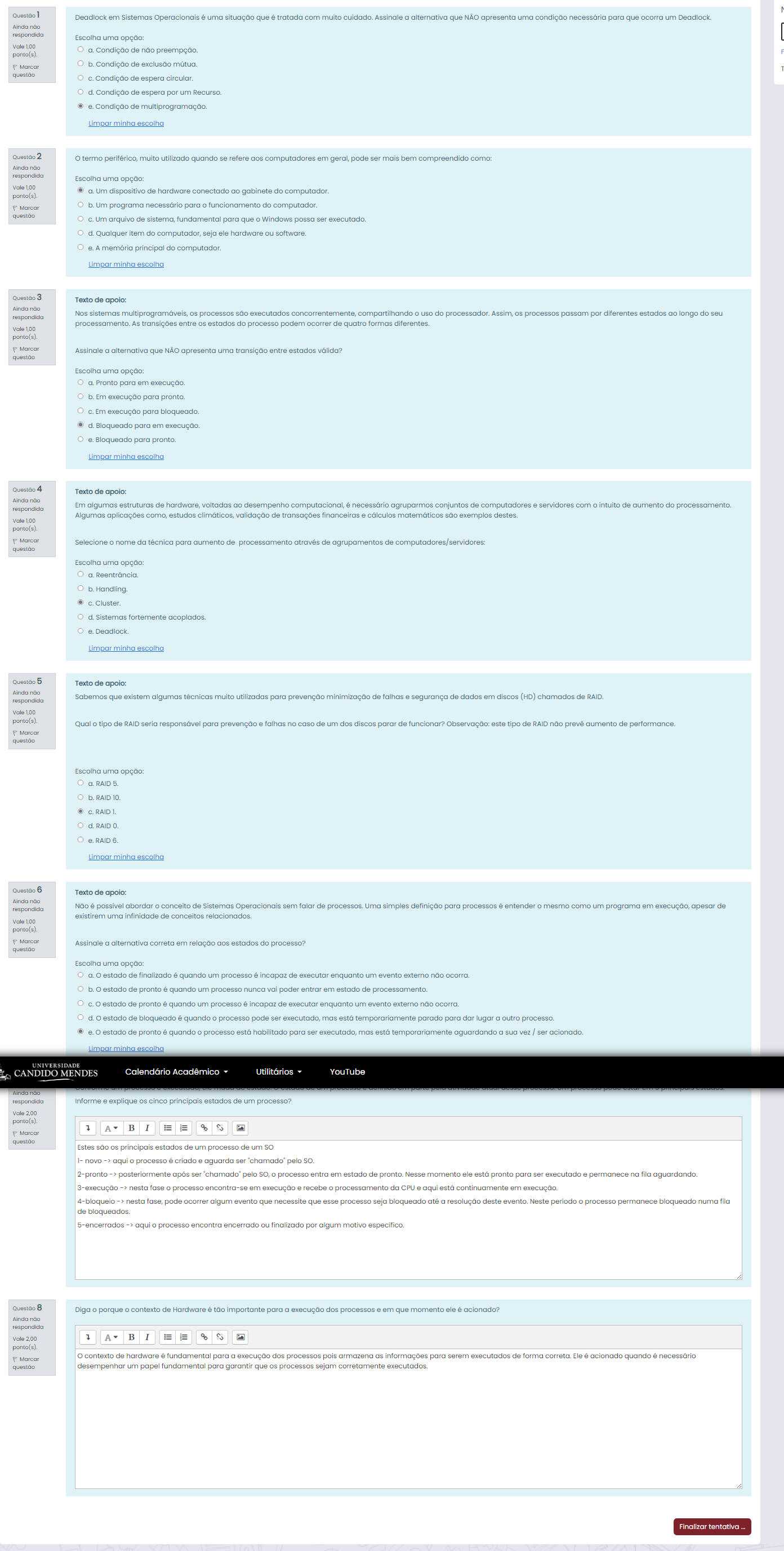 Explique os cinco principais estados de um processo. 1- novo: o processo aguarda ser 'chamado' pelo SO. 2- pronto: posteriormente, após ser chamado, o processo entra em estado de pronto. Nesse momento, ele está pronto para ser executado e permanece na fila aguardando. 3- execução: nesta fase, o processo encontra-se em execução e recebe o processamento do CPU, aqui continuamente em execução. 4- bloqueio: nesta fase, pode ocorrer algum evento que necessite que esse processo seja bloqueado até a resolução deste. Neste, o processo permanece bloqueado em uma fila de bloqueados. 5- encerrados: aqui o processo encontra-se encerrado ou finalizado por algum motivo específico.