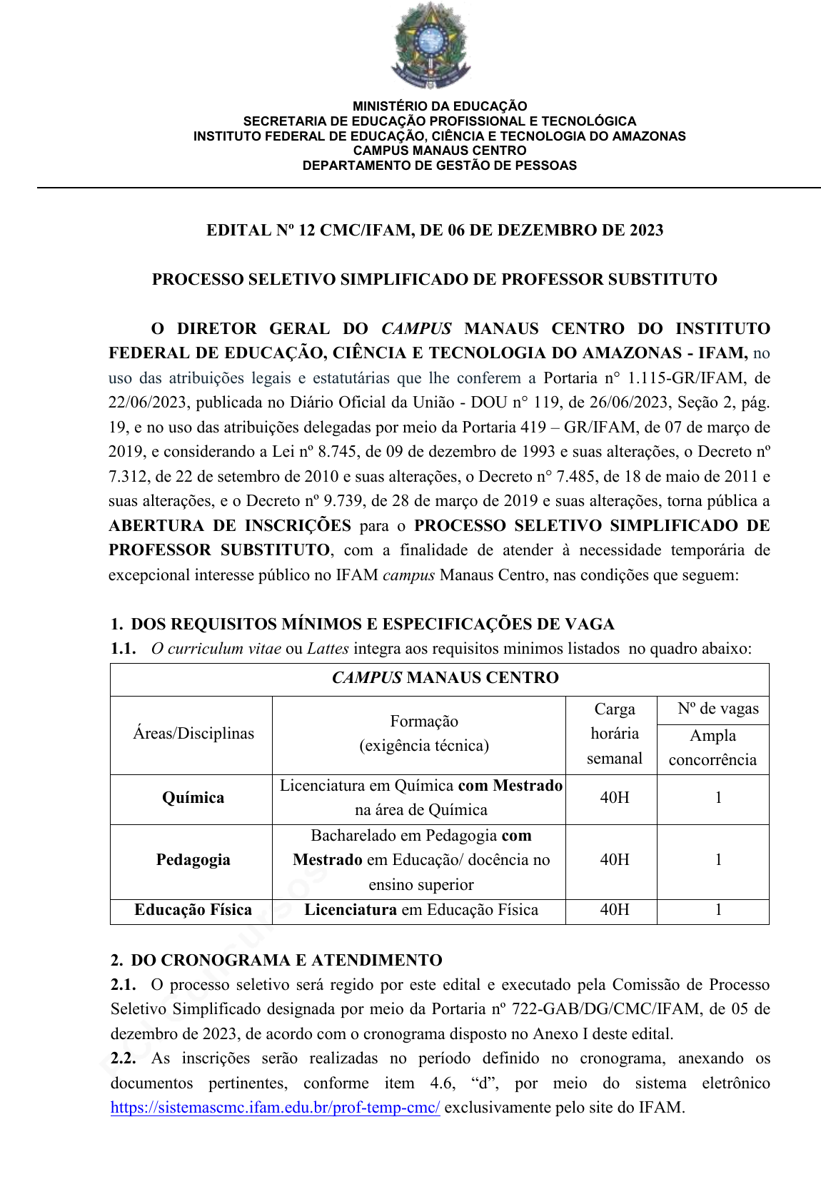 pcimarkpci MjgwNDowMDE4OjExMWQ6MmU4NDo4OGUxOjZjZjY6YTE1NTowNjE1:VHVlLCAxMiBEZWMgMjAyMyAxNjowMjoxNyAtMDMwMA== www.pciconcursos.com.br MINISTÉRIO DA EDUCAÇÃO SECRETARIA DE EDUCAÇÃO PROFISSIONAL E TECNOLÓGICA INSTITUTO FEDERAL DE EDUCAÇÃO, CIÊNCIA E TECNOLOGIA DO AMAZONAS CAMPUS MANAUS CENTRO DEPARTAMENTO DE GESTÃO DE PESSOAS EDITAL Nº 12 CMC/IFAM, DE 06 DE DEZEMBRO DE 2023 PROCESSO SELETIVO SIMPLIFICADO DE PROFESSOR SUBSTITUTO O DIRETOR GERAL DO CAMPUS MANAUS CENTRO DO INSTITUTO FEDERAL DE EDUCAÇÃO, CIÊNCIA E TECNOLOGIA DO AMAZONAS - IFAM, no uso das atribuições legais e estatutárias que lhe conferem a Portaria n° 1.115-GR/IFAM, de 22/06/2023, publicada no Diário Oficial da União - DOU n° 119, de 26/06/2023, Seção 2, pág. 19, e no uso das atribuições delegadas por meio da Portaria 419 – GR/IFAM, de 07 de março de 2019, e considerando a Lei nº 8.745, de 09 de dezembro de 1993 e suas alterações, o Decreto nº 7.312, de 22 de setembro de 2010 e suas alterações, o Decreto n° 7.485, de 18 de maio de 2011 e suas alterações, e o Decreto nº 9.739, de 28 de março de 2019 e suas alterações, torna pública a ABERTURA DE INSCRIÇÕES para o PROCESSO SELETIVO SIMPLIFICADO DE PROFESSOR SUBSTITUTO, com a finalidade de atender à necessidade temporária de excepcional interesse público no IFAM campus Manaus Centro, nas condições que seguem: 1. DOS REQUISITOS MÍNIMOS E ESPECIFICAÇÕES DE VAGA 1.1. O curriculum vitae ou Lattes integra aos requisitos minimos listados no quadro abaixo: CAMPUS MANAUS CENTRO Áreas/Disciplinas Formação (exigência técnica) Carga horária semanal Nº de vagas Ampla concorrência Química Licenciatura em Química com Mestrado na área de Química 40H 1 Pedagogia Bacharelado em Pedagogia com Mestrado em Educação/ docência no ensino superior 40H 1 Educação Física Licenciatura em Educação Física 40H 1 2. DO CRONOGRAMA E ATENDIMENTO 2.1. O processo seletivo será regido por este edital e executado pela Comissão de Processo Seletivo Simplificado designada por meio da Portaria nº 722-GAB/DG/CMC/IFAM, de 05 de dezembro de 2023, de acordo com o cronograma disposto no Anexo I deste edital. 2.2. As inscrições serão realizadas no período definido no cronograma, anexando os documentos pertinentes, conforme item 4.6, “d”, por meio do sistema eletrônico https://sistemascmc.ifam.edu.br/prof-temp-cmc/ exclusivamente pelo site do IFAM. pcimarkpci MjgwNDowMDE4OjExMWQ6MmU4NDo4OGUxOjZjZjY6YTE1NTowNjE1:VHVlLCAxMiBEZWMgMjAyMyAxNjowMjoxNyAtMDMwMA== www.pciconcursos.com.br MINISTÉRIO DA EDUCAÇÃO SECRETARIA DE EDUCAÇÃO PROFISSIONAL E TECNOLÓGICA INSTITUTO FEDERAL DE EDUCAÇÃO, CIÊNCIA E TECNOLOGIA DO AMAZONAS CAMPUS MANAUS CENTRO DEPARTAMENTO DE GESTÃO DE PESSOAS 2.3. O atendimento aos candidatos para esclarecimentos de dúvidas e/ou ajuda técnica referente às inscrições, será efetuado unicamente pelo endereço de e-mail cpss.cmc@ifam.edu.br, nos dias úteis e horário comercial, durante o período de inscrições. 3. DAS ATRIBUIÇÕES, DA JORNADA DE TRABALHO E DA REMUNERAÇÃO 3.1. Consistem atribuições do cargo de professor substituto as de desenvolver atividades de ensino, pesquisa e extensão em todas as áreas de formação (ensino médio, técnico, graduação, especialização, mestrado e doutorado) nos diversos níveis e modalidades de ensino do IFAM, e desenvolver atividades de assessoramento, assistência, participação em comissões, projetos e outras atividades previstas na legislação vigente. 3.2. A jornada de trabalho será de 40 (quarenta) horas, conforme previamente especificado no item 1.1, podendo ser exigido o cumprimento de dois turnos, dentre os turnos matutino, vespertino ou noturno, de acordo com as necessidades institucionais. 3.3. A remuneração a ser paga ao candidato aprovado que vier a ser contratado será o valor correspondente à Classe D I, Nível 01, da carreira do Magistério do Ensino Básico, Técnico e Tecnológico e a retribuição por titulação, quando estiver de acordo com o requisito mínimo descrito no item 1.1 deste Edital, na conformidade da formação (exigência técnica), de acordo com as tabelas abaixo: Tabela correspondente a 40 horas semanais para as vagas de QUÍMICA e PEDAGOGIA: Formação (exigência técnica) Vencimento básico Retribuição por Titulação Total Mestrado R$3.412,63 R$ 1.279,74 R$ 4.692,37 Tabela correspondente a 40 horas semanais para a vaga de EDUCAÇÃO FÍSICA: Formação (exigência técnica) Vencimento básico Retribuição por Titulação Total Graduação R$3.412,63 ------- R$ 3.412,63 3.4. Além da remuneração serão concedidos aos candidatos contratados os seguintes benefícios: a) auxílio-alimentação: R$ 658,00 (quatrocentos e cinquenta e oito reais). b) auxílio pré-escolar: R$ 321,00 (trezentos e vinte e um reais) por dependente, até os 5 anos de idade. c) auxílio transporte quando houver transporte coletivo regulamentado no município. 3.5. Considerando a Orientação Normativa SRH/MP nº 05, de 28 de outubro de 2009, da pcimarkpci MjgwNDowMDE4OjExMWQ6MmU4NDo4OGUxOjZjZjY6YTE1NTowNjE1:VHVlLCAxMiBEZWMgMjAyMyAxNjowMjoxNyAtMDMwMA== www.pciconcursos.com.br MINISTÉRIO DA EDUCAÇÃO SECRETARIA DE EDUCAÇÃO PROFISSIONAL E TECNOLÓGICA INSTITUTO FEDERAL DE EDUCAÇÃO, CIÊNCIA E TECNOLOGIA DO AMAZONAS CAMPUS MANAUS CENTRO DEPARTAMENTO DE GESTÃO DE PESSOAS Secretaria de Recursos Humanos do Ministério do Planejamento, Orçamento e Gestão, atualmente sucedido pelo Ministério da Economia, não será pago ao professor substituto vencimento ou retribuição por titulação, superior à exigida no item 1.1, ainda que o candidato aprovado comprove possuir titulação superior. 4. DAS INSCRIÇÕES 4.1. Período de inscrição: de 06 a 18 de dezembro de 2023, conforme o Anexo I. 4.2. A taxa de inscrição será de acordo com a formação (exigência técnica), conforme a seguinte tabela: Mestrado R$ 60,00 Graduação R$ 50,00 4.3. Soment
