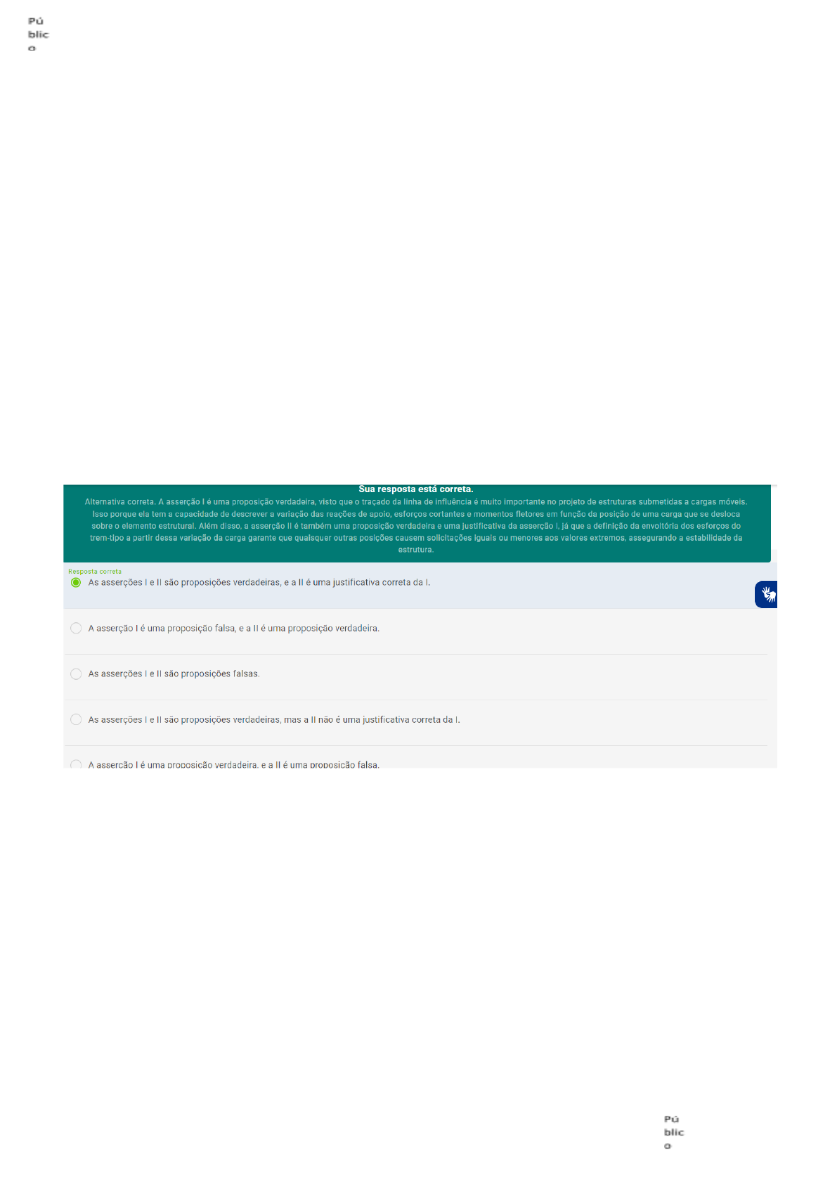 Leia o trecho a seguir. "Para a definição dos valores extremos (máximos e mínimos) de determinada solicitação despertada pelas cargas móveis, tal como momento fletor ou cortante, torna-se imprescindível o domínio dos conceitos de linhas de influência e suas aplicações [...]". VALERIANO, R. Pontes. São Paulo: Oficinas de Textos, 2021. p. 336. Com base no apresentado, analise as asserções a seguir e a relação proposta entre elas. I. O dimensionamento de uma viga a partir das linhas de influência permite que se garanta a sua estabilidade em qualquer posição da carga de cálculo. PORQUE II. O emprego das linhas de influência possibilita definir a envoltória dos esforços do trem tipo, fazendo com que qualquer posição que a carga assuma produza solicitações iguais ou menores aos valores extremos. A respeito dessas asserções, assinale a opção correta. Uma viga possui bw=0,75 m e h=3 m e foi protendida com concreto com 5 dias de idade em um ambiente de Ur=75%. Considerando Ep=2,5x105 MPa, a perda por retração que um cabo sofrerá é igual a: Considere um cabo de aço CP190RB com uma tensão no tempo zero t0 (após as perdas iniciais) de 1500 Mpa. Levando-se em conta o apresentado, a sua perda de protensão por relaxação é igual a: Leia o trecho a seguir. "Na composição das estruturas típicas de pontes, pode-se distinguir entre os componentes com função estrutural, ou seja, concebidos e dimensionados de forma a absorver e transmitir forças relativamente expressivas, e os demais elementos sem função estrutural primordial". VALERIANO, R. Pontes. São Paulo: Oficinas de Textos, 2021. p. 336. Com base no excerto apresentado, avalie as afirmações a seguir. 1. Mesoestrutura é a parte de cima de uma ponte e transmite os esforços da superestrutura à infraestrutura. 2. Infraestrutura é um dos elementos estruturais principais de pontes e tem a função de transmitir os esforços para o solo. 3. Superestrutura é uma das três principais partes das pontes e faz a ligação da mesoestrutura com a infraestrutura. 4. Mesoestrutura é um elemento estrutural constituinte de pontes e tem como principal componente as fundações. É correto o que se afirma em: Leia o trecho a seguir. "Denomina-se trem tipo de uma viga principal o quinhão de cargas produzido na mesma pelas cargas móveis de cálculo, colocadas na largura do tabuleiro, na posição mais desfavorável para a viga em estudo. Nessas condições, o trem tipo é o carregamento de cálculo de uma viga, levando-se em conta a geometria da seção transversal da ponte (número e espaçamento de vigas, posição da laje do tabuleiro em relação às vigas)". PFEIL, W. Pontes em concreto armado: elementos de projetos, solicitações e superestrutura. São Paulo: Livros Técnicos e Científicos, 1990. p. 228. Com base no excerto apresentado, avalie as afirmações a seguir. 1. Para dimensionar os elementos estruturais de uma ponte, o trem-tipo é formado somente pelas cargas dos veículos. 2. Para dimensionar uma ponte, deve-se considerar que o trem-tipo é constante e pode ocupar qualquer lugar no seu sentido longitudinal. 3. Para calcular o trem-tipo de uma ponte, é necessário ter conhecimento das dimensões dos veículos. 4. Para calcular o trem-tipo de uma ponte, deve-se utilizar o coeficiente CNF referente à força centrífuga. É correto o que se afirma em: Considere uma viga pós-tensionada biapoiada, com cabo de curvatura em parábola do 2º grau, conforme ilustrado na Figura a seguir. Figura 2: Viga pós-tensionada com curvatura dos cabos em parábola de 2o grau. Fonte: adaptado de BASTOS, 2021. #PraCegoVer: a imagem ilustra uma viga biapoiada, com o aço protendido curvado, ancorada na extremidade esquerda de forma ativa e ancorada na extremidade direita de forma passiva. A viga tem 42 m de comprimento, e a excentricidade da linha neutra ao aço é de 1,0 m na parte mais curvada do aço protendido. Assim, a distância da curva de protensão até a extremidade é L/2. Ela possui um comprimento de 42 m e é composta por bainha metálica flexível, coeficiente de atrito µ=0,12 (bainha metálica com cordoalha), coeficiente de atrito por ondulação k=0,015µ (0,0018/m); e cabo de protensão constituído por 12 cordoalhas CP190 de 7 fios Ø12,7 mm (Ap=12 cm2). A tensão aplicada na armadura na posição do cilindro hidráulico corresponde a σpi=0,82fpyk(0,82(0,9 x 1900)=1402,2 MPa). Sendo assim, as perdas por atrito no meio do vão e na ancoragem passiva correspondem, respectivamente, a: Leia o trecho a seguir. “Estados Limites de Serviço (ELS’s) são aqueles relacionados à durabilidade das estruturas, aparência, ao conforto do usuário e à sua boa utilização funcional, seja em relação aos usuários, às máquinas e aos equipamentos utilizados. A qualidade e o desempenho das estruturas se relacionam diretamente ao maior número possível de ELS’s considerados no projeto. Eventuais ocorrências de um ou mais ELS’s durante a utilização da estrutura podem representar restrições ao uso sem necessidade de interdições. O que está em discussão é o uso e não a segurança estrutural.” CHOLFE; L.; BONILHA; L. Concreto protendido: teoria e prática. São Paulo: Pini, 2013. p. 337. Com base no excerto apresentado, avalie as afirmações a seguir. 1. No Estado-Limite de Deformações Excessivas (ELS-DEF), as deformações atingem os limites estabelecidos para a utilização normal dos dados. 2. O Estado-Limite de Descompressão (ELS-D) corresponde ao estado em que se inicia a formação de fissuras no elemento estrutural. 3. O Estado-Limite de Deformações Excessivas (ELS-DEF) corresponde ao estado em que os elementos fletidos apresentam flechas em serviço. 4. No Estado-Limite de Vibrações Excessivas (ELS-VE), as vibrações estão ainda abaixo dos limites estabelecidos para utilização normal da construção. É correto o que se afirma em: Leia o trecho a seguir. "Bueiros são obr