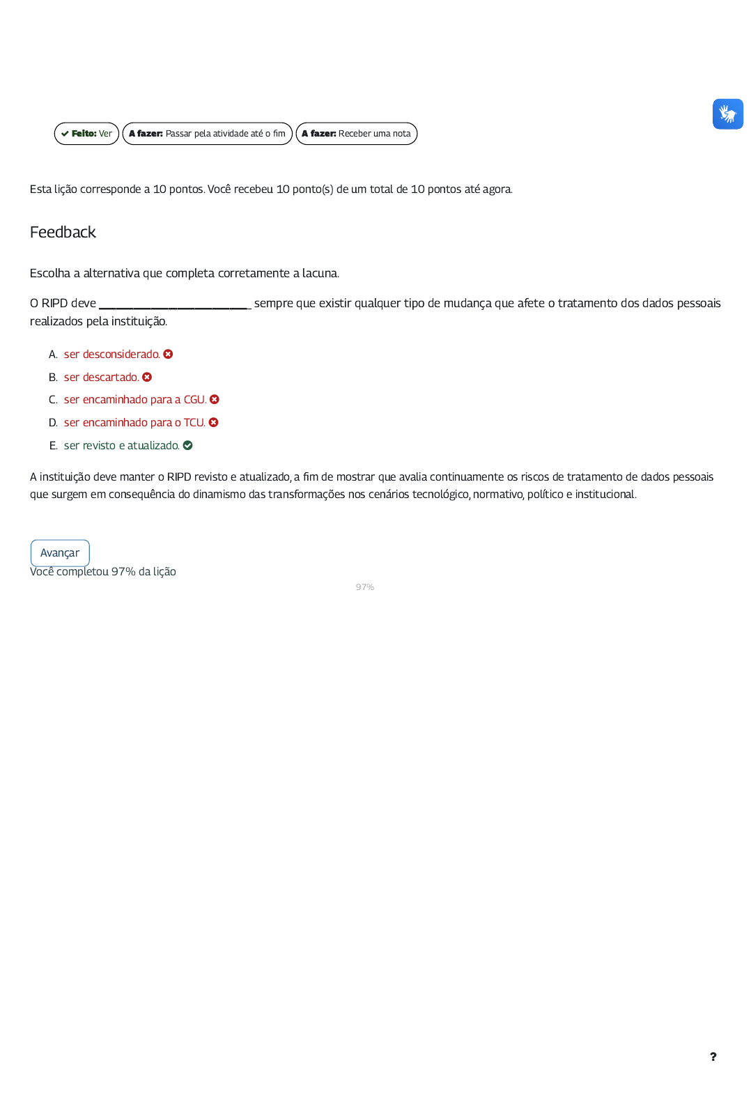 14/12/23, 15:19 prot-dados | - Turma DEZ/2023: Conteúdo - Módulo 4: Feedback questão 10 https://mooc41.escolavirtual.gov.br/mod/lesson/view.php?id=19999&pageid=11096 1/2 Esta lição corresponde a 10 pontos. Você recebeu 10 ponto(s) de um total de 10 pontos até agora. Feedback Escolha a alternativa que completa corretamente a lacuna. O RIPD deve _________________ sempre que existir qualquer tipo de mudança que afete o tratamento dos dados pessoais realizados pela instituição. A. ser desconsiderado. B. ser descartado. C. ser encaminhado para a CGU. D. ser encaminhado para o TCU. E. ser revisto e atualizado. A instituição deve manter o RIPD revisto e atualizado, a �m de mostrar que avalia continuamente os riscos de tratamento de dados pessoais que surgem em consequência do dinamismo das transformações nos cenários tecnológico, normativo, político e institucional. Avançar Você completou 97% da lição 97% Feito: Ver A fazer: Passar pela atividade até o �m A fazer: Receber uma nota 14/12/23, 15:19 prot-dados | - Turma DEZ/2023: Conteúdo - Módulo 4: Feedback questão 10 https://mooc41.escolavirtual.gov.br/mod/lesson/view.php?id=19999&pageid=11096 2/2