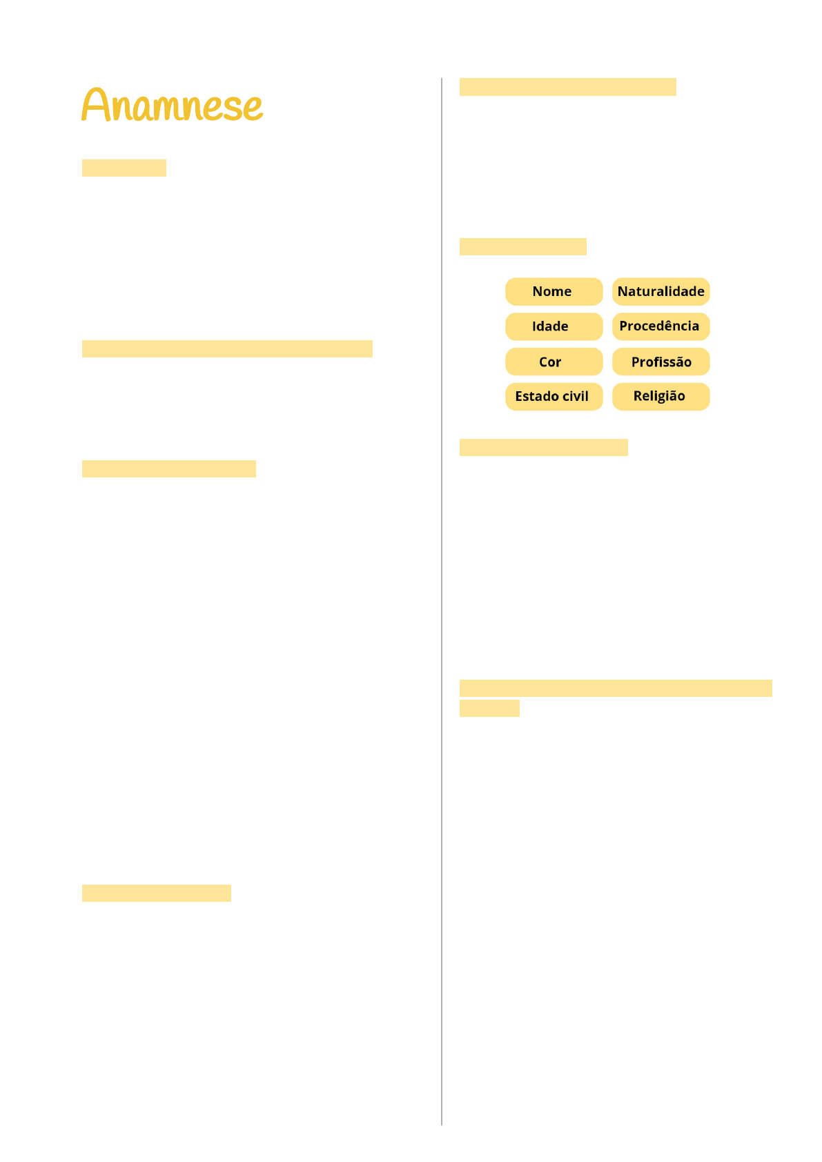 Anamnese CONCEITO: A anamnese (do grego anamnesis significa recordação) consiste na história clínica do paciente, ou seja, é o conjunto de informações obtidas pelo profissional de saúde por meio de entrevista previamente esquematizada. “ A anamnese leva à hipótese diagnóstica em cerca de 70-80% das vezes.” Para uma adequada Anamnese precisa : • O ambiente deve ser tranquilo. • Apresentação ( O profissional precisa se apresentar adequadamente). • Procure deixar o paciente à vontade. Objetivos da anamnese: • Estabelecer condições para uma adequada relação enfermeiro-paciente. • Conhecer, por meio da identificação, os determinantes epidemiológicos do paciente que influenciam seu processo saúde-doença. • Fazer a história clínica, registrando, detalhada e cronologicamente, o problema atual de saúde do paciente. • Avaliar, de maneira detalhada, os sintomas de cada sistema corporal . • Registrar e desenvolver práticas de promoção da saúde. • Avaliar o estado de saúde passado e presente do paciente, conhecendo os fatores pessoais, familiares e ambientais que influenciam seu processo saúde doença. Anamnese pode ser: - Ativa - Passiva - Mista Cuidado para não tendenciar as perguntas!!! Ex: Paciente diabético: O Senhor (a) não come doces, né? Essa pergunta tendia a resposta do paciente a dizer não. Pergunta correta: O senhor poderia me contar sua rotina alimentar ? ELEMENTOS DA ANAMNESE: • Identificação (ID) • Queixa e duração (QD) • História pregressa da moléstia atual (HPMA) •Interrogatório sobre os diversos aparelhos (ISDA) • Antecedentes pessoais (AP) • Antecedentes familiares (AF) • Hábitos de vida • História sócio-econômica Identificação (ID): Queixa e duração (QD): Queixa principal do paciente, àquela que o levou a procurar assistência . Deve ser expressa de modo sumário e de preferência com os termos usados pelo doente. Exemplo: “Dor nas costas há três dias”. Perguntas: -”Qual o motivo da vinda ?” -”O que o(a) senhor(a) está sentindo?” -” Por que o(a) senhor (a) procurou o serviço de saúde” História pregressa da moléstia atual (HPMA): • Ampliação da queixa principal • Ordem cronológica • Sintomas que se relacionam com a queixa principal • Início do sintoma • Fatores desencadeantes • Duração • Intensidade • Periodicidade • Fatores acompanhantes ou condições clínicas associadas • Fatores de melhora ou piora • Períodos de semelhança e dissemelhança ou de acalmia • Repercussão em outros sistemas, nas condições psicológicas do paciente e na sua vida como um todo •Tratamentos Já Realizados Seus Resultados OBS: etapa mais importante da anamnese INTERROGATÓRIO SOBRE OS DIVERSOS APARELHOS (ISDA) : • SINTOMAS GERAIS • PELE E FÂNEROS • CABEÇA E PESCOÇO • APARELHO RESPIRATÓRIO • APARELHO CARDIOVASCULAR • APARELHO DIGESTIVO • APARELHO GENITO-URINÁRIO • SISTEMA NERVOSO • SISTEMA ENDÓCRINO-METABÓLICO • SISTEMA OSTEOMUSCULAR • PSIQUISMO Antecedentes pessoais (AP): • Antecedentes fisiológicos • Antecedentes ginecológicos e obstétricos • Antecedentes patológicos • Medicações em uso • Viagens recentes. Antecedentes Familiares (AF): • Doenças adquiridas • Doenças hereditárias genealogia • Causa dos óbitos em parentes de 1o grau • Idade em que ocorreu os eventos cardiovasculares. Hábitos de Vida: • Alimentação • Ocupação atual e ocupações anteriores • Atividades Físicas • Hábitos • Bebidas Alcoólicas e Drogas História sócio-econômica: • Habitação • Condições socioeconômicas • Condições culturais • Vida conjugal e questionamento familiar