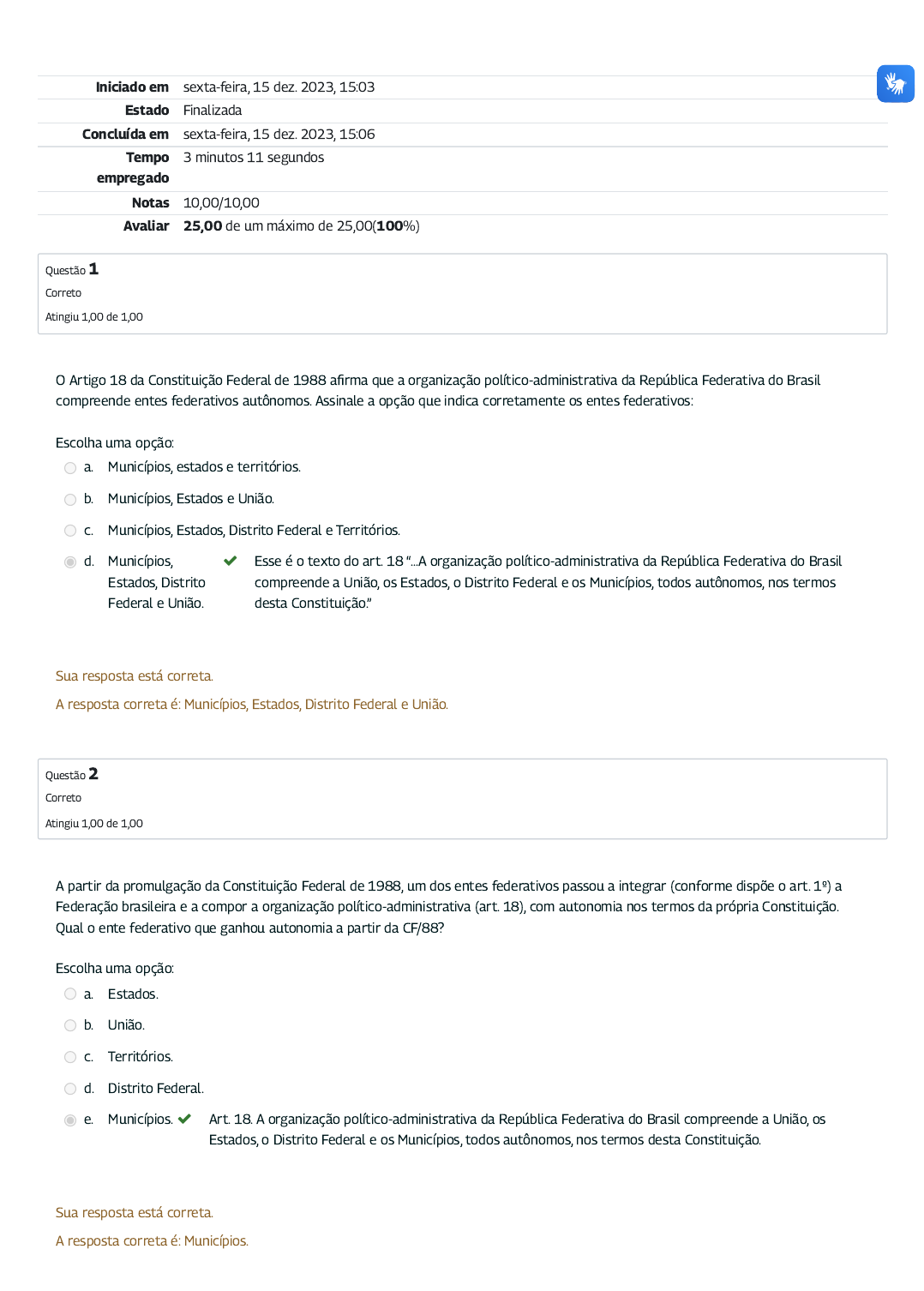 15/12/23, 15:07 Exercício Avaliativo - Módulo 1: Revisão da tentativa https://mooc41.escolavirtual.gov.br/mod/quiz/review.php?attempt=761498&cmid=18002 1/8 Iniciado em sexta-feira, 15 dez. 2023, 15:03 Estado Finalizada Concluída em sexta-feira, 15 dez. 2023, 15:06 Tempo empregado 3 minutos 11 segundos Notas 10,00/10,00 Avaliar 25,00 de um máximo de 25,00(100%) Questão 1 Correto Atingiu 1,00 de 1,00 Questão 2 Correto Atingiu 1,00 de 1,00 O Artigo 18 da Constituição Federal de 1988 a�rma que a organização político-administrativa da República Federativa do Brasil compreende entes federativos autônomos. Assinale a opção que indica corretamente os entes federativos: Escolha uma opção: a. Municípios, estados e territórios. b. Municípios, Estados e União. c. Municípios, Estados, Distrito Federal e Territórios. d. Municípios, Estados, Distrito Federal e União. Esse é o texto do art. 18 “...A organização político-administrativa da República Federativa do Brasil compreende a União, os Estados, o Distrito Federal e os Municípios, todos autônomos, nos termos desta Constituição.” Sua resposta está correta. A resposta correta é: Municípios, Estados, Distrito Federal e União. A partir da promulgação da Constituição Federal de 1988, um dos entes federativos passou a integrar (conforme dispõe o art. 1º) a Federação brasileira e a compor a organização político-administrativa (art. 18), com autonomia nos termos da própria Constituição. Qual o ente federativo que ganhou autonomia a partir da CF/88? Escolha uma opção: a. Estados. b. União. c. Territórios. d. Distrito Federal. e. Municípios. Art. 18. A organização político-administrativa da República Federativa do Brasil compreende a União, os Estados, o Distrito Federal e os Municípios, todos autônomos, nos termos desta Constituição. Sua resposta está correta. A resposta correta é: Municípios. 15/12/23, 15:07 Exercício Avaliativo - Módulo 1: Revisão da tentativa https://mooc41.escolavirtual.gov.br/mod/quiz/review.php?attempt=761498&cmid=18002 2/8 Questão 3 Correto Atingiu 1,00 de 1,00 Questão 4 Correto Atingiu 1,00 de 1,00 As competências compartilhadas ou comuns são aquelas cujos serviços são prestados tanto pela União como pelos Estados e Municípios. Marque a opção que indica. Escolha uma opção: a. Assistência Social e saneamento básico. As competências compartilhadas ou comuns são: saúde; meio ambiente; assistência social; habitação de interesse social e saneamento básico. b. Ordenamento urbano e iluminação pública. c. Iluminação pública e transporte coletivo. d. Licenciamento de atividades rurais e habitação de interesse social. e. Iluminação pública e saúde. Sua resposta está correta. A resposta correta é: Assistência Social e saneamento básico. Os Municípios, no âmbito da Federação brasileira, são entes autônomos e independentes, uma especi�cidade do Brasil quando comparado a outras federações existentes. Contudo essa autonomia não é irrestrita, uma vez que está sujeita aos limites determinados pela própria Constituição Federal — CF/1988. Correlacione a forma de autonomia especi�cada na coluna na esquerda com a sua respectiva de�nição na coluna da direita: Consiste na capacidade para organizar os seus serviços; Diz respeito à arrecadação de suas rendas e ao seu uso, sempre respeitada a orientação legal; Garante a eleição dos seus agentes políticos — Prefeita/o, Vice-Prefeita/o e Vereadoras/es; Re�ete-se na elaboração da Lei Orgânica Municipal — LOM, sem interferência dos demais membros da Federação. Administrativa Financeira Política Organizativa Sua resposta está correta. A resposta correta é: Consiste na capacidade para organizar os seus serviços; → Administrativa, Diz respeito à arrecadação de suas rendas e ao seu uso, sempre respeitada a orientação legal; → Financeira, Garante a eleição dos seus agentes políticos — Prefeita/o, Vice-Prefeita/o e Vereadoras/es; → Política, Re�ete-se na elaboração da Lei Orgânica Municipal — LOM, sem interferência dos demais membros da Federação. → Organizativa. 15/12/23, 15:07 Exercício Avaliativo - Módulo 1: Revisão da tentativa https://mooc41.escolavirtual.gov.br/mod/quiz/review.php?attempt=761498&cmid=18002 3/8 Questão 5 Correto Atingiu 1,00 de 1,00 Os Princípios Constitucionais que viabilizam a concretização de um Estado democrático constituem um instrumento necessário e indissociável para que a Administração Pública atue em consonância com os direitos individuais e coletivos, visando sempre o interesse público. O desrespeito a estes princípios representa prejuízo para o estado democrático de direito, que orienta toda e qualquer manifestação proveniente do Governo Municipal. Correlacione os princípios com suas de�nições: A Administração Pública não pode, por simples ato administrativo, conceder direitos, criar obrigações ou impor vedações aos administrados. Para tanto, ela depende de Lei. Em outras palavras, “ninguém será obrigado a fazer ou deixar de fazer alguma coisa senão em virtude de lei”. Ordena o tratamento impessoal do cidadão e do agente público. Em outras palavras, a atuação da Administração deve pautar-se pela ausência de proteção ou tratamento privilegiado a alguém, tanto em relação aos administradores quanto aos administrados. Mencionado também no art. 5º da CF/88, está vinculado ao respeito às regras básicas aceitas pela sociedade no que se refere à ação da autoridade pública. Signi�ca divulgação dos atos praticados pela Administração, exceto quando houver necessidade de proteger a privacidade e o sigilo �scal do cidadão. Está relacionado com bons resultados no exercício de suas atribuições, no sentido de reconhecer e valorizar a relação entre recursos disponíveis, estabelecimento de metas e resultados a alcançar e aplicação dos