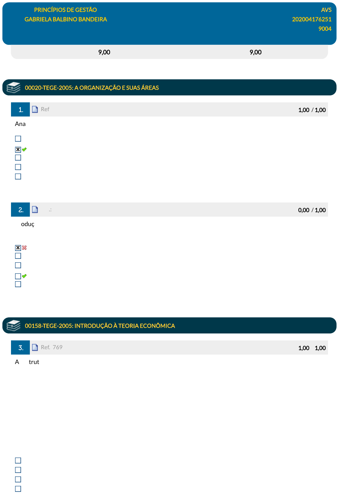 Disciplina: PRINCÍPIOS DE GESTÃO AVS Aluno: GABRIELA BALBINO BANDEIRA 202004176251 Turma: 9004 DGT0005_AVS_202004176251 (AG) 28/11/2023 13:58:37 (F) Avaliação: 9,00 pts Nota SIA: 9,00 pts 00020-TEGE-2005: A ORGANIZAÇÃO E SUAS ÁREAS 1. Ref.: 6065094 Pontos: 1,00 / 1,00 Ana Maria foi contratada para estagiar na área �nanceira. São rotinas, especí�cas, da área que ela trabalhará: Controle de e�ciência das operações. Controle de contas a pagar e a receber. Controle do desempenho dos empregados. Controle de desempenho dos fornecedores. Controle de cadastro de fornecedores. 2. Ref.: 7697891 Pontos: 0,00 / 1,00 Produção empurrada e produção puxada são dois modelos de produção distintos. Assinale a alternativa que indica um exemplo de produção puxada: Loja de chocolates. Restaurante a quilo Perfumaria. Farmácia de manipulação. Livraria. 00158-TEGE-2005: INTRODUÇÃO À TEORIA ECONÔMICA 3. Ref.: 7694534 Pontos: 1,00 / 1,00 As estruturas de mercado são modelos que captam aspectos inerentes de como os mercados estão organizados. Cada estrutura de mercado destaca alguns aspectos essenciais da interação da oferta e da demanda, e se baseiam nas seguintes hipóteses: I. tamanho da empresa; II. diferenciação do produto; III. transparência do mercado e os objetivos dos empresários; IV. acesso de novas empresas e a quantidade de agentes vendedores e compradores atuando no mercado. Estão corretos os itens: III e IV, apenas. I, apenas. III, apenas. I e II, apenas. javascript:alert('C%C3%B3digo da quest%C3%A3o: 6065094.'); javascript:alert('C%C3%B3digo da quest%C3%A3o: 6065094.'); javascript:alert('C%C3%B3digo da quest%C3%A3o: 7697891.'); javascript:alert('C%C3%B3digo da quest%C3%A3o: 7697891.'); javascript:alert('C%C3%B3digo da quest%C3%A3o: 7694534.'); javascript:alert('C%C3%B3digo da quest%C3%A3o: 7694534.'); I, II e IV, apenas. 00221-TEGE-2005: O COTIDIANO DO GESTOR 4. Ref.: 3927459 Pontos: 1,00 / 1,00 Pedro Paulo sabe que o plano de ação descreve como colocar em prática os objetivos de�nidos no planejamento estratégico. Para a identi�cação dos elementos necessários à sua implementação, o plano de ação pode estruturar-se pela ferramenta 5W2H, detalhada nos itens seguintes: I- what? o que será feito, de�nindo-se, nesta coluna, os esforços e custos para a realização das ações. II- who? quem fará o quê?, de�nindo-se, nesta coluna, os responsáveis pela realização das ações. III- when? quando será feito o quê? estabelecendo, nesta coluna, os prazos para realização das ações. IV- why? por que será feito? formulando-se, nesta coluna, quais são os indicativos de necessidade, da importância e da justi�cativa de se executar cada ação. V- how? como será feito? de�nindo-se, nesta coluna, os meios para a execução das ações. Estão corretos os itens: I, III e IV. II, III, IV e V. I, II e IV. I, II e III. I, IV e V. 5. Ref.: 3927452 Pontos: 1,00 / 1,00 Na elaboração do Planejamento estratégico da Fundação Plurimax, Marcus listou, corretamente, no quadro das fraquezas organizacionais: I- carência de capacitação; II- estações de trabalho obsoletas; III- nova legislação que exige modernização dos processos de gestão. Está(ão) correto(s): os itens I, II e III. apenas o item III. apenas os itens I e II. apenas o item II. apenas o item I. 00259-TEGE-2005: MERCADO E FORMAÇÃO DE PREÇOS javascript:alert('C%C3%B3digo da quest%C3%A3o: 3927459.'); javascript:alert('C%C3%B3digo da quest%C3%A3o: 3927459.'); javascript:alert('C%C3%B3digo da quest%C3%A3o: 3927452.'); javascript:alert('C%C3%B3digo da quest%C3%A3o: 3927452.'); 6. Ref.: 7793262 Pontos: 1,00 / 1,00 A fábrica Ceres vende pastéis congelados para restaurantes comerciais. O preço de venda de cada caixa com 10 pastéis é de R$ 12,00. Sabendo que o custo de fabricação de cada pastel é R$ 0,45, assinale a alternativa que indica a margem de contribuição de cada caixa de pastéis. R$ 6,50 R$ 7,50 R$ 4,50 R$ 0,75 R$ 5,50 00263-TEGE-2005: GESTÃO AVANÇADA DA ORGANIZAÇÃO 7. Ref.: 3927646 Pontos: 1,00 / 1,00 Uma organização que pretende desenvolver sua gestão com base em uma cultura de excelência atua de forma transparente com todos os públicos com os quais se relaciona. Assim, alguns autores propõem que a sustentabilidade possui diferentes dimensões: I- Sustentabilidade social, que visa obter a equidade na distribuição de renda para os habitantes do planeta; II- Sustentabilidade ambiental, quando se utiliza os recursos naturais renováveis e limita-se o uso dos não- renováveis; III- Sustentabilidade econômica, que busca métodos de produção egoísticos, colocando em risco a biodiversidade do planeta. É correto o que se a�rma em: III, apenas. I e II, apenas. I, apenas. II e III, apenas. I, II e III. 8. Ref.: 6042400 Pontos: 1,00 / 1,00 A globalização é um fenômeno mundial que tem mudado a sociedade nos aspectos sociais, econômicos, políticos e culturais. Sobre a economia globalizada assinale a alternativa correta. quase anulou os con�itos étnicos e religiosos em todo o planeta. reduziu a participação das empresas transnacionais ao redor do mundo. homogeneizou as culturas e reduziu as discrepâncias econômicas entre os países. deu visibilidade às minorias, a povos e culturas de recantos isolados do mundo. integrou economias e possibilitou a difusão de hábitos dos lugares pelo mundo. 00371-TEGE-2005: PENSAMENTO SISTÊMICO 9. Ref.: 7818620 Pontos: 1,00 / 1,00 javascript:alert('C%C3%B3digo da quest%C3%A3o: 7793262.'); javascript:alert('C%C3%B3digo da quest%C3%A3o: 7793262.'); javascript:alert('C%C3%B3digo da quest%C3%A3o: 3927646.'); javascript:alert('C%C3%B3digo da quest%C3%A3o: 3927646.'); javascript:alert('C%C3%B3digo da quest%C3%A3o: 6042400.'); javascript:alert('C%C3%B3digo da quest%C3%A3o: 6042400.'); javascript:alert('C%C3%B3digo da quest%C3%A3o: 7818620.'); javascript:alert('C%C3%B3digo da quest%C3%A3o: 7818620.'); A e�c