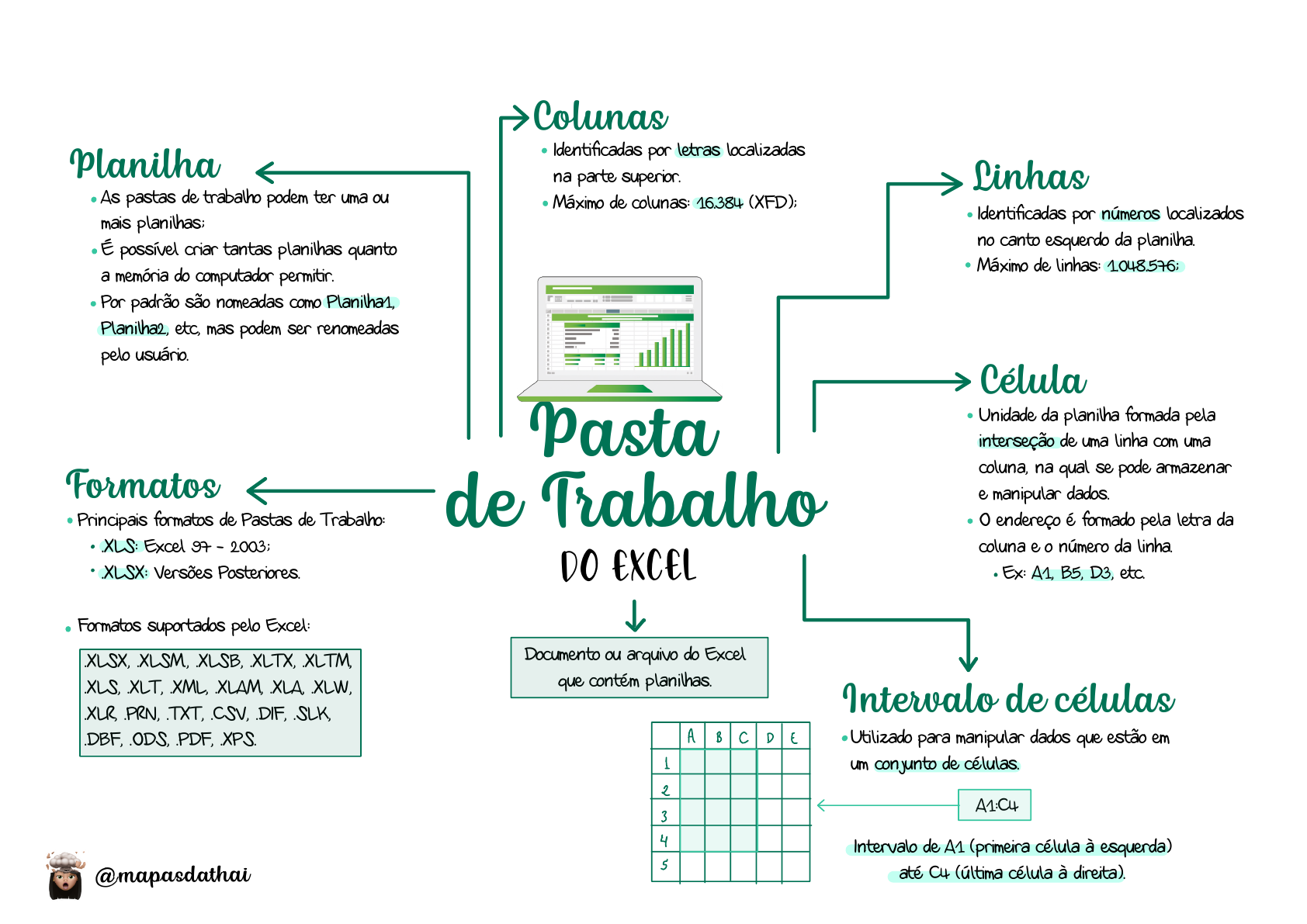 Pasta de Trabalho Colunas Linhas Célula Formatos Intervalo de células Planilha Documento ou arquivo do Excel que contém planilhas. As pastas de trabalho podem ter uma ou mais planilhas; É possível criar tantas planilhas quanto a memória do computador permitir. Por padrão são nomeadas como Planilha1, Planilha2, etc, mas podem ser renomeadas pelo usuário. Principais formatos de Pastas de Trabalho: .XLS: Excel 97 - 2003; .XLSX: Versões Posteriores. Formatos suportados pelo Excel: Identificadas por números localizados no canto esquerdo da planilha. Máximo de linhas: 1.048.576; Identificadas por letras localizadas na parte superior. Máximo de colunas: 16.384 (XFD); Unidade da planilha formada pela interseção de uma linha com uma coluna, na qual se pode armazenar e manipular dados. O endereço é formado pela letra da coluna e o número da linha. Ex: A1, B5, D3, etc. Utilizado para manipular dados que estão em um conjunto de células. Intervalo de A1 (primeira célula à esquerda) até C4 (última célula à direita). A1:C4 .XLSX, .XLSM., .XLSB, .XLTX, .XLTM, .XLS, .XLT, .XML, .XLAM, .XLA, .XLW, .XLR, .PRN, .TXT, .CSV, .DIF, .SLK, .DBF, .ODS, .PDF, .XPS. do Excel × i→ 05984834383 - paulo sergio Fórmulas Constantes Operadores ReferênciasFunções Sequência de valores constantes, operadores, referências e células e, até mesmo, outras funções predefinidas. Valor fixo ou estático que não é modificado no Excel. Especificam o tipo de cálculo que se pretende efetuar. Ex: + (adição), % (porcentagem), ^ (exponenciação). Localização de uma célula ou intervalo de células; Permite utilizar em uma fórmula dados espalhados pela planilha ou até de outra. Fórmulas predefinidas capazes de efetuar cálculos utilizando argumentos em uma sintaxe específica. = 1000 - ABS(-2) * D5 Uma fórmula sempre Começa com o sinal de = do Excel 05984834383 - paulo sergio Operadores Aritméticos Comparativos de Concatenação de Textos Precedência de de Referência Adição Subtração/Negação Multiplicação Divisão Porcentagem Exponenciação Igual a Maior que Menor que Maior ou igual a Menor ou igual a Diferente de Liga dois valores e produz um valor de texto contínuo Operador de intervalo (ATÉ) Operador de união (E) Operador de interseção 1 Operadores de referência 2 Negação 3 Porcentagem 4 Exponenciação/Radiciação 5 Multiplicação e Divisão 6 Adição e Subtração 7 Concatenação de texto (&) 8 Comparação A fórmula é calculada da esquerda p/ a direita operadoresdo Excel ÷ : 7 ÷ - - É "" , f Ê ← 05984834383 - paulo sergio Referências Relativa Absoluta A outras planilhas Mista Identifica a localização de uma célula (ou intervalo de células) em uma planilha e informa ao Excel onde procurar pelos valores/dados a serem usados em uma fórmula. Estilo de Referência A1: Colunas identificadas por letras e linhas identificadas por números. Estilo de Referência L1C1: Linhas e colunas identificadas por números. Alça de Preenchimento: permite copiar o conteúdo de uma célula em outras e preencher números, datas e outros elementos com base em um padrão (existente ou personalizado). Alça de Preenchimento + CTRL: apenas copia e cola. A fórmula de uma determinada célula depende de sua posição relativa às referências originais. Utiliza-se o operador $ (cifrão) p/ congelar uma referência ou endereço (linha ou coluna) de modo que ele não seja alterado ao copiar ou colar. Sintaxe: $[coluna]$[linha] Ex: $C$7 Linha absoluta e coluna relativa (A$1) Ao copiar, a linha permanecerá inalterada e a coluna mudará. Linha relativa e coluna absoluta ($A1) Ao copiar, apenas a linha mudará e a coluna permanecerá inalterada. Utiliza-se o operador ! (exclamação). Na mesma pasta de trabalho: Sintaxe: =PLANILHA!CÉLULA Em outra pasta de trabalho aberta: =[PASTA]PLANILHA!CÉLULA Em outra pasta de trabalho fechada: =‘UNIDADE:\DIRETÓRIO\[ARQUIVO.XLS]PLANILHA’!CÉLULA Não há diferenciação entre letras maiúsculas e minúsculas. do Excel÷ . ? - 05984834383 - paulo sergio Funções EstatísticasMatemáticas e Sintaxe: =NOMEDAFUNÇÃO[ARGUMENTO] Excepcionalmente as funções podem iniciar com @(arroba), + (soma) ou - (subtração). Função Aninhada: quando uma função contém outra função como argumento. e Trigonométricas Principais ALEATÓRIO() Retorna um número aleatório maior ou igual a 0 e menor que 1. ARRED() Arredonda o número para um número especificado de dígitos. MOD() Retorna o resto depois da divisão. MULT() Multiplica todos os números especi- ficados como argumentos e retorna o produto. POTÊNCIA() Retorna o resultado de um nú- mero elevado a uma potência. SOMA() Soma todos os números em um inter- valo de células. SOMASE() Soma os valores em um intervalo que atenderem aos critérios especificados. SOMASES() Adiciona todos os argumentos que atendem a vários critérios. TRUNCAR() Remove a parte decimal ou fra- cionária de um número. Não arredonda, apenas descarta. CONT.NÚM() Conta o número de células que contém números e conta os números na lista de argumentos. CONT.VALORES() Conta quantas células de um intervalo não estão vazias. CONT.SE() Conta quantas células em um in- tervalo satisfazem a um critério ou condição. CONT.SES() Aplica critérios a células em vá- rios intervalos e conta o número de vezes que todos os critérios foram atendidos. MÉDIA() Retorna a média aritmética dos argu- mentos. MÍNIMO() Retorna o menor número da lista de argumentos. MAXIMO() Retorna o valor máximo de uma lista de argumentos. MENOR() Retorna o k-ésimo menor do conjunto de dados (terceiro menor, segundo menor...). MAIOR() Retorna o k-ésimo maior do conjunto de dados (terceiro maior, segundo maior...). do Excel Parte 1ii. Iii 05984834383 - paulo sergio Texto CONCATENAR() Agrupa várias cadeias de texto em uma única sequência de texto (Usa-se aspas para acrescentar um espaço entre as palavras). Também é possível util