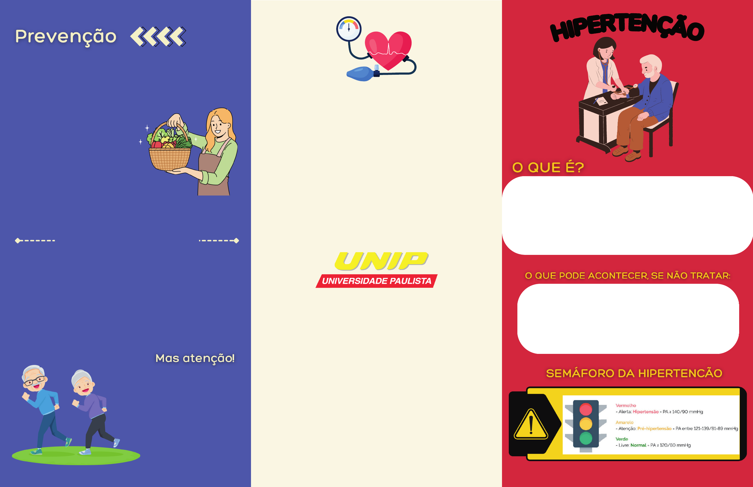 ELABORADO POR ALUNOS DA ÁREA DE FARMÁCIA: Alexsandra Cerqueira Beatriz Andrade Dálety Silva Hellen Silva Heitor Vinicius Antônio Janaina Menezes Jose Góes Samanta Horácio Orientador e supervisor: Prof.º Tércio Martins Clínica de Saúde UNIP - Chácara Santo Antônio Rua São Sebastião, 667 - Chácara Santo Antônio Contato: (11) 2114-4066 REFERÊNCIAS: BRASIL. Ministério da Saúde. Hipertensão (pressão alta). Brasília, 2023. Disponível em:https://www.gov.br/saude/pt- br/assuntos/saude-de-a-a-z/h/hipertensao Acesso em: outubro, 2023. BRASIL. Ministério da Saúde. Diretrizes Brasileiras de Hipertensão Arterial. Brasília, 2020. Disponível em: https://www.gov.br/saude/pt-br/assuntos/saude-de-a-a- z/h/hipertensao Acesso em: outubro, 2023 Sociedade Brasileira de Cardiologia. VII Diretrizes Brasileiras de Hipertensão Arterial. Arquivos Brasileiros de Cardiologia, 2016;107(3 Supl.3):1-83. HIPERTENÇÃOHIPERTENÇÃO A hipertensão arterial é uma doença crónica, caracterizada pela elevação dos níveis da pressão sanguínea nas artérias que ficam estreitas e elásticas dificultando o bombeamento do sangue para o corpo, a hipertensão arterial ocorre quando os níveis estão acima de 140 x 90 mmHg. Fonte: Ministéiro da Saúde, 2020. • Acidente Vascular Cerebral (AVC - Derrame); • Doença Renal Crônica (doença dos rins); • Insuficiência Cardíaca (coração crescido); • Diabetes; • Doença arterial periférica (doença dos vasos das pernas). Prefira temperos caseiros como alecrim, cebola, coentro, gengibre e alimentos preparados de modo natural (caseiro) evitando processados com alto teor de sódio. Evitar a ingestão de carne vermelha, doces e bebidas com açúcar. Assim reduzindo a quantidade de sal. Dieta composta por frutas, hortaliças e laticínios com baixo teor de gordura, cereais integrais, frango, peixe e frutas oleaginosas. Tratamento não medicamentoso É recomendado a prática de atividades de intensidade leve a moderada, com 40 a 60 minutos de duração e frequência de 3 a 4 vezes por semana como natação caminhada, corrida, ciclismo e musculação que auxiliam na melhora auxilia na melhora da força, resistência muscular, do metabolismo e da função cardiovascular. Os pacientes hipertensos devem evitar esforços intensos, bloqueio de respiração, cargas muito pesadas e sempre checar a pressão antes, durante e depois do treino. Sintomas Tratamento medicamentoso e Mecanismo de ação O diagnostico deve ser confirmado após algumas consultas, com intervalo ideal de 2 a 4 consultas semanais. Nos casos de pacientes que apresentam pressão maior ou igual a 180/110 mmHg e houver indícios de doença cardiovascular, o diagnóstico pode ser definido na primeira consulta. Em casos de pacientes com hipertensão mascarada e com síndrome do avental branco, poderá ser monitorada na residência ou com o exame MAPA, que vão considerar as medidas no intervalo de 24 horas. A hipertensão é uma doença silenciosa, mas quando sinais e sintomas são observados o paciente deve se alertar pois o quadro da doença pode estar evoluindo para um problema maior. Sintomas a ser observados são: Uso de cigarro e derivados do tabaco Diabetes Mellitus e níveis altos de colesterol Consumo de bebidas alcoólicas Obesidade, má alimentação e sedentarismo Histórico familiar e idade avançada Diuréticos - hidroclorotiazida reduzem a pressão arterial ao eliminar o excesso de sódio e água do corpo. Inibidores da ECA (Enzima Conversora de Angiotensina) - enalapril e o lisinopril relaxam os vasos sanguíneos, permitindo que o sangue flua mais facilmente. Bloqueadores dos Receptores de Angiotensina (BRA) - losartan e o valsartan ajudando a relaxar os vasos sanguíneos. Betabloqueadores - metoprolol e o atenolol, diminuem a frequência cardíaca e a força das contrações do coração. Bloqueadores dos Canais de Cálcio - amlodipina e a nifedipina relaxam os músculos das paredes arteriais, permitindo que as artérias se dilatem Dispositivos automáticos ou digitais residenciais; aplicativos e Wearables (Dispositivos Vestíveis) que através de sensores em relógios inteligentes permitem o monitoramento e controle da pressão arterial gerando benefícios aos usuários como: • Acompanhamento frequente e individualizado dos níveis de pressão arterial. • Comodidade de monitorar a pressão arterial em casa ou em movimento • Registro detalhado dos valores de pressão arterial