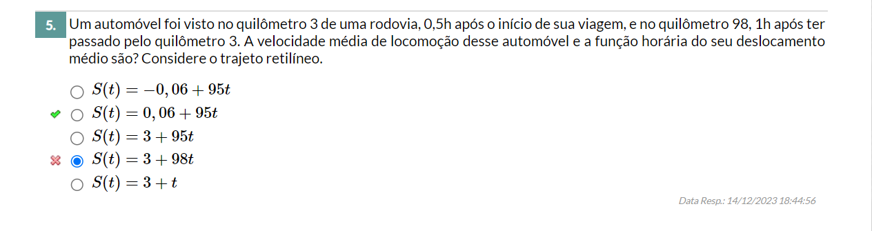 Um automóvel foi visto no quilômetro 3 de uma rodovia, 0,5h após o início de sua viagem, e no quilômetro 98, 1h após ter passado pelo quilômetro 3. A velocidade média de locomoção desse automóvel e a função horária do seu deslocamento médio são? Considere o trajeto retilíneo. S(t) = -0,06 + 95t = S(t)