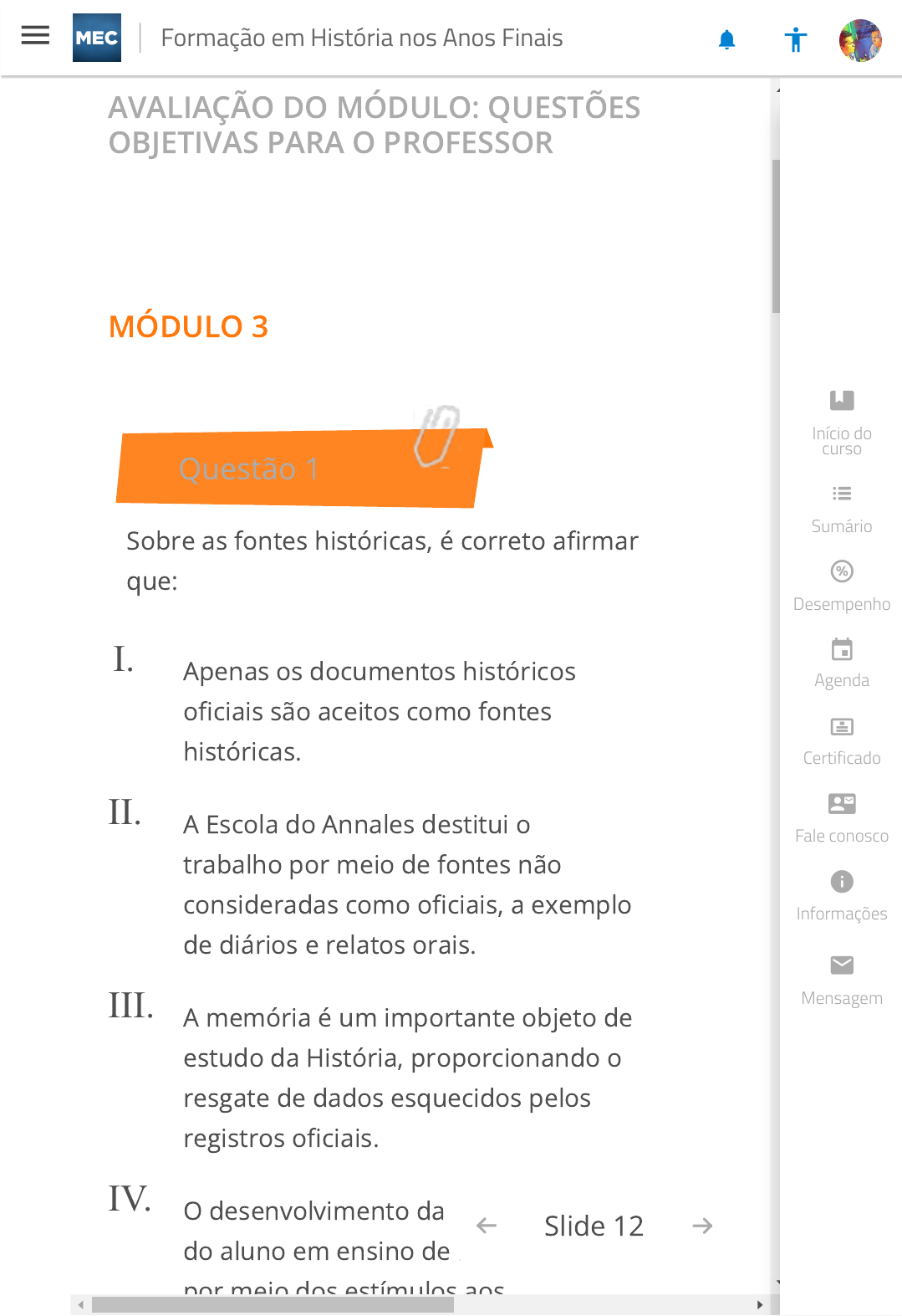 19/12/2023, 08:47 Formação em História nos Anos Finais - AVAMEC https://avamec.mec.gov.br/#/instituicao/seb/curso/15678/unidade/10076/acessar 1/1 AVALIAÇÃO DO MÓDULO: QUESTÕES OBJETIVAS PARA O PROFESSOR MÓDULO 3 Sobre as fontes históricas, é correto a�rmar que: Apenas os documentos históricos o�ciais são aceitos como fontes históricas. I. A Escola do Annales destitui o trabalho por meio de fontes não consideradas como o�ciais, a exemplo de diários e relatos orais. II. A memória é um importante objeto de estudo da História, proporcionando o resgate de dados esquecidos pelos registros o�ciais. III. O desenvolvimento da aprendizagem do aluno em ensino de História se dá por meio dos estímulos aos IV. Questão 1 Slide 12 Início do curso Sumário Desempenho Agenda Certificado Fale conosco Informações Mensagem Formação em História nos Anos Finais https://avamec.mec.gov.br/ava-mec-ws/instituicao/seb/conteudo/modulo/4531/mod3/uni2/slide13.html https://avamec.mec.gov.br/ava-mec-ws/instituicao/seb/conteudo/modulo/4531/mod3/uni2/slide11.html