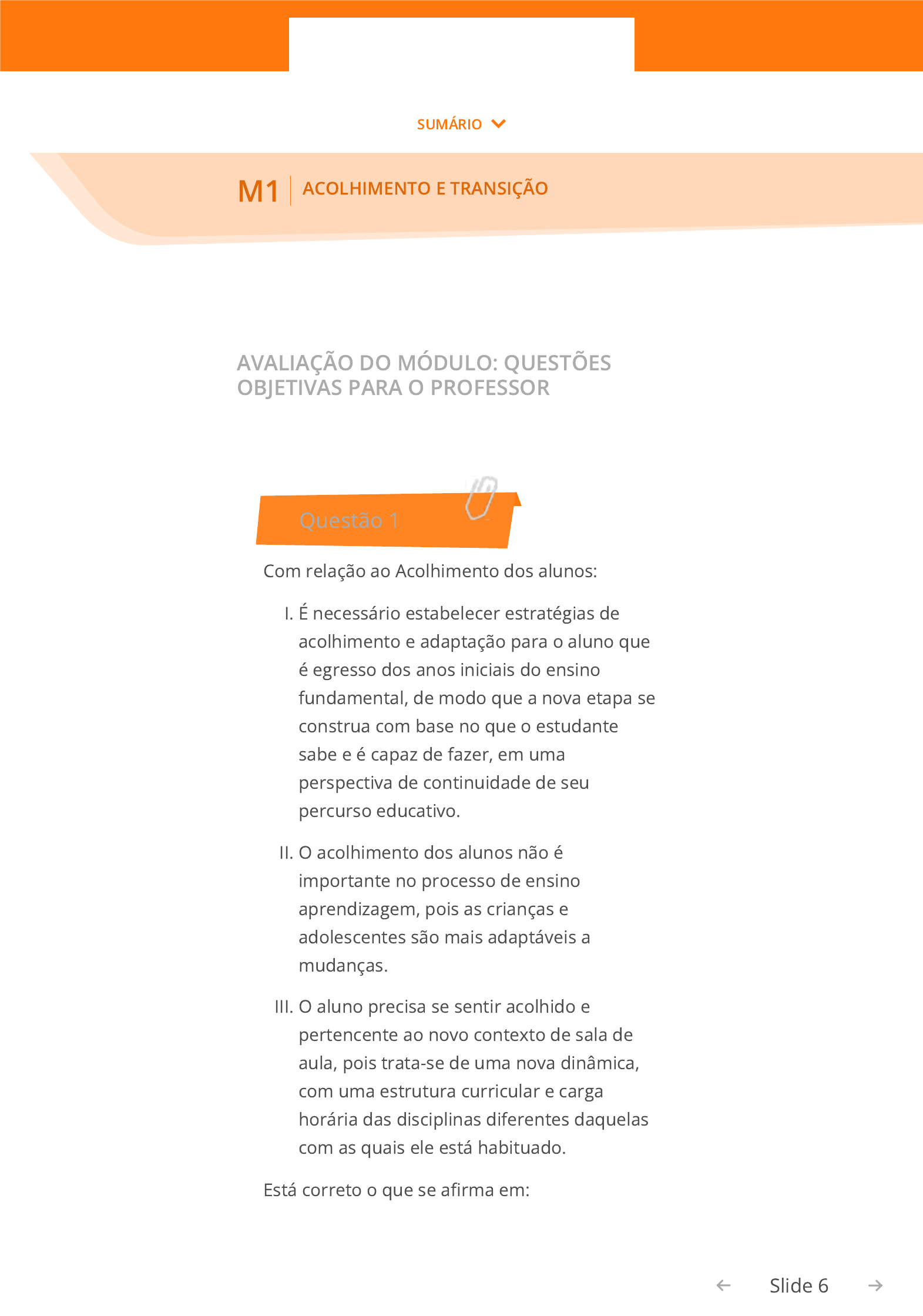 19/12/2023, 09:39 ACOLHIMENTO E TRANSIÇÃO https://avamec.mec.gov.br/#/instituicao/seb/curso/15678/unidade/10074/acessar?continue=false 1/4 AVALIAÇÃO DO MÓDULO: QUESTÕES OBJETIVAS PARA O PROFESSOR Com relação ao Acolhimento dos alunos: I. É necessário estabelecer estratégias de acolhimento e adaptação para o aluno que é egresso dos anos iniciais do ensino fundamental, de modo que a nova etapa se construa com base no que o estudante sabe e é capaz de fazer, em uma perspectiva de continuidade de seu percurso educativo. II. O acolhimento dos alunos não é importante no processo de ensino aprendizagem, pois as crianças e adolescentes são mais adaptáveis a mudanças. III. O aluno precisa se sentir acolhido e pertencente ao novo contexto de sala de aula, pois trata-se de uma nova dinâmica, com uma estrutura curricular e carga horária das disciplinas diferentes daquelas com as quais ele está habituado. Está correto o que se a�rma em: Questão 1 M1 ACOLHIMENTO E TRANSIÇÃO SUMÁRIO Slide 6 https://avamec.mec.gov.br/ava-mec-ws/instituicao/seb/conteudo/modulo/4531/mod1/uni2/slide07.html https://avamec.mec.gov.br/ava-mec-ws/instituicao/seb/conteudo/modulo/4531/mod1/uni2/slide05.html 19/12/2023, 09:39 ACOLHIMENTO E TRANSIÇÃO https://avamec.mec.gov.br/#/instituicao/seb/curso/15678/unidade/10074/acessar?continue=false 2/4 I e II.a I e III. b I, II e III.c Todas as a�rmações são verdadeiras. d O ato de acolher está diretamente ligado às quatro competências de caráter socioemocional apresentadas na BNCC, que inclui, exceto: Conhecer-se, apreciar-se e cuidar de sua saúde física e emocional, compreendendo-se na diversidade humana e reconhecendo suas emoções e as dos outros, com autocrítica e capacidade para lidar com elas. a Exercitar a empatia, o diálogo, a resolução de con�itos e a cooperação, fazendo-se respeitar e promovendo o respeito ao outro e aos direitos humanos, com acolhimento e valorização da diversidade de indivíduos e de grupos sociais, seus saberes, identidades, culturas e potencialidades, sem preconceitos de qualquer natureza. b Questão 2 Slide 6 https://avamec.mec.gov.br/ava-mec-ws/instituicao/seb/conteudo/modulo/4531/mod1/uni2/slide07.html https://avamec.mec.gov.br/ava-mec-ws/instituicao/seb/conteudo/modulo/4531/mod1/uni2/slide05.html 19/12/2023, 09:39 ACOLHIMENTO E TRANSIÇÃO https://avamec.mec.gov.br/#/instituicao/seb/curso/15678/unidade/10074/acessar?continue=false 3/4 Valorizar e fruir as diversas manifestações artísticas e culturais, das locais às mundiais, e também participar de práticas diversi�cadas da produção artístico-cultural. c Agir pessoal e coletivamente com autonomia, responsabilidade, �exibilidade, resiliência e determinação, tomando decisões com base em princípios éticos, democráticos, inclusivos, sustentáveis e solidários. d Sobre a transição é falso a�rmar que: A transição não deve ser encarada como uma oportunidade de ajudar os alunos a compreender suas novas responsabilidades e deveres. a É imprescindível que se tenha um esforço conjunto de todos os presentes no ambiente escolar e também dos familiares dos alunos. b O período de transição pode vir acompanhado de ansiedade. c Questão 3 Slide 6 https://avamec.mec.gov.br/ava-mec-ws/instituicao/seb/conteudo/modulo/4531/mod1/uni2/slide07.html https://avamec.mec.gov.br/ava-mec-ws/instituicao/seb/conteudo/modulo/4531/mod1/uni2/slide05.html 19/12/2023, 09:39 ACOLHIMENTO E TRANSIÇÃO https://avamec.mec.gov.br/#/instituicao/seb/curso/15678/unidade/10074/acessar?continue=false 4/4 Refazer Atividade Respondidas 3 de 3 questões Progresso do Módulo VOLTAR 6 de 7 AVANÇAR 1 2 3 4 5 6 7 Realização Apesar dos desa�os que esse processo de transição possivelmente apresenta, ele não deve ser considerado como um problema para a escola. d Parabéns! Você chegou ao �nal do Módulo 1 da Formação em História nos Anos Finais! Esperamos que você tenha aproveitado o conteúdo estudado. Se quiser aprofundar ainda mais seus estudos, veja a referência no próximo slide. Slide 6 https://avamec.mec.gov.br/ava-mec-ws/instituicao/seb/conteudo/modulo/4531/mod1/uni2/slide05.html https://avamec.mec.gov.br/ava-mec-ws/instituicao/seb/conteudo/modulo/4531/mod1/uni2/slide07.html https://avamec.mec.gov.br/ava-mec-ws/instituicao/seb/conteudo/modulo/4531/mod1/uni1/slide01.html https://avamec.mec.gov.br/ava-mec-ws/instituicao/seb/conteudo/modulo/4531/mod1/uni1/slide02.html https://avamec.mec.gov.br/ava-mec-ws/instituicao/seb/conteudo/modulo/4531/mod1/uni1/slide03.html https://avamec.mec.gov.br/ava-mec-ws/instituicao/seb/conteudo/modulo/4531/mod1/uni1/slide04.html https://avamec.mec.gov.br/ava-mec-ws/instituicao/seb/conteudo/modulo/4531/mod1/uni2/slide05.html https://avamec.mec.gov.br/ava-mec-ws/instituicao/seb/conteudo/modulo/4531/mod1/uni2/slide06.html https://avamec.mec.gov.br/ava-mec-ws/instituicao/seb/conteudo/modulo/4531/mod1/uni2/slide07.html https://avamec.mec.gov.br/ava-mec-ws/instituicao/seb/conteudo/modulo/4531/mod1/uni2/slide07.html https://avamec.mec.gov.br/ava-mec-ws/instituicao/seb/conteudo/modulo/4531/mod1/uni2/slide05.html