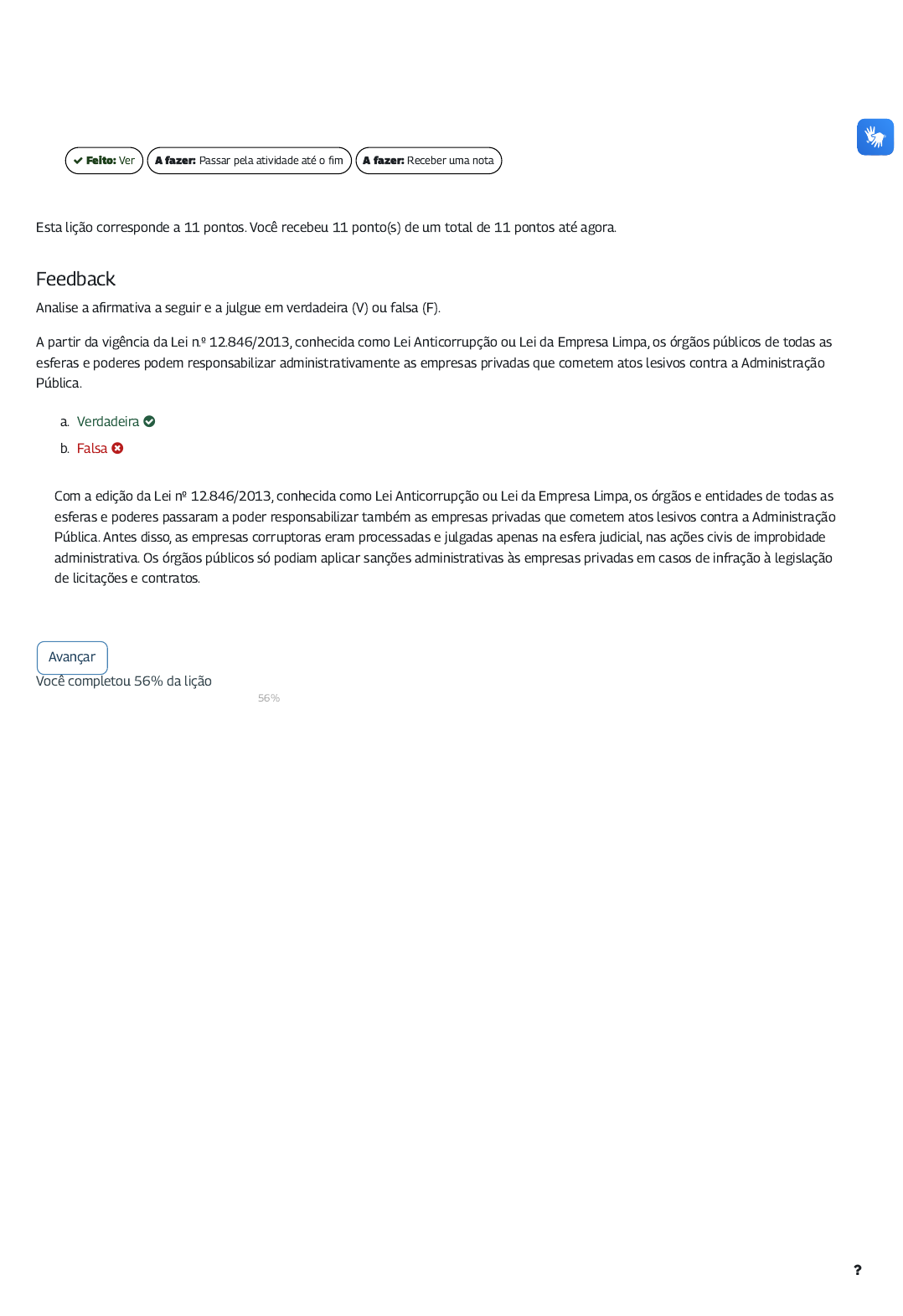 19/12/23, 16:07 atividade_correcional | - Turma DEZ/2023: Conteúdo - Módulo 1: Feedback Questão 11 https://mooc41.escolavirtual.gov.br/mod/lesson/view.php 1/2 Esta lição corresponde a 11 pontos. Você recebeu 11 ponto(s) de um total de 11 pontos até agora. Feedback Analise a a�rmativa a seguir e a julgue em verdadeira (V) ou falsa (F). A partir da vigência da Lei n.º 12.846/2013, conhecida como Lei Anticorrupção ou Lei da Empresa Limpa, os órgãos públicos de todas as esferas e poderes podem responsabilizar administrativamente as empresas privadas que cometem atos lesivos contra a Administração Pública. a. Verdadeira b. Falsa Com a edição da Lei nº 12.846/2013, conhecida como Lei Anticorrupção ou Lei da Empresa Limpa, os órgãos e entidades de todas as esferas e poderes passaram a poder responsabilizar também as empresas privadas que cometem atos lesivos contra a Administração Pública. Antes disso, as empresas corruptoras eram processadas e julgadas apenas na esfera judicial, nas ações civis de improbidade administrativa. Os órgãos públicos só podiam aplicar sanções administrativas às empresas privadas em casos de infração à legislação de licitações e contratos. Avançar Você completou 56% da lição 56% Feito: Ver A fazer: Passar pela atividade até o �m A fazer: Receber uma nota 19/12/23, 16:07 atividade_correcional | - Turma DEZ/2023: Conteúdo - Módulo 1: Feedback Questão 11 https://mooc41.escolavirtual.gov.br/mod/lesson/view.php 2/2