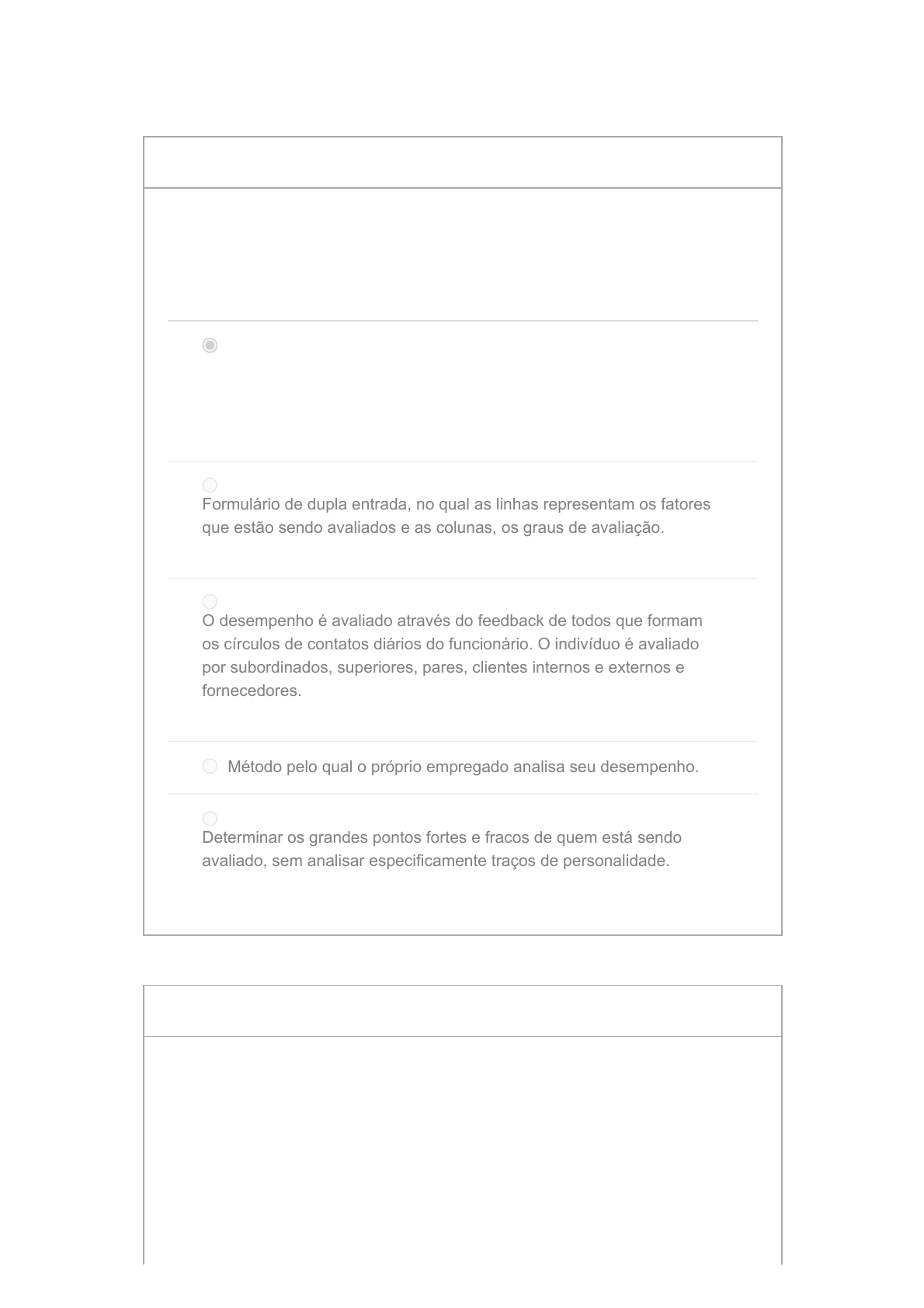 4/11/22, 8:12 AM Prova Eletrônica: Gestão da Pessoas https://dombosco.instructure.com/courses/9260/quizzes/24282 1/7 Pontuação desta tentativa: 30 de 30 Enviado 11 abr em 8:11 Esta tentativa levou 20 minutos. 3 / 3 ptsPergunta 1 Dentre os diversos métodos de avaliação de desempenho, qual das seguintes descrições melhor descreve o método de relatório? Um dos procedimentos mais simples de avaliação de desempenho, constituindo-se num parecer do superior em relação ao desempenho do subordinado. Formulário de dupla entrada, no qual as linhas representam os fatores que estão sendo avaliados e as colunas, os graus de avaliação. O desempenho é avaliado através do feedback de todos que formam os círculos de contatos diários do funcionário. O indivíduo é avaliado por subordinados, superiores, pares, clientes internos e externos e fornecedores. Método pelo qual o próprio empregado analisa seu desempenho. Determinar os grandes pontos fortes e fracos de quem está sendo avaliado, sem analisar especificamente traços de personalidade. 3 / 3 ptsPergunta 2 É uma contribuição da Escola de Administração Clássica para a evolução da área de gestão de pessoas: 4/11/22, 8:12 AM Prova Eletrônica: Gestão da Pessoas https://dombosco.instructure.com/courses/9260/quizzes/24282 2/7 Divisão do trabalho, padronização das atividades, simplificação dos movimentos, tempo padrão para cada atividade. Ambiente de trabalho em melhores condições: mais luminosidade, menos ruídos, mais limpo. Produtividade depende muito mais do comportamento das pessoas do que dos métodos. Investimento no trabalho em equipe para implantar com sucesso o just- in-time e a produção flexível. Criação de mecanismos formais de retenção e de disseminação dos conhecimentos. 3 / 3 ptsPergunta 3 No processo de descrição de um cargo, é necessário levantar várias informações. Assinale a alternativa que se remete a informações relativas a responsabilidades do cargo: Descrição minuciosa das atividades desempenhadas no cargo, levando em conta as tarefas realizadas diariamente, semanalmente e mensalmente. Mapeamento que se remete se o cargo é responsável pela supervisão de pessoas, materiais, ferramentas, equipamentos, dinheiro; documentos; informações sobre clientes ou sobre o desempenho da empresa. 4/11/22, 8:12 AM Prova Eletrônica: Gestão da Pessoas https://dombosco.instructure.com/courses/9260/quizzes/24282 3/7 Mapeamento que se remete se os recursos necessários à execução adequada das atividades dos cargos, por exemplo necessidade de computador para registro de dados e fornecimento de informações, necessidade de veículo próprio. Especificação de quão penosas, desagradáveis ou arriscadas são as condições de trabalho. Atributos pessoais: características de personalidade, nível intelectual, interesses, características físicas. Conhecimentos, habilidades e atitudes. 3 / 3 ptsPergunta 4 Dentre os diversos subsistemas de gestão de pessoas, identifique o que que auxilia no preenchimento da requisição de pessoal, garantindo uma padronização do perfil organizacional: Área de treinamento e desenvolvimento. Área de recrutamento e seleção. Área de higiene e segurança do trabalho. Área de avaliação de desempenho. Área de cargos e salários. 3 / 3 ptsPergunta 5 O método de análise de cargo por sistema de pontos, se caracteriza por: 4/11/22, 8:12 AM Prova Eletrônica: Gestão da Pessoas https://dombosco.instructure.com/courses/9260/quizzes/24282 4/7 Organizar os cargos por seu valor relativo e representa o método mais simples e mais antigo de avaliação. Consiste basicamente em listar os deveres e as responsabilidades de cada cargo na ordem de importância deles. Estabelecer graus de classificação, pela identificação de algum denominador comum (que pode ser conhecimentos, aptidões ou responsabilidades) para a criação de classes ou graus distintos de cargos. Depois disso, as classificações são dispostas em uma ordem geral de importância. Considerar cargos-chave na organização para serem considerados os “padrões”. Então os cargos podem ser avaliados levando-se em consideração fatores compensáveis, como habilidade, esforço mental, esforço físico, responsabilidade e condições de trabalho. Ser um método quantitativo, em que são determinados os valores relativos de cada cargo e são calculados pontos totais atribuídos a eles. Ser um método que se avalia a formação do funcionário e o cargo é descrito de acordo com sua escolaridade. 3 / 3 ptsPergunta 6 É um fator interno da composição do salário: Custo de vida. Faixa salarial regional. Negociação coletiva Requisitos legais. 4/11/22, 8:12 AM Prova Eletrônica: Gestão da Pessoas https://dombosco.instructure.com/courses/9260/quizzes/24282 5/7 Política de remuneração da empresa. 3 / 3 ptsPergunta 7 No processo de descrição de um cargo, é necessário levantar várias informações. Assinale a alternativa que se remete a informações relativas a requisitos pessoais do cargo: Descrição minuciosa das atividades desempenhadas no cargo, levando em conta as tarefas realizadas diariamente, semanalmente e mensalmente. Mapeamento que se remete se o cargo é responsável pela supervisão de pessoas, materiais, ferramentas, equipamentos, dinheiro; documentos; informações sobre clientes ou sobre o desempenho da empresa. Mapeamento que se remete se os recursos necessários à execução adequada das atividades dos cargos, por exemplo necessidade de computador para registro de dados e fornecimento de informações, necessidade de veículo próprio. Especificação de quão penosas, desagradáveis ou arriscadas são as condições de trabalho. Atributos pessoais: características de personalidade, nível intelectual, interesses, características físicas. Conhecimentos, habilidades e atitudes. 3 / 3 ptsPergunta 8 4/11/22, 8:12 AM Prova Eletrônica: Gestão da Pessoas https://dombos