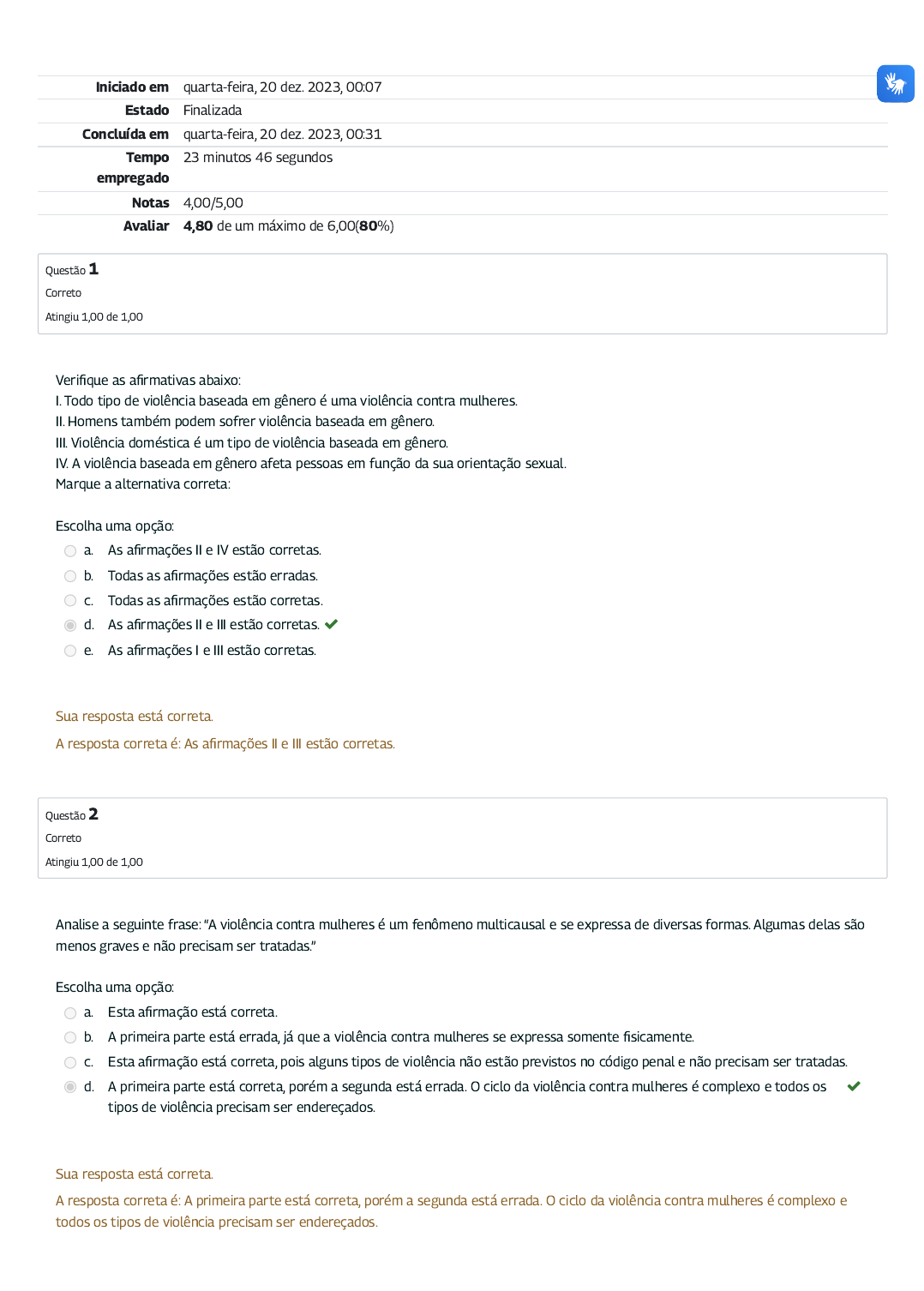 20/12/2023, 00:31 Atividade avaliativa 1: Revisão da tentativa https://mooc41.escolavirtual.gov.br/mod/quiz/review.php?attempt=862763&cmid=24324 1/3 Iniciado em quarta-feira, 20 dez. 2023, 00:07 Estado Finalizada Concluída em quarta-feira, 20 dez. 2023, 00:31 Tempo empregado 23 minutos 46 segundos Notas 4,00/5,00 Avaliar 4,80 de um máximo de 6,00(80%) Questão 1 Correto Atingiu 1,00 de 1,00 Questão 2 Correto Atingiu 1,00 de 1,00 Veri�que as a�rmativas abaixo: I. Todo tipo de violência baseada em gênero é uma violência contra mulheres. II. Homens também podem sofrer violência baseada em gênero. III. Violência doméstica é um tipo de violência baseada em gênero. IV. A violência baseada em gênero afeta pessoas em função da sua orientação sexual. Marque a alternativa correta: Escolha uma opção: a. As a�rmações II e IV estão corretas. b. Todas as a�rmações estão erradas. c. Todas as a�rmações estão corretas. d. As a�rmações II e III estão corretas. e. As a�rmações I e III estão corretas. Sua resposta está correta. A resposta correta é: As a�rmações II e III estão corretas. Analise a seguinte frase: “A violência contra mulheres é um fenômeno multicausal e se expressa de diversas formas. Algumas delas são menos graves e não precisam ser tratadas.” Escolha uma opção: a. Esta a�rmação está correta. b. A primeira parte está errada, já que a violência contra mulheres se expressa somente �sicamente. c. Esta a�rmação está correta, pois alguns tipos de violência não estão previstos no código penal e não precisam ser tratadas. d. A primeira parte está correta, porém a segunda está errada. O ciclo da violência contra mulheres é complexo e todos os tipos de violência precisam ser endereçados. Sua resposta está correta. A resposta correta é: A primeira parte está correta, porém a segunda está errada. O ciclo da violência contra mulheres é complexo e todos os tipos de violência precisam ser endereçados. 20/12/2023, 00:31 Atividade avaliativa 1: Revisão da tentativa https://mooc41.escolavirtual.gov.br/mod/quiz/review.php?attempt=862763&cmid=24324 2/3 Questão 3 Incorreto Atingiu 0,00 de 1,00 Questão 4 Correto Atingiu 1,00 de 1,00 Questão 5 Correto Atingiu 1,00 de 1,00 Qual a importância do marco normativo sobre os direitos de mulheres? Escolha uma opção: a. Visa garantir que Estados assegurem seus direitos básicos. b. Destina-se à promoção da igualdade de gênero. c. Deve ser avançado em detrimento dos direitos dos homens. d. As alternativas a e b estão corretas. e. As alternativas a, b e c estão corretas. Sua resposta está incorreta. A resposta correta é: As alternativas a e b estão corretas. Quais das violências abaixo con�guram como um tipo de violência contra mulheres: Escolha uma opção: a. Violência patrimonial. b. Violência física. c. Todas as alternativas estão corretas. d. Violência moral. e. Violência psicológica. Sua resposta está correta. A resposta correta é: Todas as alternativas estão corretas. Qual a importância de entender os papéis de gênero? Escolha uma opção: a. Eles geram expectativas sobre como devemos nos comportar. b. Eles podem nos tornar mais ou menos vulneráveis a certos tipos de violência. c. Todas as alternativas estão corretas. d. Eles in�uenciam o que as pessoas pensam a nosso respeito. e. Eles podem determinar nossas oportunidades. Sua resposta está correta. A resposta correta é: Todas as alternativas estão corretas. 20/12/2023, 00:31 Atividade avaliativa 1: Revisão da tentativa https://mooc41.escolavirtual.gov.br/mod/quiz/review.php?attempt=862763&cmid=24324 3/3