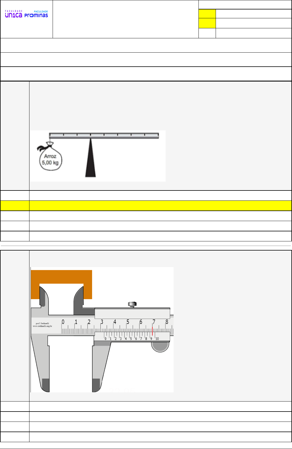 Pincel Atômico - 20/12/2023 10:06:20 1/5 MATEUS SOARES DE OLIVEIRA Avaliação Online (SALA EAD) Atividade finalizada em 02/04/2023 21:11:07 (787530 / 1) LEGENDA Resposta correta na questão # Resposta correta - Questão Anulada X Resposta selecionada pelo Aluno Disciplina: FÍSICA EXPERIMENTAL I [778718] - Avaliação com 10 questões, com o peso total de 30,00 pontos [capítulos - 4,5,6] Turma: Segunda Graduação: Física para Licenciados - Grupo: MARÇO/2023 - SEGFISLIC/MAR23 [79990] Aluno(a): 91438565 - MATEUS SOARES DE OLIVEIRA - Respondeu 9 questões corretas, obtendo um total de 27,00 pontos como nota [357410_1465 10] Questão 001 Enem 2015) Em um experimento, um professor levou para a sala de aula um sa-co de arroz, um pedaço de madeira triangular e uma barra de ferro cilíndrica e homogênea. Ele propôs que fizessem a medição da massa da barra utilizando esses objetos. Para isso, os alunos fizeram marcações na barra, dividindo-a em oito partes iguais, e em seguida apoiaram-na sobre a base triangular, com o saco de arroz pendurado em uma de suas extremidades, até atingir a situação de equilíbrio. Nessa situação, qual foi a massa da barra obtida pelos alunos? 5,00 kg X 15,00 kg 3,00 kg 10,00 kg 3,75 kg [357410_1464 81] Questão 002 Deseja-se medir um ressalto interno de uma peça usando um paquímetro. A realização da medida é ilustrada na figura a seguir: Assinale a medida correta do paquímetro. 33,95 mm 33,70 mm 32,97 mm 32,70 mm Pincel Atômico - 20/12/2023 10:06:20 2/5 X 32,95 mm [357410_1465 16] Questão 003 (UFPE-PE - adaptada) Um motorista de caminhão tenta desatarraxar uma das porcas que fixa uma roda com uma chave de boca. O ponto de aplicação da força dista 15 cm do centro da porca e o módulo da força máxima aplicada é F=400 N. Nesta situação, suponha que o motorista está próximo de conseguir desatarraxar a porca. Em seguida, o motorista acopla uma extensão à chave de boca, de forma que o novo ponto de aplicação da força dista 75 cm do centro da porca, como mostra a figura a seguir. Calcule o novo valor do módulo da força em newtons, necessário para que o motorista novamente esteja próximo de desatarraxar a porca. 200 N 25 N X 80 N 75 N 2000 N [357410_1465 00] Questão 004 Na figura abaixo e representado o içamento de cargas. O ponto CG refere-se ao centro de gravidade da carga. Assinale a alternativa que melhor representa as condições de equilíbrio. Em A o equilíbrio é indiferente e em B o equilíbrio é instável. X Em A o equilíbrio é instável e em B o equilíbrio é estável. Em A o equilíbrio é estável e em B o equilíbrio é instável. Em A o equilíbrio é instável e em B o equilíbrio é indiferente. Em ambos o equilibro e estável. [357410_8472 0] Questão 005 Seguem algumas proposições em relação ao centro de massa. Analise-as, de modo a classifica-las como V (para verdadeiro) ou F (para falso): I ( ) Para objetos com forma regular e densidade homogênea, os centros de massas coincidiram com o centroide, ou seja, o centro geométrico do objeto II ( ) Quando um corpo de densidade uniforme possuir um eixo de simetria, o centro de massa está sempre situado sobre esse eixo. III ( ) O centro de massa de um corpo precisa estar necessariamente na parte maciça do corpo. A sequência CORRETA é V, F e F. V, F e V. Pincel Atômico - 20/12/2023 10:06:20 3/5 V, V e V. F, V e V. X V, V e F. [357411_8473 5] Questão 006 Um estudante de engenharia desenvolveu o projeto de um braço mecânico capaz de abrir e fechar portas a partir de um comando de voz. O equipamento deveria ser instalado atrás da porta e, a partir de um determinado comando, teria capacidade de rotacionar o sistema. Na montagem do sistema, o braço mecânico foi instalado de forma que a posição onde exercia a força capaz de rotacionar a porta correspondia à metade da largura desta. O projeto não foi avaliado com a nota máxima porque a rotação da porta seria impossível se o braço mecânico fosse instalado na posição planejada. X o braço deveria ser instalado o mais distante possível das dobradiças para que a rotação do sistema fosse executada com um menor esforço. a posição escolhida para a instalação do braço mecânico corresponde à posição onde o esforço para rotação da porta é máximo. não há relevância no desenvolvimento de um braço mecânico com a finalidade de abrir portas. o braço deveria ser instalado o mais próximo possível das dobradiças para que a rotação do sistema fosse executada com um menor esforço. [357411_8472 1] Questão 007 Calcule o centro de massa da figura plana abaixo usando como origem dos eixos o canto inferior esquerdo do quadro de cortiça. Considere que cada quadrado tem 1 unidade de massa. Fonte: http://www.simbucket.com/combuilder/ x=3,5 ; y=5 x=4 ; y=2,5 x=4 ; y=3 x=5 ; y=3 X x=5 ; y=3,5 Pincel Atômico - 20/12/2023 10:06:20 4/5 [357411_8472 4] Questão 008 Considere o conjunto de corpos ilustrado abaixo. Os corpos têm 3 kg, 5 kg e 8 kg de massa, e seus centros de gravidade individuais estão situados, respectivamente, nos pontos: (1, 6), (3, 2), (5,6). Dado o conjunto, determine seu centro de massa. y=3,6 ; x=4,8 X x=3,6 ; y=4,8 y=2,4 ; x=6,2 x=2,4 ; y=6,2 x=4,8 ; y=6,2 [357412_8471 7] Questão 009 Um experimentador deseja medir a espessura exata de uma chapa metálica. Na especificação desse material é citado que a espessura da chapa equivale a 1,30 mm. Para conferir esse dado o experimentador usa um micrometro de precisão 0,001mm. A medida é ilustrada na figura abaixo: 1,386 mm 1,360 mm 1,638 mm 1,380 mm X 1,326 mm Pincel Atômico - 20/12/2023 10:06:20 5/5 [357412_8473 3] Questão 010 (UEL) “Acidente anunciado” é o título de uma das chamadas da Revista “Isto É” de 23/10/2002. Não foi por falta de aviso que a Petrobrás não evitou o acidente com o navio-plataforma “Presidente Prudente de Morais”, mais conhecido por P-34, situado no campo de Barracuda-Caratin