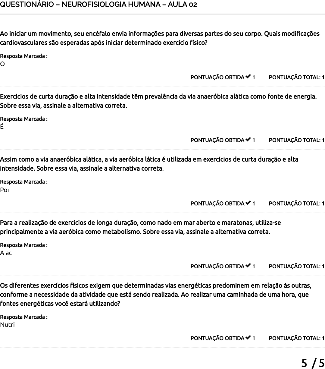 5 / 5 QUESTIONÁRIO – NEUROFISIOLOGIA HUMANA – AULA 02 PONTUAÇÃO TOTAL: 1PONTUAÇÃO OBTIDA 1 Ao iniciar um movimento, seu encéfalo envia informações para diversas partes do seu corpo. Quais modi�cações cardiovasculares são esperadas após iniciar determinado exercício físico? Resposta Marcada : Os músculos que estão atuando no exercício físico aumentam de forma signi�cativa o recebimento de sangue. PONTUAÇÃO TOTAL: 1PONTUAÇÃO OBTIDA 1 Exercícios de curta duração e alta intensidade têm prevalência da via anaeróbica alática como fonte de energia. Sobre essa via, assinale a alternativa correta. Resposta Marcada : É uma via que utiliza o fosfato de creatina. PONTUAÇÃO TOTAL: 1PONTUAÇÃO OBTIDA 1 Assim como a via anaeróbica alática, a via aeróbica lática é utilizada em exercícios de curta duração e alta intensidade. Sobre essa via, assinale a alternativa correta. Resposta Marcada : Por meio da NADH, o piruvato é convertido em lactato. PONTUAÇÃO TOTAL: 1PONTUAÇÃO OBTIDA 1 Para a realização de exercícios de longa duração, como nado em mar aberto e maratonas, utiliza-se principalmente a via aeróbica como metabolismo. Sobre essa via, assinale a alternativa correta. Resposta Marcada : A acetilcoenzima A (acetil-CoA) é crucial para o ciclo do ácido cítrico. PONTUAÇÃO TOTAL: 1PONTUAÇÃO OBTIDA 1 Os diferentes exercícios físicos exigem que determinadas vias energéticas predominem em relação às outras, conforme a necessidade da atividade que está sendo realizada. Ao realizar uma caminhada de uma hora, que fontes energéticas você estará utilizando? Resposta Marcada : Nutrientes do fígado e tecido adiposo podem contribuir para essa via energética. Total de Pontos