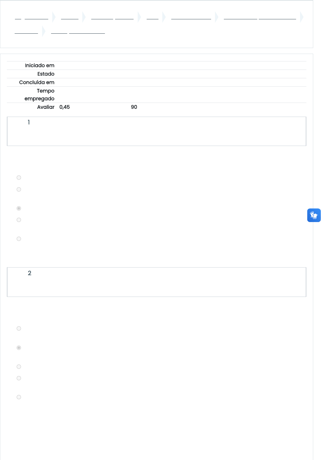 25/09/2023 21:26 Avaliação - Unidade I: Revisão da tentativa https://ambienteonline.uninga.br/mod/quiz/review.php?attempt=2222809&cmid=535136 1/4 Página inicial Cursos GRADUAÇÃO EAD 2023 Módulo 2 - 2023 2023/2 - Terapia Nutricional I UNIDADE I Avaliação - Unidade I Iniciado em sexta, 30 jun 2023, 19:24 Estado Finalizada Concluída em sexta, 30 jun 2023, 20:07 Tempo empregado 43 minutos 19 segundos Avaliar 0,45 de um máximo de 0,50(90%) Questão 1 Completo Atingiu 0,00 de 0,05 Questão 2 Completo Atingiu 0,05 de 0,05 Analise as alternativas abaixo quanto aos objetivos e métodos da avaliação nutricional e assinale a correta: a. Tem como objetivo identificar os transtornos alimentares, por meio do consumo alimentar. b. O exame físico e avaliação global subjetiva são métodos subjetivos, que não são utilizados na avaliação nutricional. c. Nenhuma correta. d. A antropometria é a medida do tamanho corpóreo e suas proporções, sendo o peso e a estatura as únicas medidas utilizadas por este método. e. Tem como objetivo identificar os distúrbios nutricionais, possibilitando uma intervenção adequada, utilizando a antropometria, a composição corpórea, parâmetros bioquímicos e o consumo alimentar. Assinale a alternativa incorreta: a. As orientações durante uma correta educação nutricional auxiliam na prevenção de doenças, proteção e promoção de uma vida saudável. b. Não é papel do nutricionista dar apoio emocional, tal função deve ser feita durante acompanhamento psicológico. c. O nutricionista possui função de conselheiro nutricional. d. O nutricionista deve dar apoio nutricional, determinando os comportamentos a serem modificados na vida do paciente. e. Ao ser um conselheiro nutricional, o nutricionista visa facilitar mudanças de comportamento em seus pacientes. https://ambienteonline.uninga.br/ https://ambienteonline.uninga.br/course/index.php https://ambienteonline.uninga.br/course/index.php?categoryid=1 https://ambienteonline.uninga.br/course/index.php?categoryid=1213 https://ambienteonline.uninga.br/course/index.php?categoryid=1438 https://ambienteonline.uninga.br/course/view.php?id=19087 https://ambienteonline.uninga.br/course/view.php?id=19087§ion=3 https://ambienteonline.uninga.br/mod/quiz/view.php?id=535136 25/09/2023 21:26 Avaliação - Unidade I: Revisão da tentativa https://ambienteonline.uninga.br/mod/quiz/review.php?attempt=2222809&cmid=535136 2/4 Questão 3 Completo Atingiu 0,05 de 0,05 Questão 4 Completo Atingiu 0,05 de 0,05 Questão 5 Completo Atingiu 0,05 de 0,05 Com relação à prescrição dietética, assinale a alternativa correta: a. O equilíbrio entre o consumo de nutrientes e os requerimentos nutricionais não influenciam no estado nutricional. b. Quando se consomem os nutrientes adequados para satisfazer às necessidades diárias do corpo, incluindo qualquer demanda metabólica aumentada, o indivíduo jamais se aproxima de um estado nutricional ideal. c. A ingestão adequada promove o crescimento e o desenvolvimento, mantém a saúde geral, sustenta as atividades da vida diária e ajuda a proteger o corpo contra doenças e enfermidades. d. Mesmo que seja possível realizar uma avaliação nutricional em qualquer indivíduo, as ferramentas ideais são idênticas para os indivíduos sadios e os que estão com estado nutricional crítico. e. As necessidades e nutrientes não são influenciados pela genética. Com relação ao estado de deficiência ou excesso nutricional, assinale a alternativa correta: a. Assim que a ingestão se torna deficiente, o organismo de acomoda às alterações na oferta de nutrientes, reduzindo a função, o tamanho ou o estado dos compartimentos afetados do corpo. b. Quando as reservas nutricionais estão depletadas ou a ingestão é inadequada para satisfazer as necessidades metabólicas diárias, desenvolve-se um estado de equilíbrio nutricional. c. O excesso nutricional não é capaz de gerar maléficos, além da obesidade. d. A ingestão de nutrientes corresponde aos requerimentos para a saúde ideal de um indivíduo. e. Quando se desenvolvem deficiências ou excessos, promovem-se adaptações para alcançar um novo estado estável, com várias perdas importantes na função fisiológica. Com relação aos fatores que estão envolvidos na avaliação do consumo alimentar do paciente, assim como no planejamento de uma dieta individualizada, assinale a alternativa incorreta: a. O fator educacional através das crendices e tabus alimentares não deve ser levado em consideração. b. A história alimentar do paciente e o conhecimento das alterações provocadas por alguma patologia devem ser levadas em consideração. c. Deve-se procurar alimentos e preparações compatíveis com os hábitos do paciente e condições clínicas ou cirúrgicas. d. Não existe apenas um único padrão de dieta, considerada ideal para uma determinada patologia. O que deve existir é um padrão ideal para cada paciente em casa situação. e. Deve-se atentar para as preferências e aversões, intolerâncias e alergias, horário de refeições, procurando correlacioná-los com a realidade do paciente. 25/09/2023 21:26 Avaliação - Unidade I: Revisão da tentativa https://ambienteonline.uninga.br/mod/quiz/review.php?attempt=2222809&cmid=535136 3/4 Questão 6 Completo Atingiu 0,05 de 0,05 Questão 7 Completo Atingiu 0,05 de 0,05 Questão 8 Completo Atingiu 0,05 de 0,05 De acordo com a finalidade terapêutica, as dietas podem ser modificadas, essas modificações não incluem: a. Mudança na consistência da dieta. b. Ajustes na qualidade sensorial. c. Eliminação de algum alimento. d. Redução ou aumento do valor energético da dieta. e. Redução ou aumento da quantidade de nutrientes consumidos. Desenvolver um relacionamento estreito com o paciente, criando confiança a longo prazo, é de extrema importância, devendo avaliar vários itens, exceto: a. Evitar sobrecarga de informações. b. Não ser atencioso n