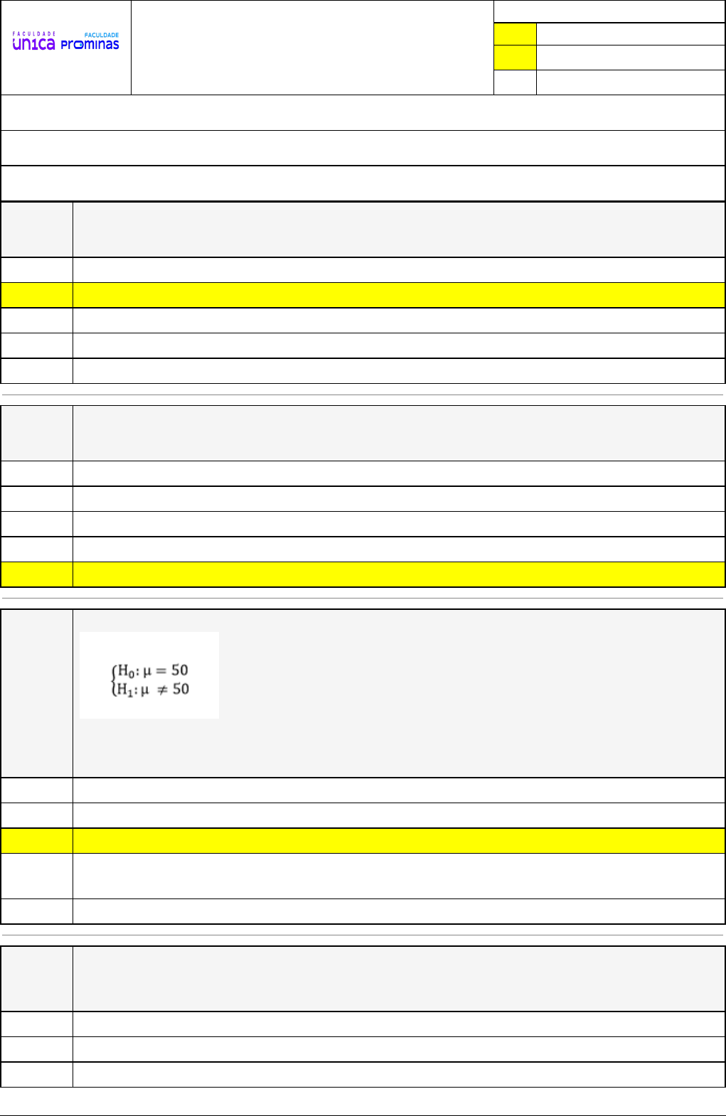 Pincel Atômico - 23/12/2023 15:05:56 1/3 ISIS CANÇADO VAZ Avaliação Online (SALA EAD) Atividade finalizada em 15/08/2023 09:13:16 (1083722 / 1) LEGENDA Resposta correta na questão # Resposta correta - Questão Anulada X Resposta selecionada pelo Aluno Disciplina: PROBABILIDADE E ESTATÍSTICA [486088] - Avaliação com 10 questões, com o peso total de 50,00 pontos [capítulos - Todos] Turma: Graduação: ENGENHARIA DE PRODUÇÃO - Grupo: SETEMBRO/2022 - ENGPROD/SET22 [69966] Aluno(a): 91345059 - ISIS CANÇADO VAZ - Respondeu 9 questões corretas, obtendo um total de 45,00 pontos como nota [355514_5129 4] Questão 001 Suponha que, em uma caixa, haja 3 bolas brancas, 5 bolas pretas e 2 bolas azuis. Se uma única bola for retirada ao acaso, qual a probabilidade de que seja azul ou preta? 60% X 70% 65% 55% 75% [355514_1883 42] Questão 002 Uma variável “X” segue uma distribuição normal com média igual a 10 e desvio-padrão igual a 4. Assim, calcule a probabilidade desta variável assumir um valor maior que 15. 25,51% 15,32% 18,37% 19,53% X 10,56% [355514_1883 86] Questão 003 Considere o seguinte teste de hipóteses: Se o nível de significância é de 5% (ou seja, α = 0,05) e o p-valor igual a 0,01, assinale a alternativa correta. O valor da significância deve ser dividido por 32. Nada pode ser afirmado com este teste. X Devemos aceitar H Não há evidência suficiente para afirmarmos que a média populacional seja menor que 50. Trata-se de um teste bilateral. [355514_1883 79] Questão 004 Uma amostra de 36 elementos apresenta média igual a 150 e desvio padrão igual a 127. Sendo assim, calcule uma estimativa para média populacional e assinale a alternativa correta. 175 127 235 Pincel Atômico - 23/12/2023 15:05:56 2/3 210 X 150 [355514_1883 80] Questão 005 Uma amostra de 169 elementos apresenta desvio padrão igual a 26. Calcule uma estimativa do desvio padrão da distribuição amostral. 9 4 X 2 7 5 [355515_5129 3] Questão 006 Suponha que a probabilidade de uma pessoa se atrasar para um voo seja 25% (0,25). Assim, qual a probabilidade de 3 pessoas estarem atrasadas num grupo de 5 pessoas? 5,1% X 8,8% 4,4% 1,3% 3,4% [355515_5125 2] Questão 007 Considere o seguinte conjunto de dados referente às notas finais de 36 alunos de uma determinada turma: 34 40 41 60 63 65 69 71 73 75 75 77 79 81 81 83 84 85 88 89 89 90 91 91 92 94 95 95 96 97 97 97 98 98 100 100 Ao construir uma tabela de frequências para representar estes dados, podemos afirmar que: X a frequência acumulada da última classe será igual a 36. o intervalo de classes será igual a 15. a tabela terá 5 classes. a frequência relativa da segunda classe será igual 10. a frequência de primeira classe será igual a 6. [355515_5131 9] Questão 008 Suponha que os gestores de uma empresa afirmem que a média de salário de seus funcionários é igual a R$ 5.000,00. Para confirmar (ou não) esta afirmação um pesquisador seleciona uma amostra e verifica que a média amostral é igual R$ 4.200,00. Neste caso, assinale a alternativa correta no que se refere à hipótese nula em um teste de hipóteses realizado por ele > 4200 = 4200 Pincel Atômico - 23/12/2023 15:05:56 3/3 = 5000 X = 4500 < 4200 [355516_5124 3] Questão 009 Sabe-se a que o tamanho de uma amostra se relaciona com o tamanho do universo e com a margem de erro da seguinte forma: Entretanto, para universos muito grandes , essa relação pode ser escrita da seguinte forma: Sendo “n” o tamanho da amostra, “N” o tamanho do universo e “E” a margem de erro. Sendo assim, assinale a alternativa verdadeira no que se refere à relação entre o tamanho da amostra e o tamanho do universo. X Quando o tamanho do universo é muito grande, o tamanho da amostra depende apenas da margem de erro. Não existe um limite para o tamanho da amostra, mesmo que o tamanho do universo cresça indefinidamente Quanto maior o tamanho do universo, maior será o tamanho da amostra, independente de quão grande seja o universo Quanto maior o tamanho do universo, menor será o tamanho da amostra. Essa relação é linear. [355516_5123 9] Questão 010 Suponha que um professor deseje realizar uma pesquisa com os alunos de uma universidade. Sabendo que esta universidade possui 3.000 alunos e que o professor pretende selecionar uma amostra utilizando uma margem de erro de 5%, quantos alunos este professor deverá selecionar? Aproximadamente 125 alunos Aproximadamente 800 alunos. Aproximadamente 2.000 alunos. X Aproximadamente 353 alunos Aproximadamente 1.343 alunos