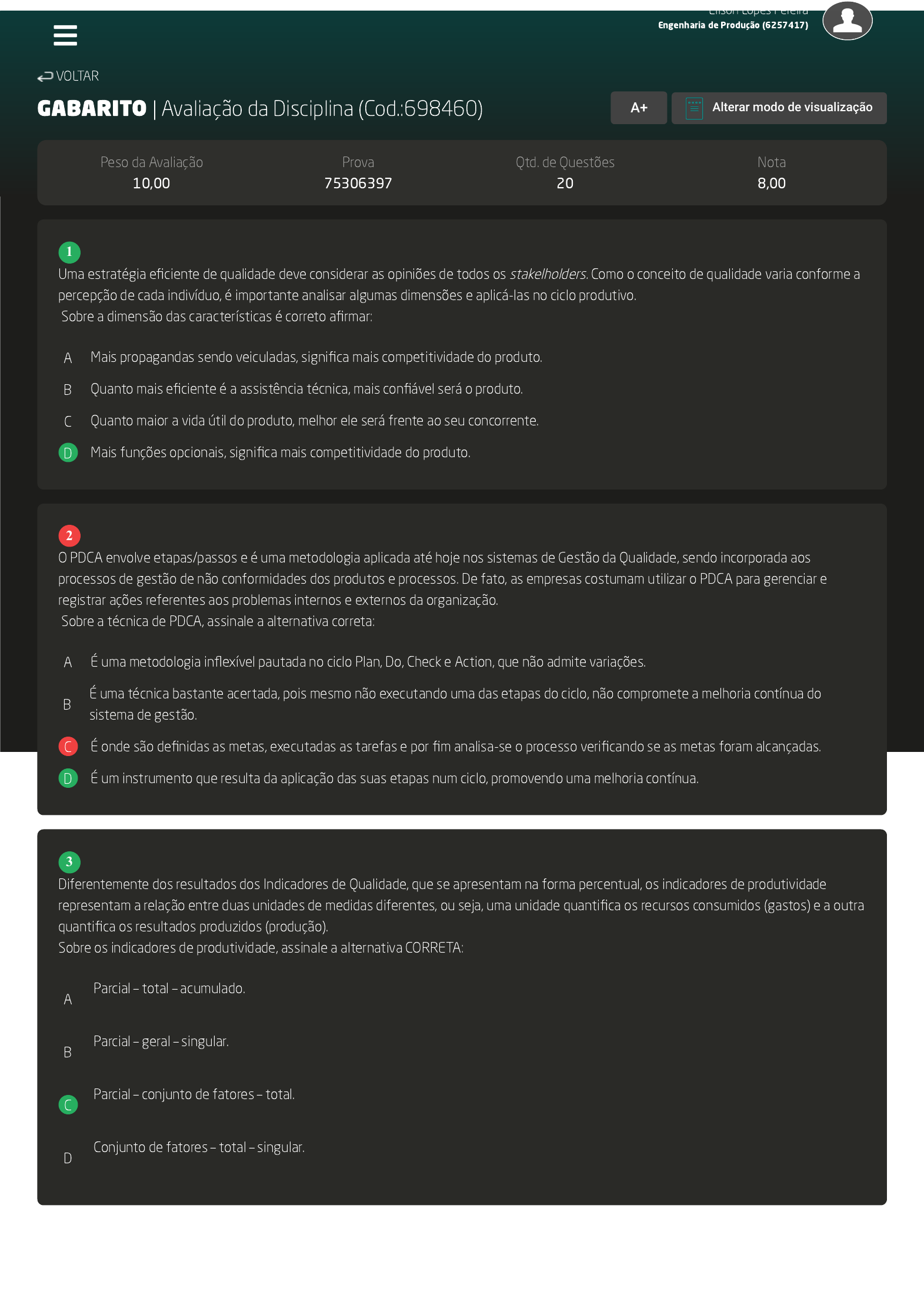 24/12/23, 13:22 AVA https://ava2.uniasselvi.com.br/subject/grades-and-tests/answer-book/eyJ0ZXN0Ijp7InRlc3RDb2RlIjoiNjk4NDYwIiwiZGVzY3JpcHRpb24iOiJBdmFsaWHDp8OjbyBkYSBEaXNjaXBsaW5hIiwicGFyYW1ldGVyIjpudWxs… 1/7 GABARITO | Avaliação da Disciplina (Cod.:698460) Peso da Avaliação 10,00 Prova 75306397 Qtd. de Questões 20 Nota 8,00 Uma estratégia eficiente de qualidade deve considerar as opiniões de todos os stakelholders. Como o conceito de qualidade varia conforme a percepção de cada indivíduo, é importante analisar algumas dimensões e aplicá-las no ciclo produtivo. Sobre a dimensão das características é correto afirmar: A Mais propagandas sendo veiculadas, significa mais competitividade do produto. B Quanto mais eficiente é a assistência técnica, mais confiável será o produto. C Quanto maior a vida útil do produto, melhor ele será frente ao seu concorrente. D Mais funções opcionais, significa mais competitividade do produto. O PDCA envolve etapas/passos e é uma metodologia aplicada até hoje nos sistemas de Gestão da Qualidade, sendo incorporada aos processos de gestão de não conformidades dos produtos e processos. De fato, as empresas costumam utilizar o PDCA para gerenciar e registrar ações referentes aos problemas internos e externos da organização. Sobre a técnica de PDCA, assinale a alternativa correta: A É uma metodologia inflexível pautada no ciclo Plan, Do, Check e Action, que não admite variações. B É uma técnica bastante acertada, pois mesmo não executando uma das etapas do ciclo, não compromete a melhoria contínua do sistema de gestão. C É onde são definidas as metas, executadas as tarefas e por fim analisa-se o processo verificando se as metas foram alcançadas. D É um instrumento que resulta da aplicação das suas etapas num ciclo, promovendo uma melhoria contínua. Diferentemente dos resultados dos Indicadores de Qualidade, que se apresentam na forma percentual, os indicadores de produtividade representam a relação entre duas unidades de medidas diferentes, ou seja, uma unidade quantifica os recursos consumidos (gastos) e a outra quantifica os resultados produzidos (produção). Sobre os indicadores de produtividade, assinale a alternativa CORRETA: A Parcial – total – acumulado. B Parcial – geral – singular. C Parcial – conjunto de fatores – total. D Conjunto de fatores – total – singular. VOLTAR A+ Alterar modo de visualização 1 2 3 Elison Lopes Pereira Engenharia de Produção (6257417) 24/12/23, 13:22 AVA https://ava2.uniasselvi.com.br/subject/grades-and-tests/answer-book/eyJ0ZXN0Ijp7InRlc3RDb2RlIjoiNjk4NDYwIiwiZGVzY3JpcHRpb24iOiJBdmFsaWHDp8OjbyBkYSBEaXNjaXBsaW5hIiwicGFyYW1ldGVyIjpudWxs… 2/7 A produção enxuta utiliza várias concepções antigas e quebra o padrão da produção em massa, sendo preparado para atender as mudanças do mercado, se tornando mais eficiente, ágil e flexível. A produção enxuta visa ampliar os lucros, baixando os custos empregados na produção e diminuindo o desperdício. Sobre a produção enxuta, analise as seguintes sentenças: I – O desperdício pode ser descrito como a aplicação de um recurso sem que haja retorno. II – Visa uma produção voltada para a real demanda do mercado e o estoque zero ou reuzido. III – Pode ser aplicada em várias áreas da indústria e em todos os setores da organização. IV – Na área administrativa, a produção enxuta recebe o nome de Hoshin Office, e já é possível verificar resultados positivos dessa adaptação. Assinale a alternativa que apresenta a resposta correta: A As sentenças I, III e IV estão corretas. B As sentenças I, II e III estão corretas. C As sentenças II, III e IV estão corretas. D As sentenças I, II e IV estão corretas. A ISO 9001 tem como objetivo melhorar a gestão da empresa e pode ser aplicada em conjunto com outras normas de funcionamento, como normas de saúde ocupacional, meio ambiente e segurança. Através dela uma organização melhora a prestação de serviço ao cliente, possibilitando o melhoramento do mecanismo de entrega. Além disso, também é usada para medir o nível de satisfação dos clientes, melhorando a eficácia da gestão da empresa. SIGNIFICADOS. Significado de ISO 9001. Disponível em: . Acesso em: 01 jun. 2016. Nesse contexto, analise a seguinte asserção-razão: A ISO 9001 certifica que a linha de produção ou a empresa respeita os requisitos da norma na questão de gestão de qualidade. PORQUE Trata-se de uma certificação auditada por um organismo sem vínculos com a empresa pleiteadora. Assinale a alternativa que apresenta a resposta correta: A As duas afirmativas são verdadeiras, e a segunda justifica a primeira. B A primeira afirmativa é falsa, porém a segunda é verdadeira. C As duas afirmativas são verdadeiras, mas a segunda não justifica a primeira. D A primeira afirmativa é verdadeira, porém a segunda é falsa. O Controle Estatístico do Processo (CEP) é uma coleção de ferramentas que auxilia na diminuição da variabilidade do processo e permite o alcance de um processo estável cuja capabilidade pode ser melhorada. RIBEIRO, J. L.; CATEN, C. T. Controle estatístico do processo. Porto Alegre: UFRGS, 1998 (adaptado). Sobre o CEP e suas ferramentas estatísticas, assinale V para verdadeiro e F para falso nas afirmações que seguem: ( ) As ferramentas estatísticas mais utilizadas são média, mediana e desvio padrão, cuja finalidade é avaliar os dados em torno de uma tendência central. ( ) O CEP proporciona um monitoramento minucioso e efetivo do processo de produção antes do produto acabado. ( ) A ferramenta estatística apresenta os pontos que fogem do padrão e aponta se há dependência entre as variáveis. ( ) O trabalho das ferramentas estatísticas, por si só são capazes de coletar as informações necessárias para a análise do processo. Assinale a alternativa que apresenta a sequência correta de respostas: A F – F – F – 