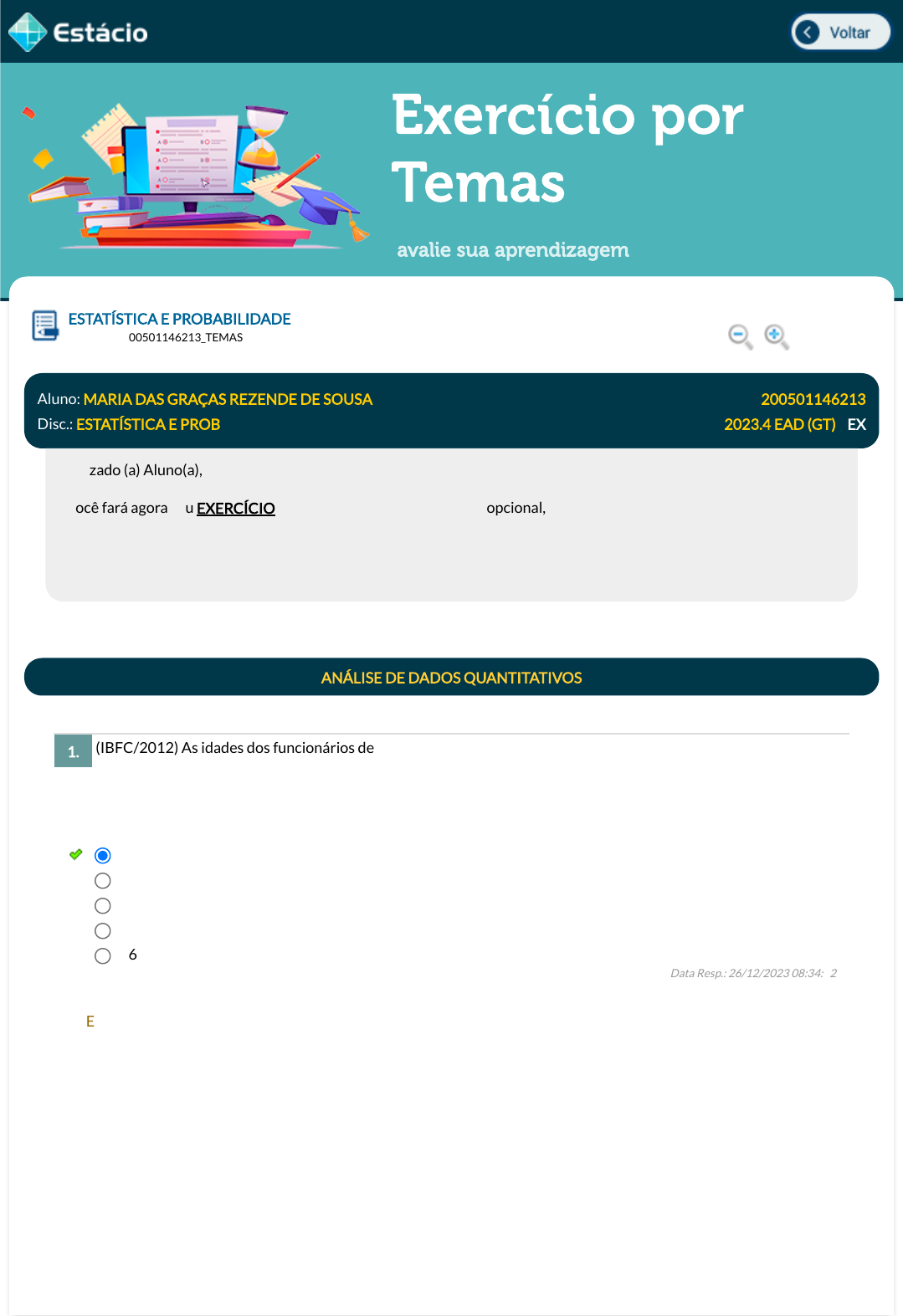 26/12/23, 08:34 Estácio: Alunos https://simulado.estacio.br/alunos/ 1/3 Exercício por Temas avalie sua aprendizagem (IBFC/2012) As idades dos funcionários de uma empresa são apresentadas abaixo: 23 - 32 - 47 - 35 - 28 - 19 - 33 - 35 - 21 - 27 - 26 - 33 A amplitude total dos dados apresentados é de: ESTATÍSTICA E PROBABILIDADE Lupa DGT0012_200501146213_TEMAS Aluno: MARIA DAS GRAÇAS REZENDE DE SOUSA Matr.: 200501146213 Disc.: ESTATÍSTICA E PROB 2023.4 EAD (GT) / EX Prezado (a) Aluno(a), Você fará agora seu EXERCÍCIO! Lembre-se que este exercício é opcional, mas não valerá ponto para sua avaliação. O mesmo será composto de questões de múltipla escolha. Após responde cada questão, você terá acesso ao gabarito comentado e/ou à explicação da mesma. Aproveite para se familiarizar com este modelo de questões que será usado na sua AV e AVS. ANÁLISE DE DADOS QUANTITATIVOS 1. 28 27 10 47 26 Data Resp.: 26/12/2023 08:34:22 Explicação: Para calcular a amplitude total dos dados, é necessário encontrar a diferença entre o maior e o menor valor da lista de idades. Maior valor: 47 Menor valor: 19 Amplitude total = Maior valor - Menor valor Amplitude total = 47 - 19 Amplitude total = 28 Portanto, a amplitude total dos dados apresentados é de 28. javascript:voltar(); javascript:voltar(); javascript:voltar(); javascript:voltar(); javascript:diminui(); javascript:diminui(); javascript:aumenta(); javascript:aumenta(); 26/12/23, 08:34 Estácio: Alunos https://simulado.estacio.br/alunos/ 2/3 Em uma pesquisa sobre salários de funcionários de uma empresa, foram coletados os seguintes valores mensais: R$ 3.000, R$ 3.500, R$ 4.200, R$ 4.800 e R$ 25.000. Após a análise inicial, o professor identi�cou um valor que pode ser considerado um outlier. Qual dos seguintes é o valor que mais provavelmente representa um outlier? (IMA/2017 - Adaptada) Variáveis são características de interesse em um estudo qualquer. Assinale a alternativa que apresenta o conceito de variável quantitativa discreta: Determine a mediana das seguintes observações: 17, 12, 9, 23, 14, 6, 3, 18, 42, 25, 18, 12, 34, 5, 17, 20, 7, 8, 21, 13, 31, 24, 9. 2. R$25.000 R$3.500 R$4.200 R$3.000 R$4.800 Data Resp.: 26/12/2023 08:34:25 Explicação: Outlier se refere a um valor atípico em relação ao restante do conjunto de dados. No contexto da pesquisa sobre salários de funcionários, é importante identi�car valores que estejam muito acima ou muito abaixo da faixa usual de salários, pois podem indicar situações incomuns ou erros nos dados. Entre os valores fornecidos, R$ 25.000 é o valor que mais provavelmente representa um outlier, pois está muito acima dos demais salários. O professor espera que os alunos saibam reconhecer que um salário tão elevado em comparação com os outros valores é uma indicação de um possível valor atípico. Portanto, a resposta correta é a alternativa R$ 25.000. 3. É aquela que expressa o valor de uma contagem, por exemplo, idade, quantidade de televisores numa casa, quantidade de habitantes de uma cidade. É aquela que separa os indivíduos em classes, porém não é possível estabelecer uma ordem, por exemplo, sexo (masculino e feminino) e esporte praticado (futebol, basquete, ciclismo¿). É aquela que expressa uma medida como um valor real, por exemplo, peso e altura. É aquela que separa os indivíduos em classes com uma determinada ordem, por exemplo, nível de escolaridade: fundamental, médio e superior. É aquela que não representa uma ordem natural, por exemplo, nomes, estado civil, sexo. Data Resp.: 26/12/2023 08:34:28 Explicação: Uma variável quantitativa discreta é aquela que assume valores numéricos inteiros e representam uma contagem ou quantidade de algo. Os exemplos mencionados (idade, quantidade de televisores numa casa, quantidade de habitantes de uma cidade) são variáveis quantitativas discretas, pois são expressas por valores numéricos inteiros que representam uma contagem. 4. 14,5 13,5 14 15,5 17 Data Resp.: 26/12/2023 08:34:30 26/12/23, 08:34 Estácio: Alunos https://simulado.estacio.br/alunos/ 3/3 (IDECAN/2022) Observe o grá�co do tipo boxplot ou diagrama de caixas abaixo e assinale a opção correta a partir do que é mostrado: Explicação: Resposta correta: 17 Para determinar a mediana das observações, precisamos primeiro organizar os números em ordem crescente: 3, 5, 6, 7, 8, 9, 9, 12, 12, 13, 14, 17, 17, 18, 18, 20, 21, 23, 24, 25, 31, 34, 42 Agora, para encontrar a mediana, precisamos encontrar o valor central. Como temos 23 observações, o valor central estará na posição (23 + 1) / 2 = 12. Portanto, a mediana é o 12º número na lista, que é igual a 17. Portanto, a mediana das observações fornecidas é 17 5. O 2º quartil está abaixo de 28. O 3º quartil está acima de 34. O limite superior está acima de 36. Não temos outliers abaixo do limite inferior. O 1º quartil está abaixo de 24. Data Resp.: 26/12/2023 08:34:33 Explicação: Outliers, ou valores atípicos, são observações que se afastam signi�cativamente do padrão esperado em um conjunto de dados. Esses valores são considerados extremos ou incomuns em relação aos demais valores da amostra ou população. Na imagem, temos outliers no limite superior. Não Respondida Não Gravada Gravada Exercício por Temas inciado em 26/12/2023 08:34:20.