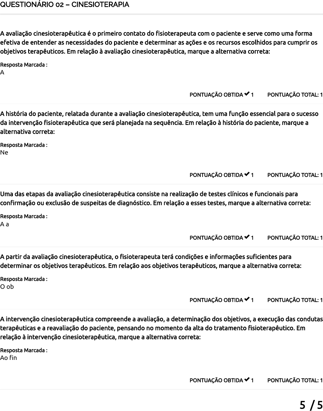 26/12/2023, 11:00 Course Status – AVA Saúde Unifaveni https://ava.saude.unifaveni.com.br/course-status/ 1/1 5 / 5 QUESTIONÁRIO 02 – CINESIOTERAPIA PONTUAÇÃO TOTAL: 1PONTUAÇÃO OBTIDA 1 A avaliação cinesioterapêutica é o primeiro contato do �sioterapeuta com o paciente e serve como uma forma efetiva de entender as necessidades do paciente e determinar as ações e os recursos escolhidos para cumprir os objetivos terapêuticos. Em relação à avaliação cinesioterapêutica, marque a alternativa correta: Resposta Marcada : A avaliação permitirá identi�car dé�cits importantes que estejam relacionados com a disfunção e, a partir disso, planejar a intervenção �sioterapêutica. PONTUAÇÃO TOTAL: 1PONTUAÇÃO OBTIDA 1 A história do paciente, relatada durante a avaliação cinesioterapêutica, tem uma função essencial para o sucesso da intervenção �sioterapêutica que será planejada na sequência. Em relação à história do paciente, marque a alternativa correta: Resposta Marcada : Nesse momento da avaliação, o �sioterapeuta deve obter o máximo de informações possíveis que possam estar relacionadas com as queixas do paciente. PONTUAÇÃO TOTAL: 1PONTUAÇÃO OBTIDA 1 Uma das etapas da avaliação cinesioterapêutica consiste na realização de testes clínicos e funcionais para con�rmação ou exclusão de suspeitas de diagnóstico. Em relação a esses testes, marque a alternativa correta: Resposta Marcada : A avaliação da amplitude de movimento ativa e passiva é um exemplo desses testes. PONTUAÇÃO TOTAL: 1PONTUAÇÃO OBTIDA 1 A partir da avaliação cinesioterapêutica, o �sioterapeuta terá condições e informações su�cientes para determinar os objetivos terapêuticos. Em relação aos objetivos terapêuticos, marque a alternativa correta: Resposta Marcada : O objetivo a longo prazo será o principal guia dos demais objetivos, isto é, de curto e médio prazo. PONTUAÇÃO TOTAL: 1PONTUAÇÃO OBTIDA 1 A intervenção cinesioterapêutica compreende a avaliação, a determinação dos objetivos, a execução das condutas terapêuticas e a reavaliação do paciente, pensando no momento da alta do tratamento �sioterapêutico. Em relação à intervenção cinesioterapêutica, marque a alternativa correta: Resposta Marcada : Ao �nal da intervenção cinesioterapêutica, todos os objetivos terapêuticos deverão ter sido atingidos e o paciente deverá estar completamente recuperado. Total de Pontos