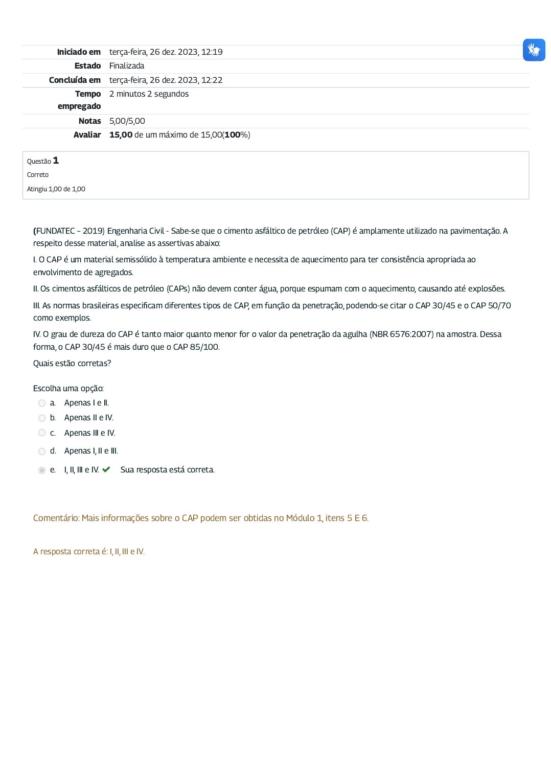 26/12/2023, 12:26 Exercício avaliativo - Módulo 1: Revisão da tentativa https://mooc41.escolavirtual.gov.br/mod/quiz/review.php?attempt=975376&cmid=26338 1/4 Iniciado em terça-feira, 26 dez. 2023, 12:19 Estado Finalizada Concluída em terça-feira, 26 dez. 2023, 12:22 Tempo empregado 2 minutos 2 segundos Notas 5,00/5,00 Avaliar 15,00 de um máximo de 15,00(100%) Questão 1 Correto Atingiu 1,00 de 1,00 (FUNDATEC – 2019) Engenharia Civil - Sabe-se que o cimento asfáltico de petróleo (CAP) é amplamente utilizado na pavimentação. A respeito desse material, analise as assertivas abaixo: I. O CAP é um material semissólido à temperatura ambiente e necessita de aquecimento para ter consistência apropriada ao envolvimento de agregados. II. Os cimentos asfálticos de petróleo (CAPs) não devem conter água, porque espumam com o aquecimento, causando até explosões. III. As normas brasileiras especi�cam diferentes tipos de CAP, em função da penetração, podendo-se citar o CAP 30/45 e o CAP 50/70 como exemplos. IV. O grau de dureza do CAP é tanto maior quanto menor for o valor da penetração da agulha (NBR 6576:2007) na amostra. Dessa forma, o CAP 30/45 é mais duro que o CAP 85/100. Quais estão corretas? Escolha uma opção: a. Apenas I e II. b. Apenas II e IV. c. Apenas III e IV. d. Apenas I, II e III. e. I, II, III e IV. Sua resposta está correta. Comentário: Mais informações sobre o CAP podem ser obtidas no Módulo 1, itens 5 E 6. A resposta correta é: I, II, III e IV. 26/12/2023, 12:26 Exercício avaliativo - Módulo 1: Revisão da tentativa https://mooc41.escolavirtual.gov.br/mod/quiz/review.php?attempt=975376&cmid=26338 2/4 Questão 2 Correto Atingiu 1,00 de 1,00 (CESPE – 2016) Engenharia Civil - No que se refere aos ensaios físicos dos cimentos asfálticos, que podem ser categorizados como ensaios de consistência, de durabilidade, de pureza e de segurança, assinale a opção correta. Escolha uma opção: a. Os valores do ponto de fulgor, ensaio ligado à segurança e manuseio do CAP, são determinados por meio do picnômetro. b. O ensaio de penetração fornece uma medida empírica da temperatura na qual o asfalto muda de consistência quando aquecido e atinge uma determinada condição de escoamento. c. A viscosidade é uma medida da consistência do cimento asfáltico, por resistência ao escoamento, e pode ser determinada em laboratório por meio do ensaio de película delgada rotacional. d. O ponto de amolecimento é dado pelo alongamento, em centímetros, obtido antes da ruptura de uma amostra de CAP, na seção diminuída do molde com largura inicial de 10 mm, em banho de água a 25 ºC, submetida pelos dois extremos à velocidade de deformação de 5 cm/minuto. e. O envelhecimento dos ligantes asfálticos está relacionado aos mecanismos de perda de componentes voláteis e oxidação e pode ser simulado por meio do ensaio de estufa de �lme �no sob o efeito do calor e do ar. Sua resposta está correta. Comentário: O Ponto de Fulgor é um ensaio ligado à segurança de manuseio do asfalto durante o transporte, estocagem e usinagem e representa a menor temperatura em que os vapores emanados durante o aquecimento do material asfáltico se in�amam por contato a uma chama padronizada. O ensaio de Penetração mede a consistência do asfalto utilizado no Brasil para a classi�cação dos CAPs. A penetração é a profundidade, em décimos de milímetros, que uma agulha de massa padronizada (100g) penetra numa amostra de volume padronizado de ligante, num tempo de cinco segundos na temperatura de 25 ºC. A viscosidade pode ser medida por meio do viscosímetro Saybolt Furol ou utilizando um viscosímetro rotacional. O ensaio do ponto de amolecimento determina a temperatura na qual o asfalto amolece quando é aquecido em condições padronizadas. A resposta correta é: O envelhecimento dos ligantes asfálticos está relacionado aos mecanismos de perda de componentes voláteis e oxidação e pode ser simulado por meio do ensaio de estufa de �lme �no sob o efeito do calor e do ar. 26/12/2023, 12:26 Exercício avaliativo - Módulo 1: Revisão da tentativa https://mooc41.escolavirtual.gov.br/mod/quiz/review.php?attempt=975376&cmid=26338 3/4 Questão 3 Correto Atingiu 1,00 de 1,00 Questão 4 Correto Atingiu 1,00 de 1,00 (FCC-2015) Auditoria - Para determinar o grau de pureza do asfalto (teor de betume), é realizado o ensaio de: Escolha uma opção: a. Espuma. b. Ductibilidade. c. Durabilidade. d. Ponto de fulgor. e. Solubilidade. Sua resposta está correta. Comentário: O ensaio de solubilidade é realizado dissolvendo uma amostra de asfalto em solvente, sendo então �ltrada através de um cadinho perfurado que é ligado ao topo de um frasco ligado ao vácuo. A fração solúvel é o constituinte ativo do ligante asfáltico. Dessa forma, o ensaio determina o grau de pureza do asfalto (teor de betume). A resposta correta é: Solubilidade. (FGV-2021) Um dos materiais mais utilizados na pavimentação asfáltica é o cimento asfáltico de petróleo (CAP). Uma característica importante desse tipo de cimento é: Escolha uma opção: a. Permeabilidade à água, sendo úteis em serviços de drenagem. b. Viscosidade muito baixa, que não pode ser modi�cada. c. Invariabilidade das suas propriedades de consistência. d. Associação da temperatura a todas as suas propriedades físicas. Sua resposta está correta. e. Ponto de amolecimento a temperaturas superiores a 200 °C. Comentário: O CAP é impermeável, com viscosidade e propriedades alteradas com a variação da temperatura. O CAP 30/45 apresenta o ponto de amolecimento mais elevado, de 52ºC. A resposta correta é: Associação da temperatura a todas as suas propriedades físicas. 26/12/2023, 12:26 Exercício avaliativo - Módulo 1: Revisão da tentativa https://mooc41.escolavirtual.gov.br/mod/quiz/review.php?attempt=975376&cmid=26338 4/4 Questão 5 Correto Atingiu 1,00 de 1,00 Assinale a alternativ